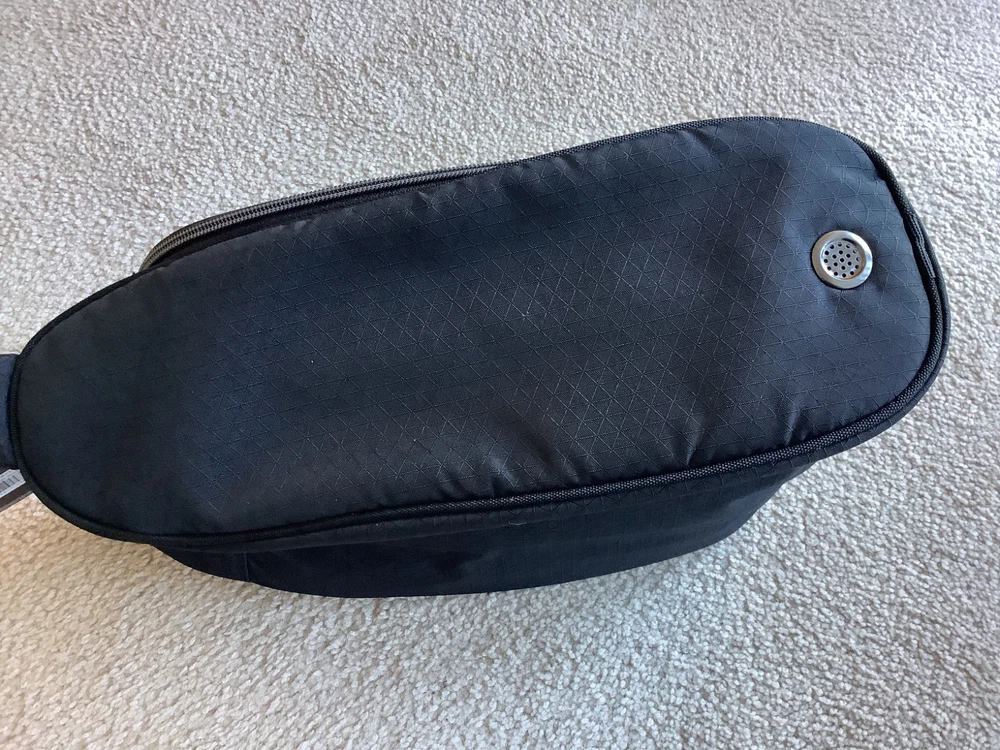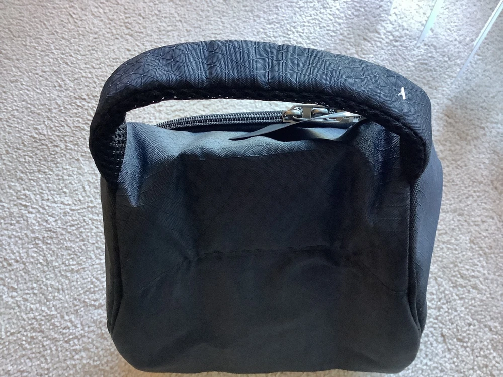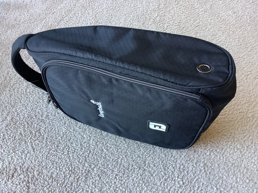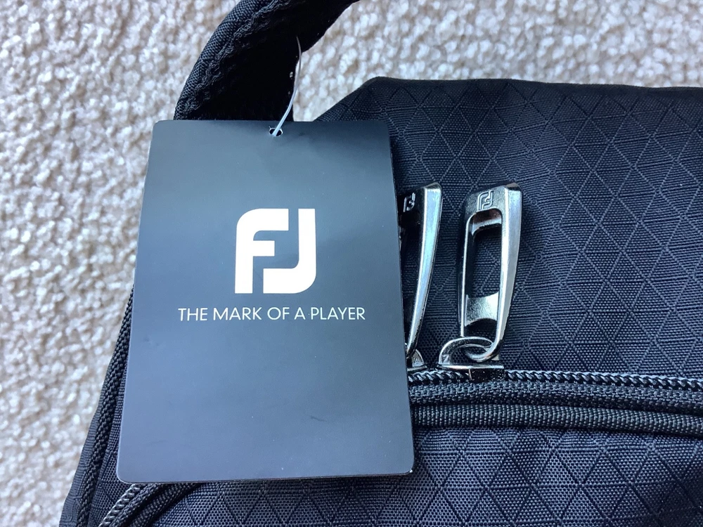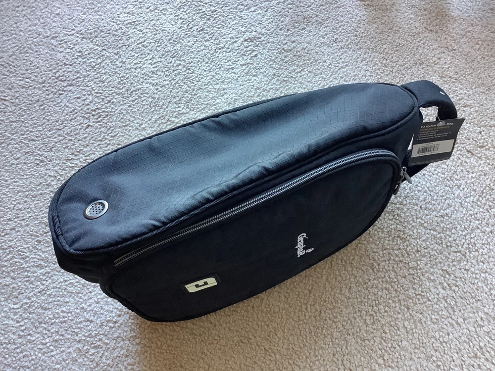 New FJ Footjoy Nylon Black Golf Shoe Bag,Graybar embroidered logo, Vented , padded , DIMENSIONS = 5” H X 10” W X 15” D, accommodates up to size 16, self Cary handle,excellent condition.