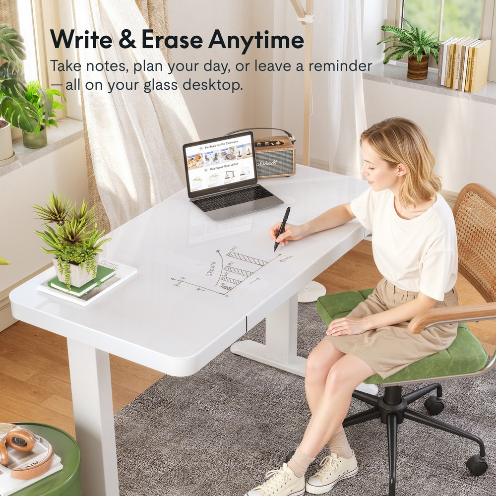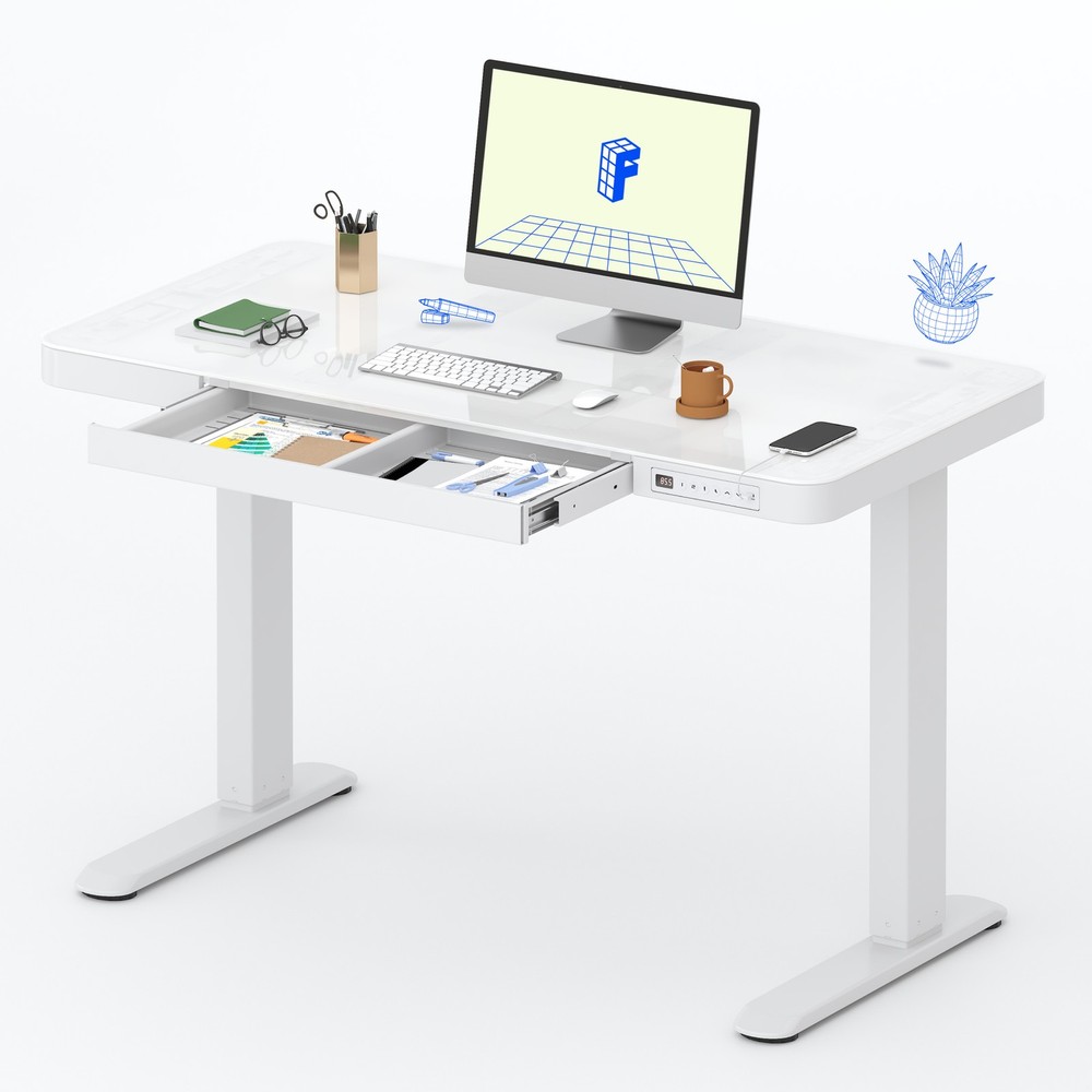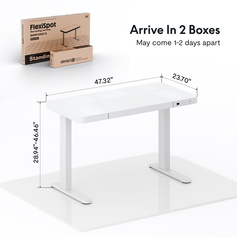 Home Payment Shipping Return Policy About Us Contact Us Feedback Title Other Standing Desk Desk Riser & Desk Converters Desk Bike Ergonomic Office Chair Fitness Upgrade your workspace with FlexiSpot electric height adjustable standing desk featuring a powerful motor for smooth transitions from 28.9” to 46.5” at the touch of a button. The sleek tempered glass desktop offers a modern look with rounded edges for added safety and durability. Designed for convenience, the desk includes four programmable height presets, a child lock, built-in USB-A and USB-C charging ports, and a hidden pull-out storage drawer to keep your workspace organized. With a 110 lb weight capacity, this standing desk is ideal for home offices, study rooms, and modern workspaces. (Note: Clamping monitor arms are not recommended for glass desktops.) Electric Height Adjustment: Switch from sitting to standing in seconds! Our standing desk features a robust motor that enables smooth, easy transitions from 28.9" to 46.5"(with 2.6” thickness of table top included) with the press of a button, and a weight capacity of up to 110 lbs. Tempered Glass Table Top: Work in style on a modern tempered glass desk top finished with rounded edges for superior safety, comfort, durability, and elegance. Do not use Clamping Monitor Arm on the Glass top. Embedded Multiple Functions: Easily save multiple with four programmable height presets, a child lock button helps prevent accidental touch. Charge up to three devices with integrated USB ports (Type-C output: 5V3A/9V2.2A/12V1.67A,MAX20W) without mess & hassle. (Note: USB ports may pause charging while adjusting desk height, Laptop charging is not supported) Convenient Storage Drawer: A convenient pull-out drawer embedded in the desktop provides seamless integrated storage space for your home office supplies. The modern design blends in perfectly with the rest of the structure while keeping your belongings out of sight and neatly put away! Please Note: Avoid using a clamping monitor arm on the glass top to prevent damage. For safe transport, the glass desktop and frame are shipped in separate packages, which may arrive on different days. Specifications: Color: Glass+white Item Weight: 70.55 LBS Weight Capacity: 110 LBS Product Dimensions: 24.33"D x 47.95"W x 29"H Number of Drawers: 1 Base Material: Metal Style: Modern Room Type: Bedroom, Study Room, dressing room Recommended Uses For Product: Office, Working, Writing Special Feature: Electric Height Adjustment, Built-In Type-C Charging Port, Anti-Collision Safety System, Compartmentalized Drawer