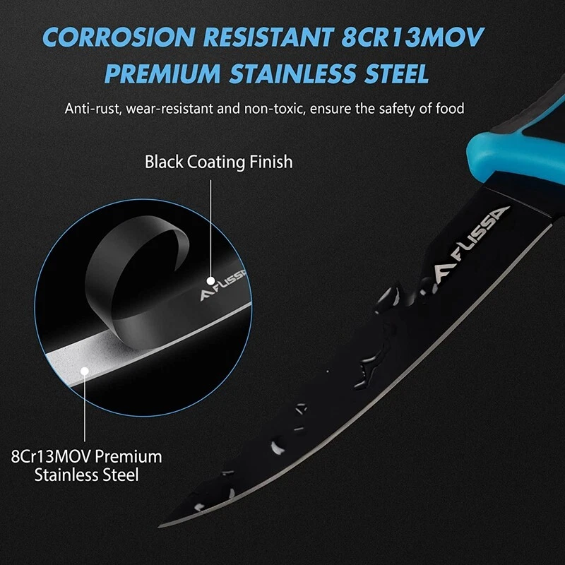 Product Description Dimensions - Flissa fishing fillet knife set includes 4PC fillet knives, portable pouch, knife sharpener. Overall Length: 11"-15"; Blade Length: 5"-9"; Blade Thickness: 0.07" (1.8mm); Handle length: 6", Weight: 4.59oz-6oz Durability & Razor Sharp - Blade is made of 8CR13MOV Premium stainless steel, Only 1.8 mm thick makes it as sharp as a razor, black coating finish gives it anti-rust, wear-resistant and non-toxic, ensure the safety of food Ventilation Design - Flissa fillet knife is equipped with a skeleton design portable protective sheath that makes draining easy, keeps knives dry and sharp, and greatly extends knife life Ergonomic Handle - The ergonomic design provides a comfortable grip, reduces hand fatigue, and is very maneuverable without slipping even in wet conditions Wide Applicat ion - Flissa bait knife is a good partner for your fishing, also suitable for camping, hunting, and kitchen, while a perfect gift for people who love fishing and cooking Brand FLISSA Special Feature Non Slip Age Range (Description) Adult Handle Material Stainless Steel Blade Material Stainless Steel Blade Shape Clip Point Belt Clip Belt clip for convenient carrying Skeleton Design Ventilation design makes draining easy, keeps knives dry and sharp Lanyard Hole Provide more carrying method than belt clip, free your hands Sharpener Support you to quickly sharpen your knife at any time and place, keep fillet knives sharp at all times