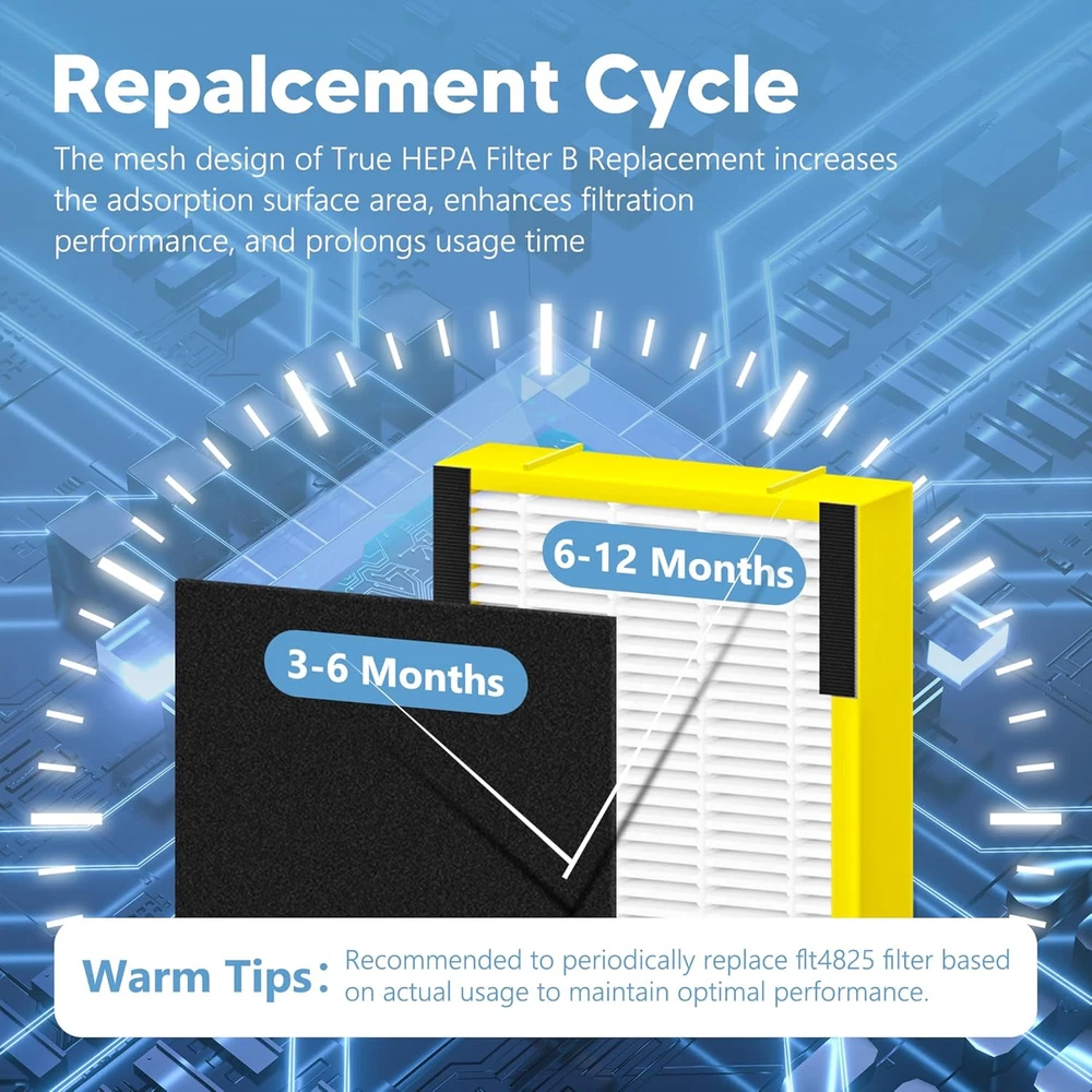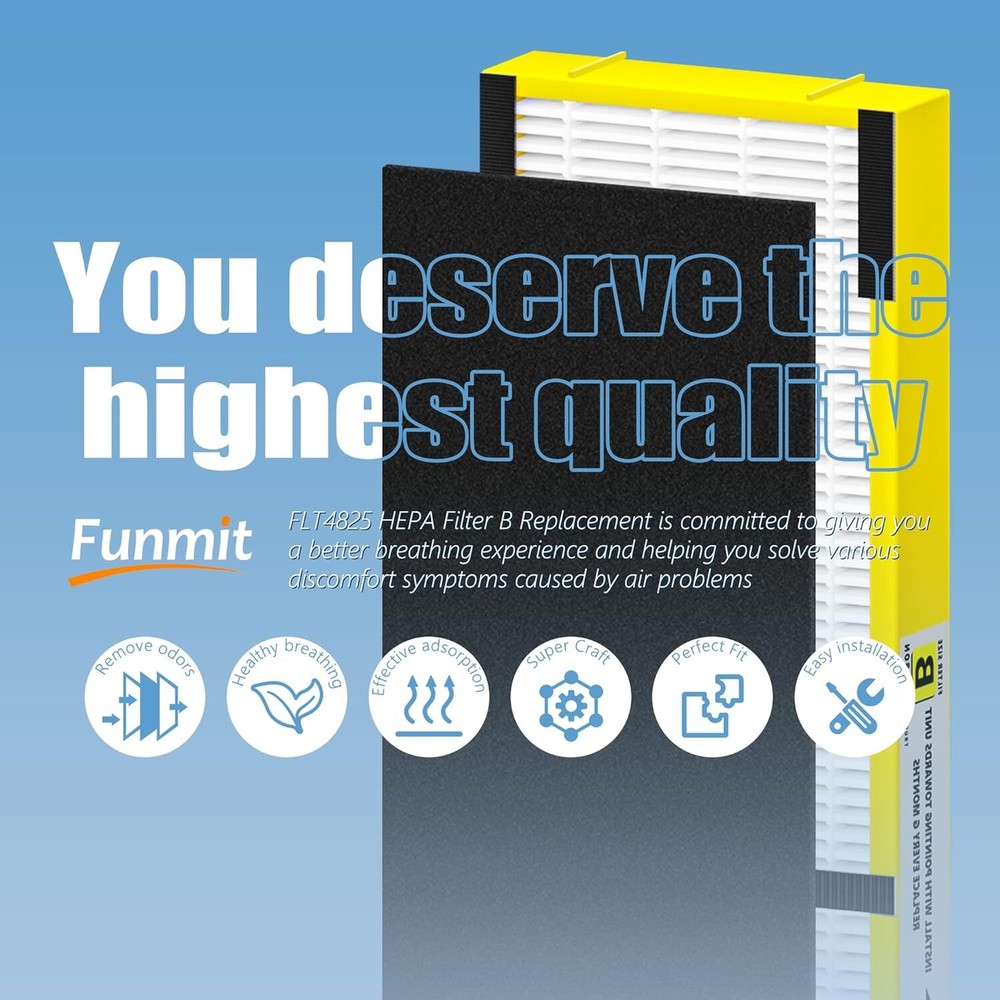 FLT4825 HEPA Filter B Replacement for AC4825, AC4300, AC4900, Yellow Product Details Package Dimensions: 16.02 x 6.46 x 5.24 inches Item Weight: 2.16 pounds Manufacturer: Funmit Item model number: FLT4825 Batteries required: No Brand: Funmit Material: Activated Carbon MERV Rating: 17 Compatible Devices: AC4825, AC4300, AC4900, AC4825DLX, AC4850, CDAP4500, AP2200, Black+Decker BXAP148 Air Purifier Number of Items: 12 Product Grade: new Unit Count: 1.0 Count - Funmit FLT4825 hepa filter b replacement set is designed exclusively compatible with AC4825, AC4300, AC4800, AC4900, AC4850, AP2200CA and Black+Decker BXAP148 Air Purifier. Replacement for FLT4825 HEPA Filter B. NOTE: This is not a OEM product. Any use of the brand name or model designation for this product is made solely for purposes of demonstrating compatibility - Enjoy fresh air all-year-round with Funmit FLT4825 Replacement Filter to ease uncomfortable symptoms caused by problematic air. The H13 true hepa filter works alongside high-efficiency activated carbon filter to take out 99.97% of the airborne substance as small as 0.03 microns and decomposes unpleasant household odors and wildfire gases effectively, keeping your living environment air fresh - - Package includes 4 x H13 True HEPA Filter and 8 x Activated Carbon Filter. HEPA Filter Dimensions: H: 15-7/10" x L: 4-1/2" x W: 1-3/10", Carbon Filter Dimensions: H: 15-7/10" x L: 4-1/2" x W: 1/5". We recommend you to replace hepa filter every 6-8 months and pre filter every 2-3 months for optimal performance. Easy to replace and disposable, no tools required. Simply take out and replace from your machine unit when needed - Funmit adhere to provide all customers with a simple, streamlined shopping experience of large appliance replacement parts, and prove that we have the highest quality parts and service out there. We stand by our products, and our customers are our focus as a business. If you have any quality problem, please contact Funmit customer service team in time, and we will try our best to solve your problems