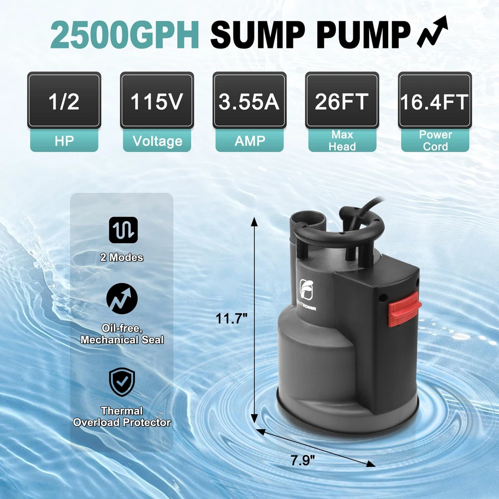 AUTOMATIC MODE: Once the sump pump is plugged in, it will automatically start when the water level is above 4" and shut off when it reaches the stop level of 2". When you start to use this pump, tilt and submerge it in water for a few seconds to expel the air inside MANUAL MODE: If the water level is not high enough to start in auto mode or you want to remove water as low as possible (1/5"), you can switch to manual control. The pump will keep running continuously and will not turn off automatically, so remember to cut off the power immediately to prevent the motor from burning out POWERFUL PERFORMANCE: 1/2 HP POWERFUL MOTOR ensures effective pumping. The pump has a maximum capacity of transferring water up to 2500 GPH with 1-1/2" discharge hose horizontally. It can lift water up to a maximum vertical height of 26'. This submersible pump works with clean water or slightly dirty water, and its bottom grid allows it to pass up to 1/5" solids SAFETY ENSURE & RELIABLE: UPGRADED SEALING STRUCTURE gives pump longer durability, which is much longer than regular mechanical seal. Full corrosion-resistant shell and THERMAL PROTECTION ensures the pump will not be burned out, even when the pump triggers thermal overload protector, the pump will rework after cooling down EASY INSTALLATION: Comes with three plastic adapters: GHT 3/4"+NPT 1" connects standard garden hose for quick installation; G 1-1/2" discharge port connects discharge hose for high capacity pumping WIDELY APPLICATION: Pump also comes with a 16.4-foot long cable cord and a 26-foot nylon rope, which allows the pump to submerge deep enough in the water. Ideal for heavy-duty draining applications including pools, ponds, pits, wells, ditches, basements, etc BUY WITH CONFIDENT: This pump is designed for multi applications and emergency use, like flooding basement, garden pond, hot tub, and so on. Provide lifelong technical consultation and 24h customer service