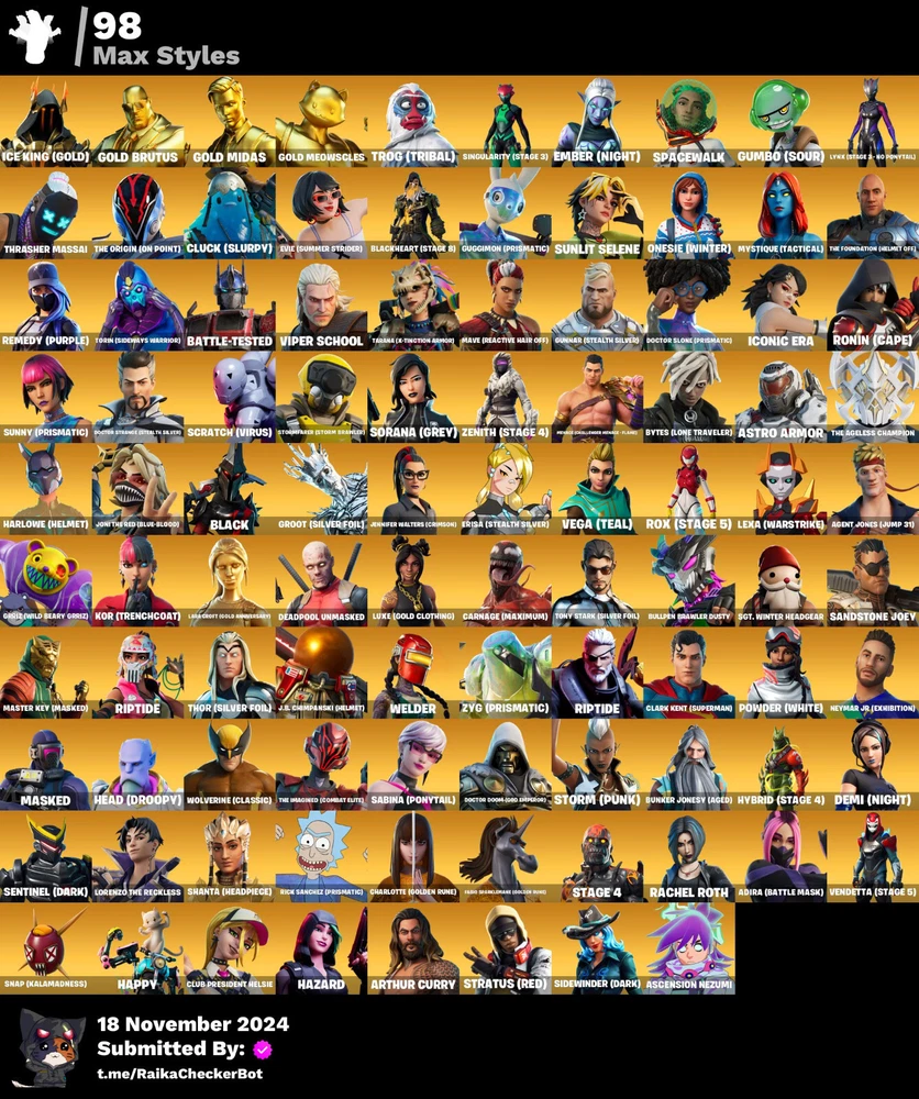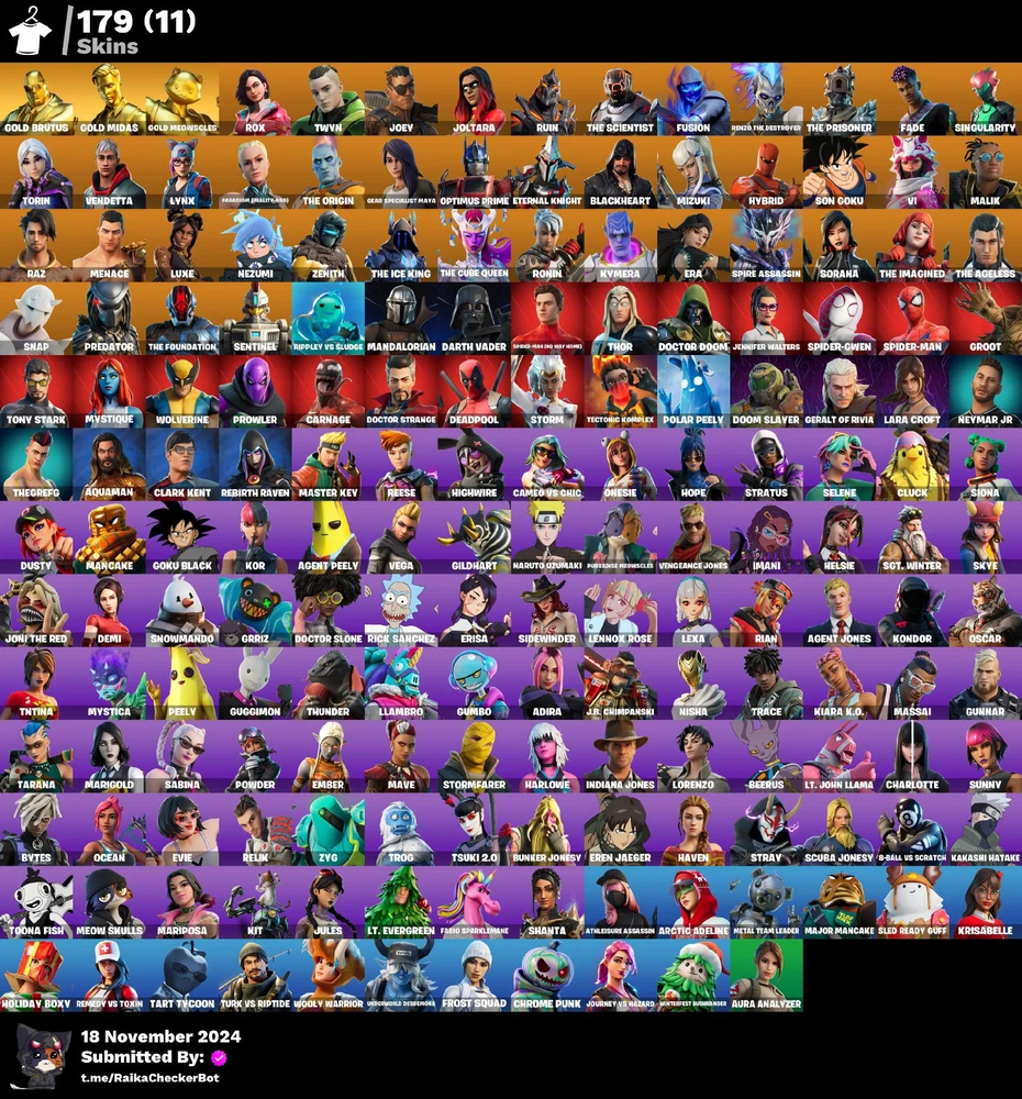 🎮FN Lara Croft, Midas,Spider-Gwen, Carnage.Clark, Rick, Naruto 179 Skins✅