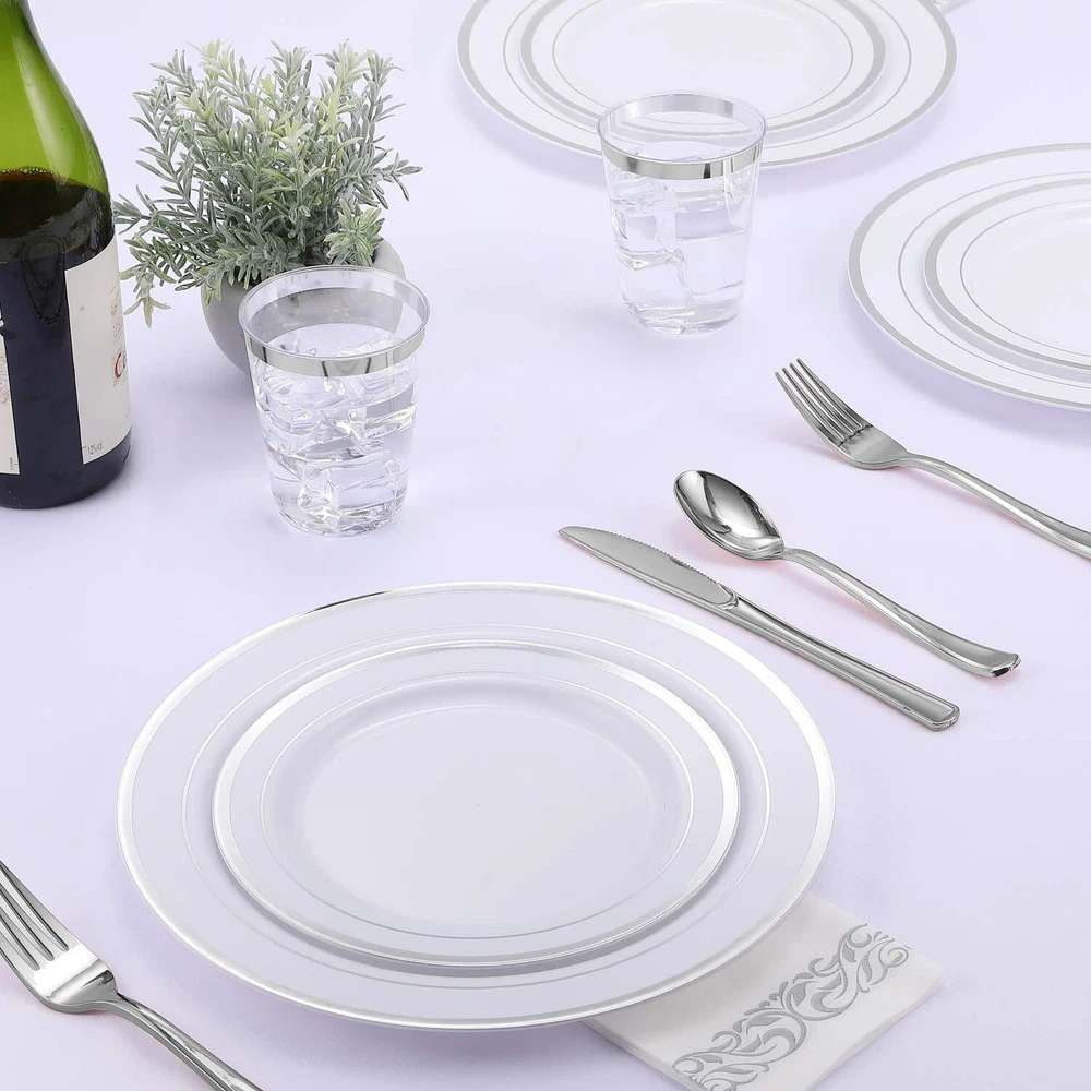 FOCUSLINE 175pcs Silver Dinnerware Set for 25 Guests, White Plastic Plates with Silver Rim, Including 25 Disposable Dinner Plates, 25 Dessert Plates, 25 Silverware Set, 25 Cups, 25 Napkins Silver Dinnerware Set is safe for you and your guests! Disposable dinnerware set is made of 100% food-grade plastic, BPA free. The Heavy Duty dinner plates and salad plates offer reliable strength and durability, ensure won't scratch or break easily Premium quality decorative silver rim disposable dinnerware set made to save your time and energy, just toss the dinnerware when you’re done, no clean-up is necessary 25 Premium Heavy Duty Disposable 10" Silver Rim Dinner Plates And 25 7" Salad Dessert Appetizer Plates - Disposable Plastic Silver Silverware Set 25 Plastic Forks, 25 Plastic Spoons, 25 Plastic Knives 25 Count 10 Oz Clear Fancy Disposable Silver Rimmed Plastic Party Cups - 25 Count Soft and Absorbent Disposable Paper Napkins Ideal for Halloween, Christmas, Thanksgiving, Weddings, Formal Dinners, Birthday Parties, Graduations, Anniversaries, Festivals, Picnics, Catered Events, and All Occasions Shipping We offer FREE shipping on all orders! We ship within Three business days of payment, usually sooner. We use a selection of shipping services such as UPS, FedEx, USPS etc. We only ship to the lower 48 states, no APO/FPO addresses or PO Boxes allowed. Local pickups and combined shipping options are not provided at this time. Return You can return a product for up to 30 days from the date you purchased it. Any product you return must be in the same condition you received it and in the original packaging. Please keep the receipt. Payment We accept payment by any of the following methods: PayPal Please pay as soon as possible after winning an auction, as that will allow us to post your item to you sooner! Feedback Customer satisfaction is very important to us. If you have any problem with your order, please contact us and we will do our best to make you satisfied. Contact Us If you have any queries, please contact us via ebay. We usually respond within 24 hours on weekdays. Please visit our eBay store to check out other items for sale! Thank you for shopping at our store.