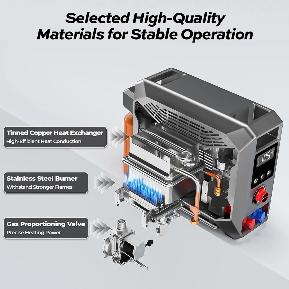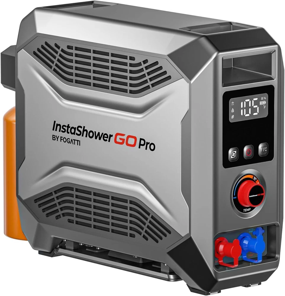 Specification Series: InstaShower GO Pro BTU: 22000 Battery: Rechargable (5000mAh ) Run Time (Full Charge): 80 Mins Charging Time: 4 Hours Wattage: 6.5 KW Maximum Flow Rate: 3.5 Liters Per Minute Voltage: 12 Volts (DC) Gas Supply Pressure: 11" W.C. (2.74kPa) High Temperature Control: 125 ℉ Ignition: Electric Ignition Product Dimensions: 18.2" X 6.5" X 13.5" Fuel Source: Propane Gas Connector Size: 1"-20UNEF Water Pump: 2 meters long, 30W, 8L/min Showerhead: 3 spray patterns Special Features: Portable, Digital Display, Lightweight, Overheat Protection, Tip-Over Protection Accessories: Water pump, showerhead, shower hose, magnetic base shower hook, 12V cigarette lighter power line, battery charger(120 VAC/60 Hz), Propane adapter hose, Pet shower sprayer About this item 【 Portable Shower System 】FOGATTI InstaShower GO Pro is a compact and portable shower system designed for outdoor use. Heated by propane, it provides hot water in seconds for showering, washing dishes, cleaning hands, and other tasks. It is lightweight and easy to store, making it an ideal companion for camping, hiking, and other outdoor adventures. 【 Easy Access to Hot Water 】With a heating output of 22,000 BTU, the InstaShower GO Pro Water Heater heats up fast within 8 seconds, and it can output 3.5 liters of hot water per minute. Set the temperature you need with the knob. The maximum temperature rise is 125°F. Innovative technology turns off the gas burner when water reaches 125°F to keep adults, kids, and pets safe from accidental scalds and burns. 【 Enjoy Showers Anytime, Anywhere 】The FOGATTI InstaShower GO Pro Portable Water Heater comes with a built-in 5000 mAh rechargeable battery, which eliminates the need for external power sources and can operate for 80 minutes on a full charge. This allows you to enjoy refreshing showers even at off-grid locations. It can also be charged by a 12V car cigarette lighter or a portable power station if you forget to recharge it, ensuring usability anywhere. *Please charge the battery for 4 hours at the first time to maximinize the performance of the battery. 【 All-in-one Solution 】The efficient brushless 12V pump with a 6.6 ft hose ensures reliable and consistent water pressure, delivering an enjoyable shower experience. Furthermore, the shower unit features an automatic ignition system for easy start-up and shut-down, allowing you to pause your shower without constantly turning the machine on and off, saving water and energy. The adjustable shower head with 3 spray pattern settings enables you to control the water flow according to your preference. A built-in gas regulator offers the flexibility to use either gas cartridges or gas cylinders via a hose (included). 【 Multi-Protections for Added Safety 】Besides overheat protection and flameout protection, the InstaShower GO Pro water heater is also equipped with tilt protection and dry burn protection. The flame will shut off if the tilt angle is too large or if it detects insufficient water flow. For added safety, the InstaShower GO Pro is constructed with flame-retardant materials, minimizing the risk of fire hazards. 【 Caution 】Exclusive for outdoor use. Not intended for residential or recreational vehicle purposes.