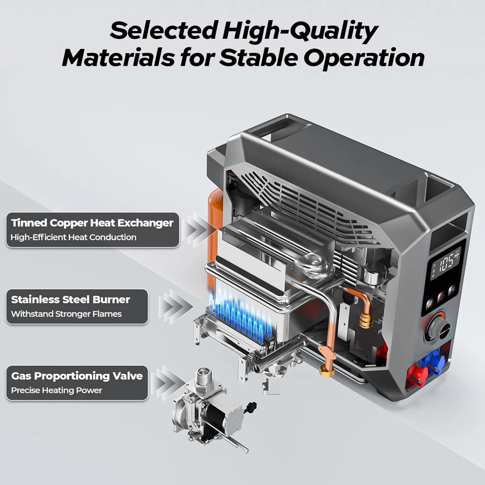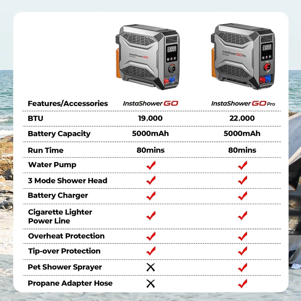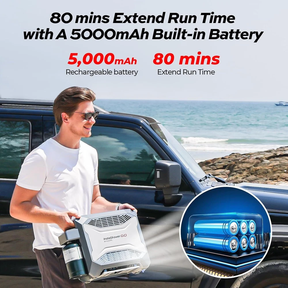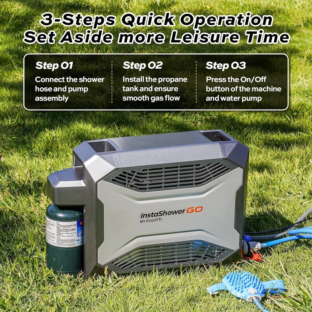 Specification Series: InstaShower GO BTU: 19000 Battery: Rechargable (5000mAh ) Run Time (Full Charge): 80 Mins Charging Time: 4 Hours Wattage: 5.5 KW Maximum Flow Rate: 3 Liters Per Minute Voltage: 12 Volts (DC) Gas Supply Pressure: 11" W.C. (2.74kPa) High Temperature Control: 125 ℉ Ignition: Electric Ignition Product Dimensions: 18.2" X 6.5" X 13.5" Fuel Source: Propane Gas Connector Size: 1"-20UNEF Water Pump: 2 meters long, 30W, 8L/min Showerhead: 3 spray patterns Special Features: Portable, Digital Display, Lightweight, Overheat Protection, Tip-Over Protection Accessories: Water pump, showerhead, shower hose, magnetic base shower hook, 12V cigarette lighter power line, battery charger(120 VAC/60 Hz) About this item 【 Portable Shower System 】FOGATTI InstaShower GO is a compact and portable shower system designed for outdoor use. Heated by propane, it provides hot water in seconds for showering, washing dishes, cleaning hands, and other tasks. It is lightweight and easy to store, making it an ideal companion for camping, hiking, and other outdoor adventures. 【 Easy Access to Hot Water 】With a heating output of 19,000 BTU, the InstaShower GO Water Heater heats up fast within 8 seconds, and it can output 3 liters of hot water per minute. Set the temperature you need with the knob. The maximum temperature rise is 125°F. Innovative technology turns off the gas burner when water reaches 125°F to keep adults, kids, and pets safe from accidental scalds and burns. 【 Enjoy Showers Anytime, Anywhere 】The FOGATTI InstaShower GO Portable Water Heater comes with a built-in 5000 mAh rechargeable battery, which eliminates the need for external power sources and can operate for 80 minutes on a full charge. This allows you to enjoy refreshing showers even at off-grid locations. It can also be charged by a 12V car cigarette lighter or a portable power station if you forget to recharge it, ensuring usability anywhere. *Please charge the battery for 4 hours at the first time to maximinize the performance of the battery. 【 All-in-one Solution 】The efficient brushless 12V pump with a 6.6 ft hose ensures reliable and consistent water pressure, delivering an enjoyable shower experience. Furthermore, the shower unit features an automatic ignition system for easy start-up and shut-down, allowing you to pause your shower without constantly turning the machine on and off, saving water and energy. The adjustable shower head with 3 spray pattern settings enables you to control the water flow according to your preference. 【 Multi-Protections for Added Safety 】Besides overheat protection and flameout protection, the InstaShower GO water heater is also equipped with tilt protection and dry burn protection. The flame will shut off if the tilt angle is too large or if it detects insufficient water flow. For added safety, the InstaShower GO is constructed with flame-retardant materials, minimizing the risk of fire hazards. 【 Caution 】Exclusive for outdoor use. Not intended for residential or recreational vehicle purposes.
