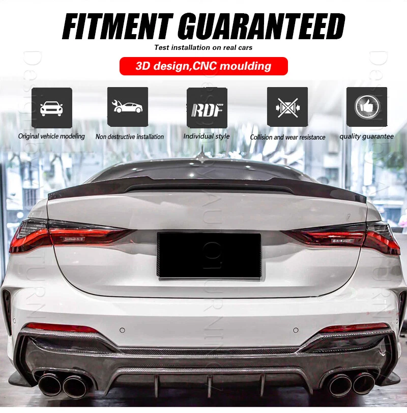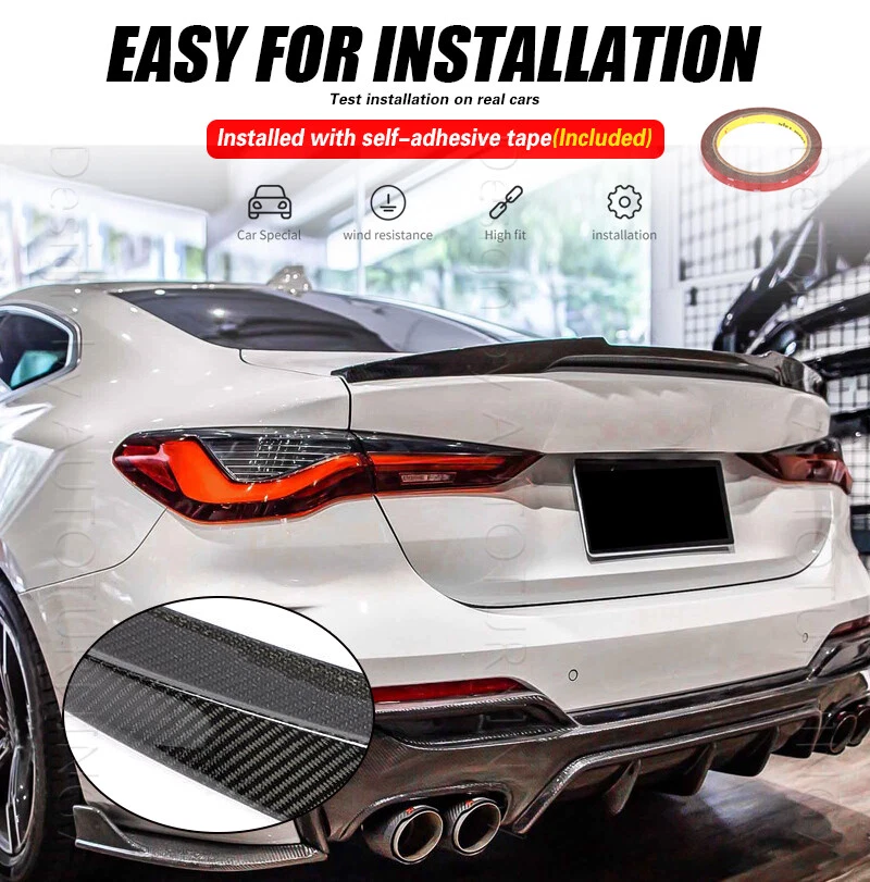 Fitment: Fits for BMW G22 4 Series 2 Door Coupe / G82 M4 2021-2024,NOT Fit 2 Door Convertible Or 4 Door Gran Coupe Models Specifications: Product Name: Rear Spoiler Material: Carbon Fiber Package Size:130x27x11 cm Package Weight:1.8kg Features: Made of High Quality Lightweight Carbon Fiber. Latest Design GT Wing Spoiler Completed Kit, Improve Handling And Make Tail More Stable in High Speed. Water Transfer Carbon Fiber for Highest Durability and Appearances. Adjustable Angles for Customizable Usages and Efficiencies, Enhances Aerodynamic. Reduces Drag, Increases Fuel Efficiency, Reinforces Downforce, Traction and Stability. Double-sided adhesive paste, Easy to Install. Package included: 1 x Spoiler with self-adhesive glue tape Carbon Fiber Spoiler FOR BMW The Rear Trunk Spoiler is one of the simplest mods you can do to the exterior of your car that will give your car that completely different look. Not only are spoilers meant for great looks, they also help with the aero dynamics of the car by lowering drag, or helping to put more downforce on the car making sure that the wheels stay grounded for maximum traction. Fitment: Fits for BMW G22 4 Series 2 Door Coupe / G82 M4 2021-2024, NOT Fit 2 Door Convertible Or 4 Door Gran Coupe Models Specifications: Product Name: Rear Spoiler Material: Carbon Fiber Package Size:130x27x11 cm Package Weight:1.8kg Features: Made of High Quality Lightweight Carbon Fiber. Latest Design GT Wing Spoiler Completed Kit, Improve Handling And Make Tail More Stable in High Speed. Water Transfer Carbon Fiber for Highest Durability and Appearances. Adjustable Angles for Customizable Usages and Efficiencies, Enhances Aerodynamic. Reduces Drag, Increases Fuel Efficiency, Reinforces Downforce, Traction and Stability. Double-sided adhesive paste, Easy to Install. Package included: 1 x Spoiler with self-adhesive glue tape Delivery details Payment and TAX Warranty Policy Return Policy Contact us Delivery details NOTE: The shipping fee is only for the mainland of each country, it does not include the overseas territories, such as Virgin Islands (U.S.) , Puerto Rico, Hawaii , French Reunion Island, etc. But on ebay, when buyers from Puerto Rico and overseas territories , the shipping fee is equal to United States, it is NOT correct,. please contact us for correct shipping fee, or we will cancel the order. Sorry for the inconvenience, and thanks for your cooperation. 1. If you want to upgrade the shipping, please contact us before making payment, we will revise the shipping fee. 2. We will ship according to your Ebay address. Please make sure it is correct and include phone number for delivery. If you want to know the exact shipping time , please contact us . Payment and TAX 1.We accept Multiple Payment Methods Available: Credit Card, Debit Card, Gift Card, Apple Pay, Goggle Pay, PayPal and PayPal Cred. 2.Please leave note for your special request (e.g. Colors or Size) in ebay note when you pay the order. 3.Your must complete the payment within 7 days or Ebay will automatically open unpaid item case For US Buyer:The invoice value of each item is less than 800USD ,so you no need to pay any tariff . NON-US Buyer Note: Most countries are tax free based on our invoices, if tax is required, which will be buyer's responsibility. Warranty Policy We Warranty Our Product Within the Limited Warranty Policy Specified on Ebay. Please Email us if ou have any question regarding the warranty policy on a specific item. Most of the items are Aftermarket Parts and they are intended for off-road usage only, therefore no installation instruction will be included, Professional installation are Highly Recommended. We are not responsible for any damages to the item or the vehicle that occur during the installation of the item.Also, Please Make Sure Proper Installation is Performed as we are not responsible for item being missing or flew off after the installation. if you don't think the item can stay on the car properly, please do not attempt to drive the car with it and please check with professional shops/mechanics or contact us for assistance. Return Policy We Accept Returns Within the Return Period On Ebay. Return Authorization/Return Approval is Required For Every Return. So If you Wish to Make a Return On Your Purchase. Please Contact us Before You Send The item back For any damages occured to the item upon arrival, Please notify us within 5 days of the delivery so we can take proper action to fix the issue. So Please Kindly inspect and check the item condition upon arrival.For Any other Return Inquries, You can contact us within the return period to obtain return authorization/return approval. In case of return, the merchandise needs to be returned in original condition with origi- nal packaging in order to be eligible for an exchange or a refund. Items must be not opened in their original package. Any mark of installation, mounting, cutting, scratch or using will not be allowed. Contact us 1.We are trying our best to explain all details of the products here! If you have any question, please feel free to contact us by Ebay message, and We will get back to you within 24-48 hours. 2.Customer satisfaction is our NO.1 priority. If you are not happy with the item that you purchase, please contact us first. We will try our best to solve the problem with you.Please leave us a positive feedback if you receive the item.Please do not leave negative or neutral feedback without any contact.If you haven't received item in 30 days, please contact us and we will arrange refund.We appreciate your business.Happy Bidding & Have a nice day! 3.Working hours: From 8 a.m. to 6 p.m. from Monday to Friday. From 8 a.m. to 12 a.m. on Saturday morning Holiday/Rest time: Saturday afternoon and Sunday