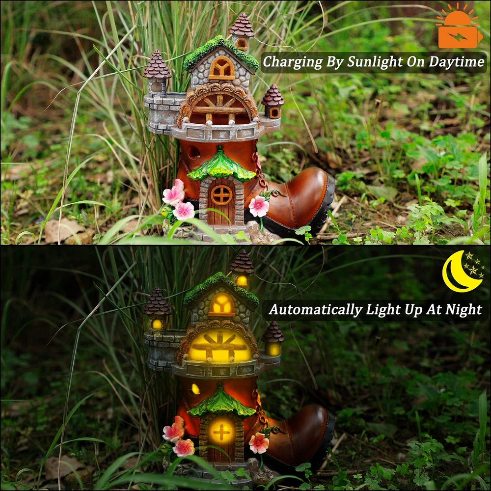 High Quality: This boot fairy house garden figurine is made of high quality resin material, finished with a UV resistant coating, dustproof and waterproof, can withstand rain, snow or scorching sun without cracking, fading or rusting. Solar Shoe House Garden Statue: This fairy house garden figurines are easy to use, simply turn on the power button before first use, leave it in the on position in the daytime, keep the solar panel under the sun to ensure sufficient sunlight, it will charge during the daylight hours and automatically light up at night for 8-10 hours. Adorable Fairy House Statue: This fairy house statue is painted with very nice details, a beautiful house was built on a discarded boot, lifelike steps, doors and windows, balconies, exquisitely carved with patterns, the warm light came out from the windows, the roof is covered with green moss, pink flower vines hovered over the boots, and the eaves made of lotus leaves are definitely bring coolness to the owner of the house in the hot summer! What a magical and beautiful fairy tale this is! Great Garden Decor: This fairy-tale shoe house statue is perfect as solar garden yard decorations, brighten up your backyard, lawn, pond, pool, window sills, countertops, entryways, it is a wonderful addition to your lawn and home decor. Warm Gifts: This fairy boot house garden figurines is 8.5 x 10 inch, suitable to use for garden, trees, flowers, fence, flowerbed, walkway decor, emit a romantic glow at night, adding a sense of mystery. This solar garden statue is fun for gift giving for your family and friends as birthdays gifts, Mothers Day gifts, holiday gifts, weddings gifts or housewarming gifts.