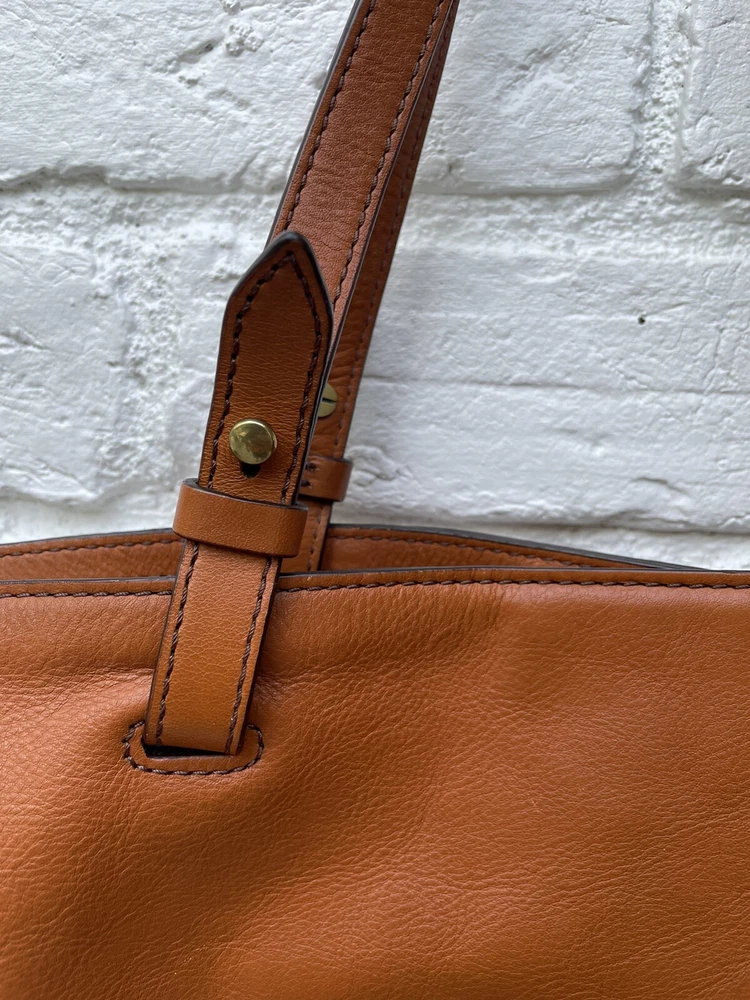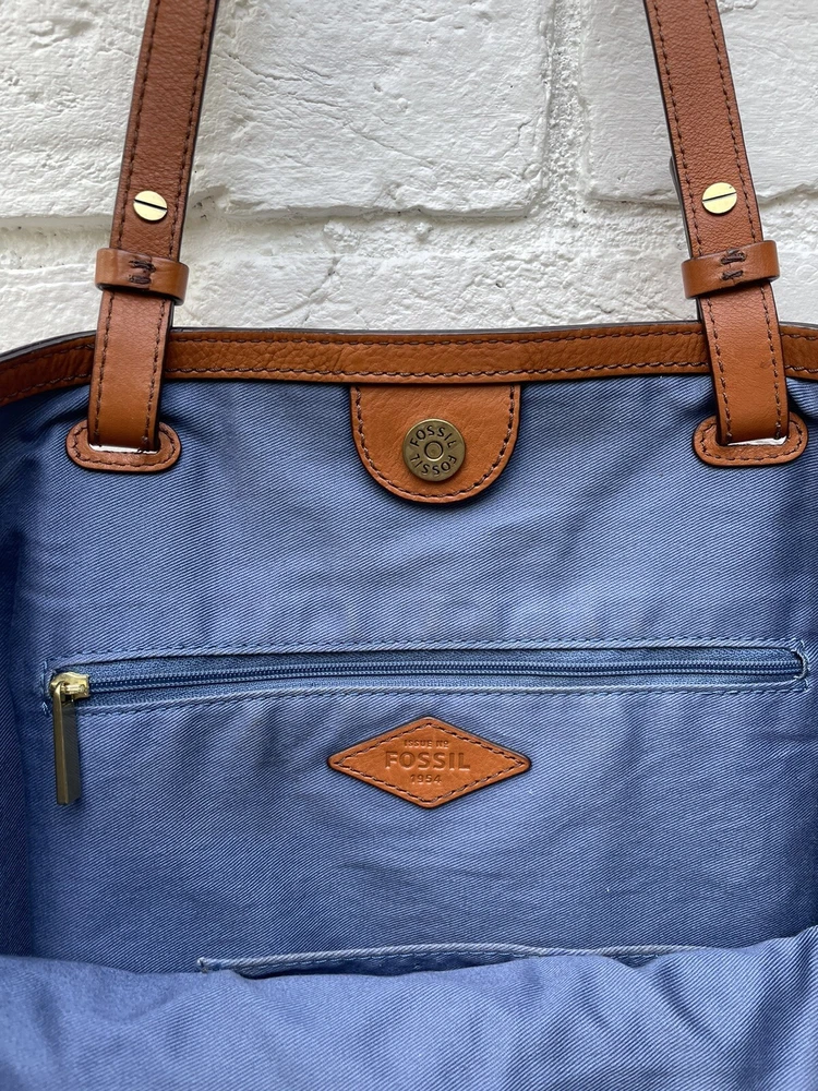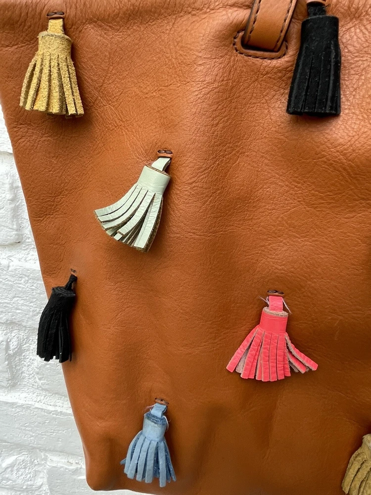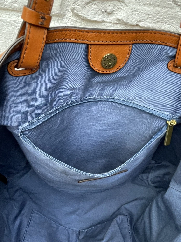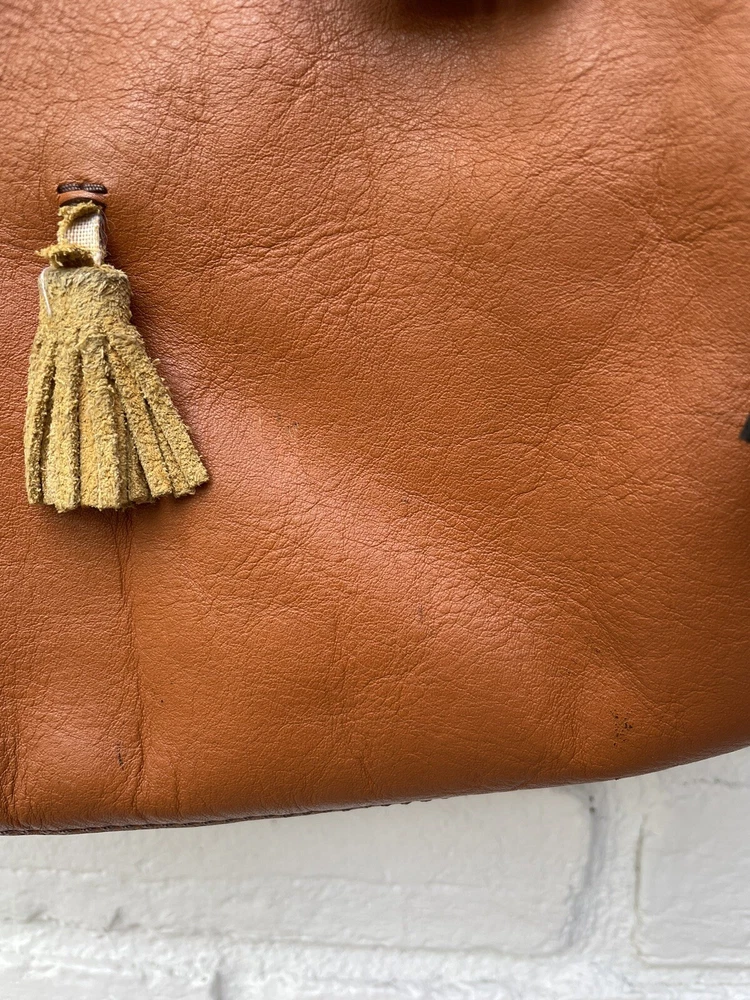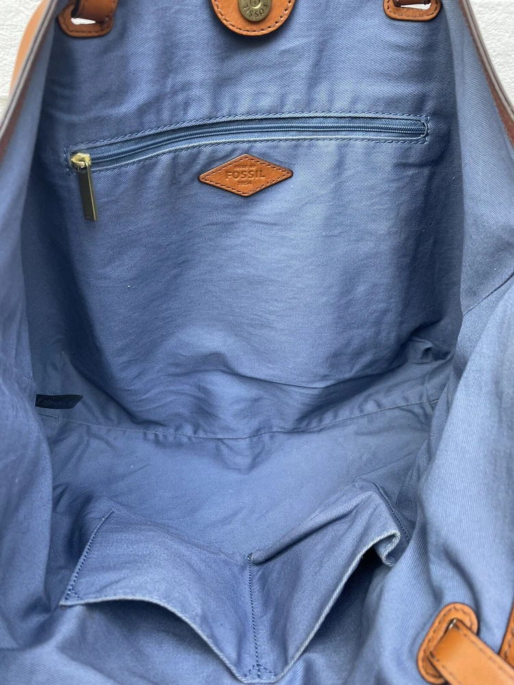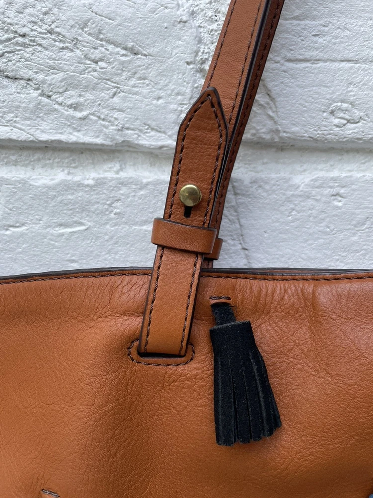 Pre-owned FOSSIL Leather Tote Bag Purse Brown Multi Colored Tassels EUC RARE! Very Nice!. Tan leather exterior with brass toned hardware and multicolored leather tassels. Denim blue lining. 1 zipper and 2 slip pockets. Double leather straps w/ drop of 9". Magnetic closure. 13"L across the base, 17.5"L across the top x 10.5"H x 4.25"D Has extremely minor marks on the side, shown in last two photos. Overall, it shows minimal signs of use, is very clean, and in well cared for condition. Please feel free to contact us with any questions or concerns you may have regarding our active or completed listings. We will do our best to provide you with the information you are looking for. Please send all communication via the eBay messaging system. New items will state they are new in the listing. If you are unhappy with your new item, you may return the item in its original packaging for a refund. Item must be received by us before a refund will be issued. Return shipping will be at the buyer's expense and is not refundable. Unless otherwise stated, All items being sold from our eBay page should be considered pre-owned or second-hand. Please read the description and look at each photo carefully. If an item has a defect or an issue with condition, we will do our best to describe it and it will be noted in the description and/or photos. Items may need ironed/steamed as wrinkling may occur in storage or shipping. We will only ship to the address the buyer has registered with eBay Customer service is our top priority. If you make a purchase from us and an issue arises; please give us a chance to make things right by contacting us before leaving negative feedback or opening a case. We promise to resolve problems quickly and professionally. Thanks so much! South Shiloh