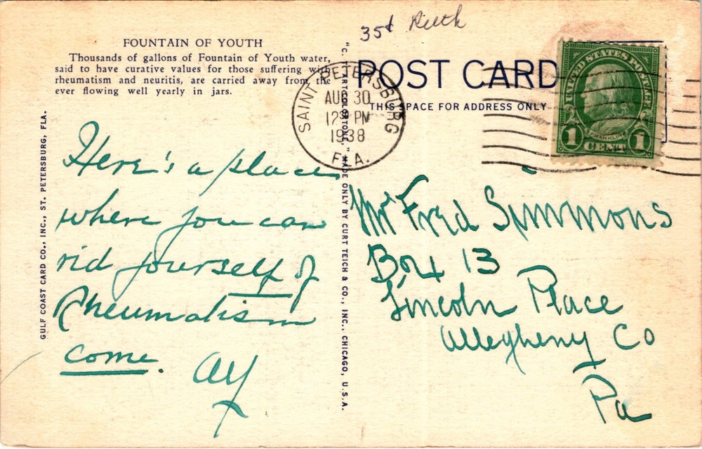 The postcard features an image of the Fountain of Youth in St. Petersburg, Florida, known as The Sunshine City. The fountain is said to have curative properties for conditions like rheumatism and neuritis, with thousands of gallons of its water being taken annually for its supposed healing benefits.