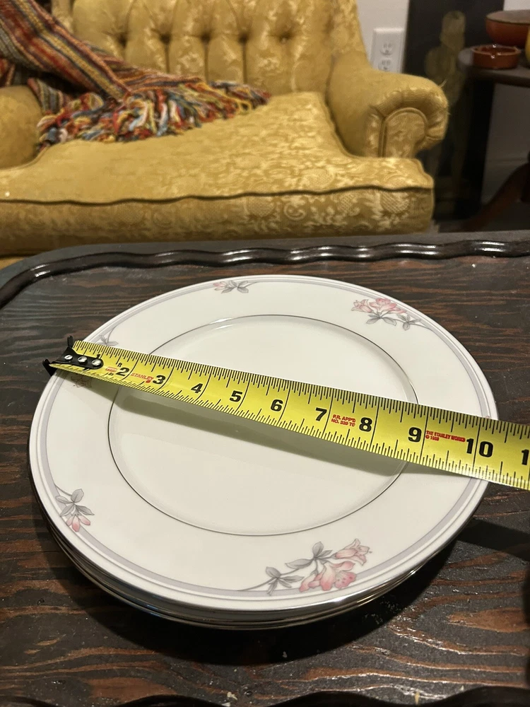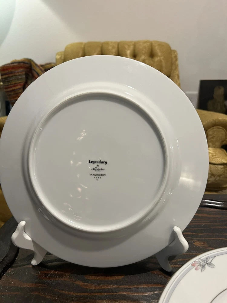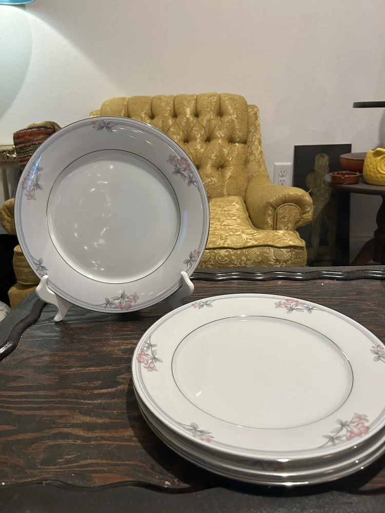 Add elegance to your dining table with this set of four Noritake Tarkington 3695 dinner plates. Crafted from porcelain with a glossy finish, these plates feature a beautiful floral pattern in pink flowers and gray leaves with silver trim. The round plates measure 10 1/2 inches in diameter and are perfect for all occasions. These vintage plates are an original Noritake product and were made in Sri Lanka using pottery production techniques. They are printed with the brand's backstamp and are part of the Legendary product line. Hand wash only is recommended for care instructions. Get ready to impress your guests with these exquisite dinner plates that are both contemporary and stylish.