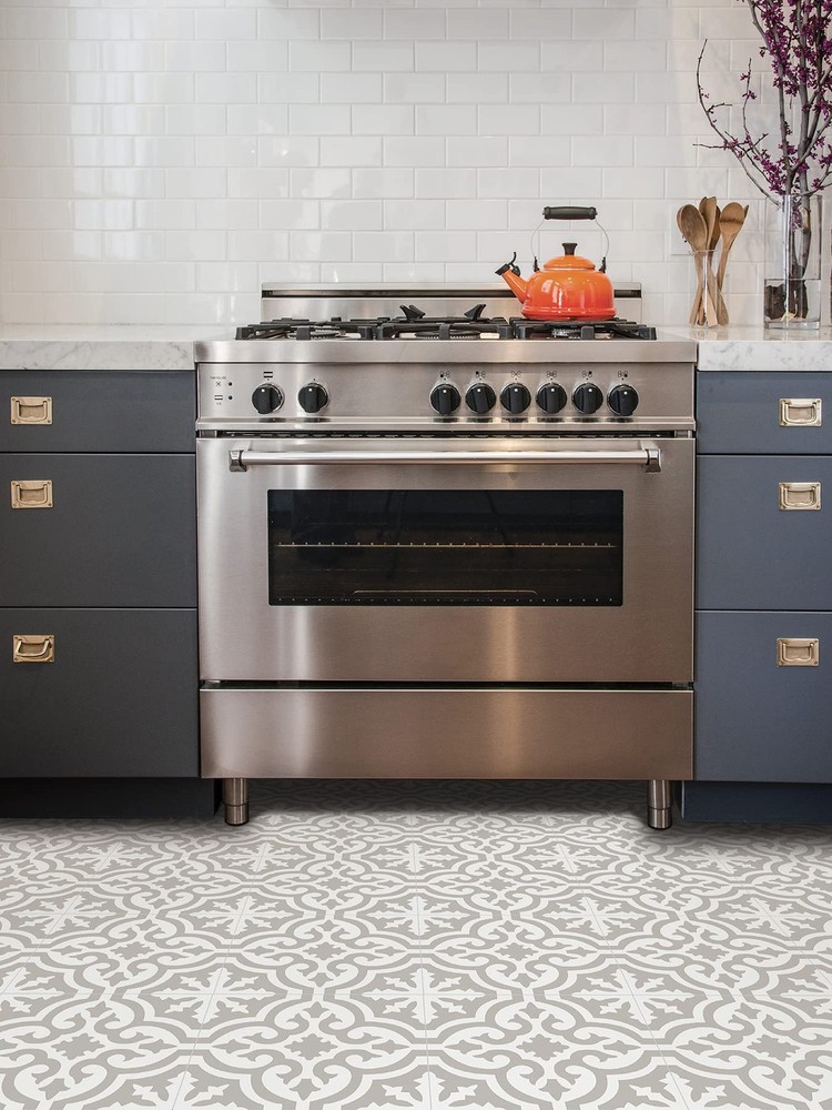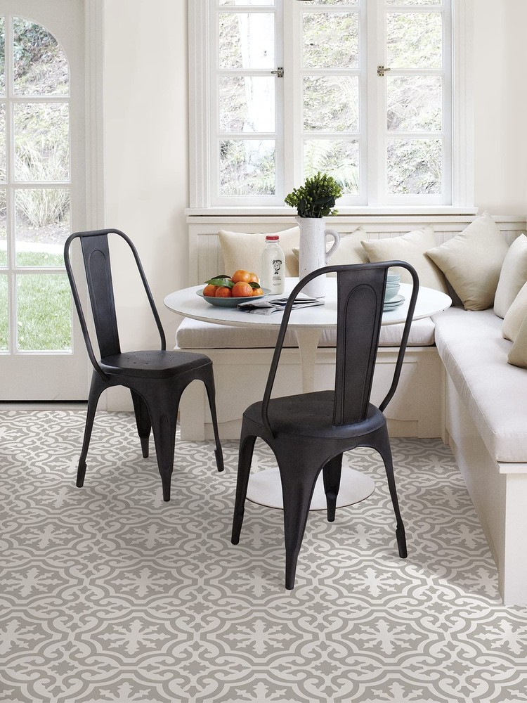 Grey and white peel and stick floor tile with a farmhouse style Peel and stick to apply Easy installation - no grout or special tools needed Water resistant and washable Virgin Vinyl material with a textured low lustre finish and permanent adhesive makes tiles durable One package contains 10 tiles that each measure .06-in in depth Each tile measures 12 x 12 inches