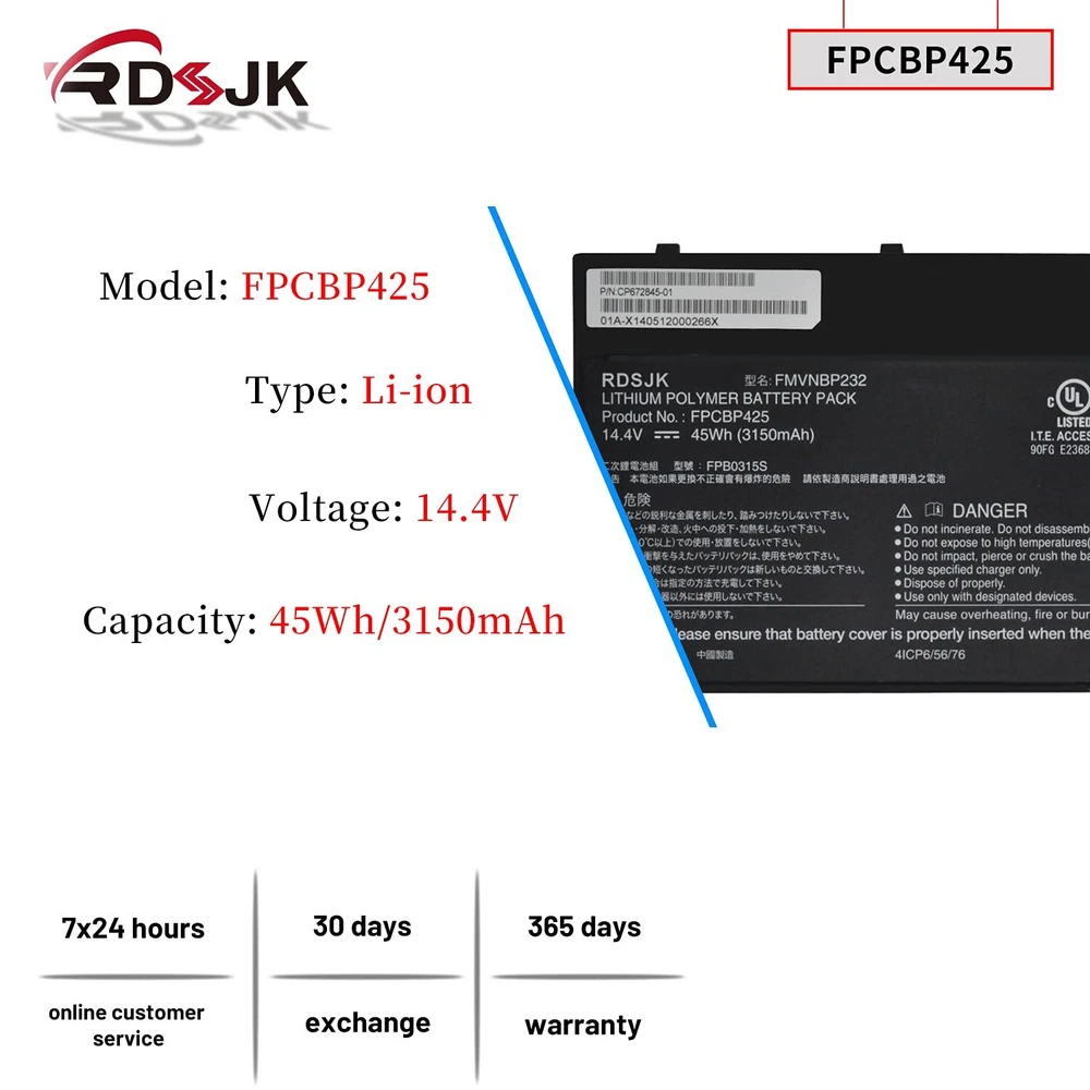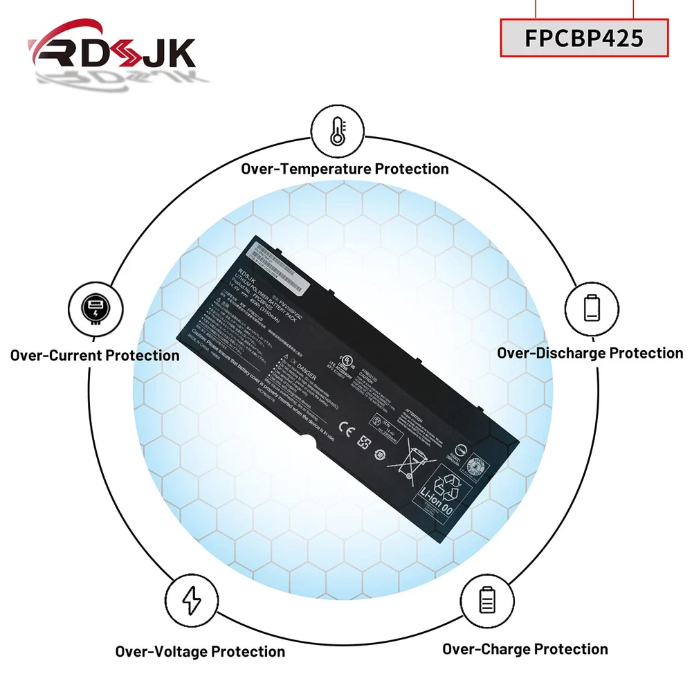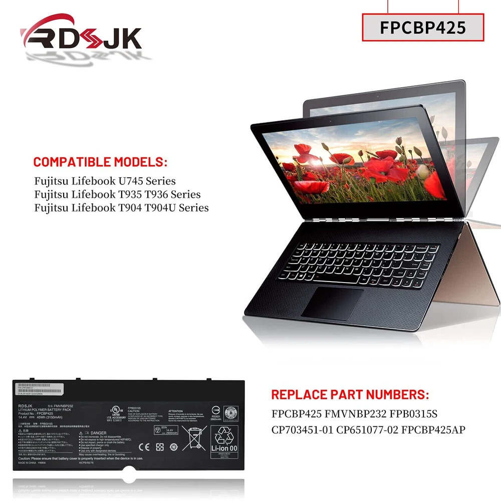 Battery Type: Li-ion; Voltage: 14.4V; Capacity: 45Wh/3150mAh; Color: Black Compatible Machine Models: For Fujitsu Lifebook U745 T935 T936 T904 T904U Series LifeBook U745 Series: LifeBook U745(VFY U7450M47APDE), LifeBook U745(VFY U7450M63SBDE), LifeBook U745(VFY U7450M65SBDE), LifeBook U745(VFY U7450M73ABDE), LifeBook U745(VFY U7450M75ABDE), LifeBook U745(VFY U7450M85BBDE), LifeBook U745(VFY U7450M87APDE), LifeBook U745(VFY U7450M451BDE), LifeBook U745(VFY U7450M452BDE), LifeBook U745(VFY U7450M752BDE), LifeBook U745(VFY U7450MP5ABDE), LifeBook T935 Series: LifeBook T935(VFY T9350M47APDE), LifeBook T935(VFY T9350M451BDE), Lifebook T936 Series: LifeBook T936(VFY T9360M85ABDE), LifeBook T936(VFY T9360MP87ADE), LifeBook T904 Series: LifeBook T904(VFY T9040MXA11DE), LifeBook T904(VFY T9040MXE11NL), LifeBook T904(VFY T9040MXP11DE), Compatible Part Numbers: FPCBP425 FMVNBP232 FPB0315S CP703451-01 CP651077-02 FPCBP425AP 4ICP6/56/76 Note: Please check if this battery is compatible with your computer before purchasing. If you are not sure for that, please contact us! Battery type: Li-ion; Voltage: 14.4V; Capacity: 45Wh/3150mAh Compatible Models: For Fujitsu Lifebook U745 T935 T936 T904U T904 Series Laptop Replace Part Numbers: FPCBP425 FMVNBP232 FPB0315S CP703451-01 CP651077-02 FPCBP425AP 4ICP6/56/76 100% New from Manufacturer. Up to 500 recharge cycles over the life of the battery. The actual operation time will depend on how much electricity is required by the device and how you use it For first use, please discharge the battery to 5%(not to 0%) and then charge to 95%, and cycle 3-4 times.