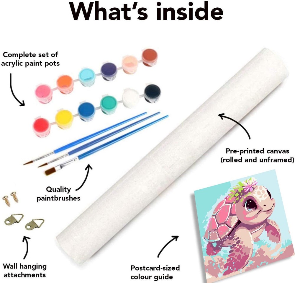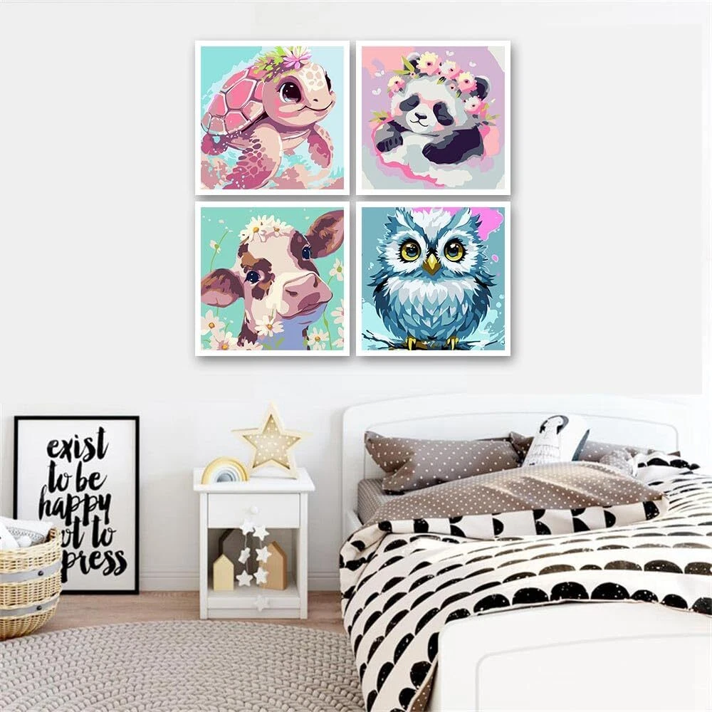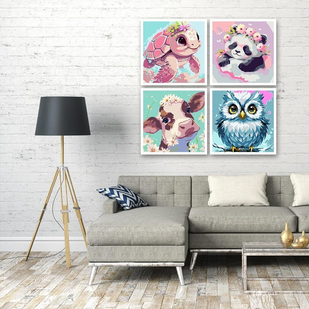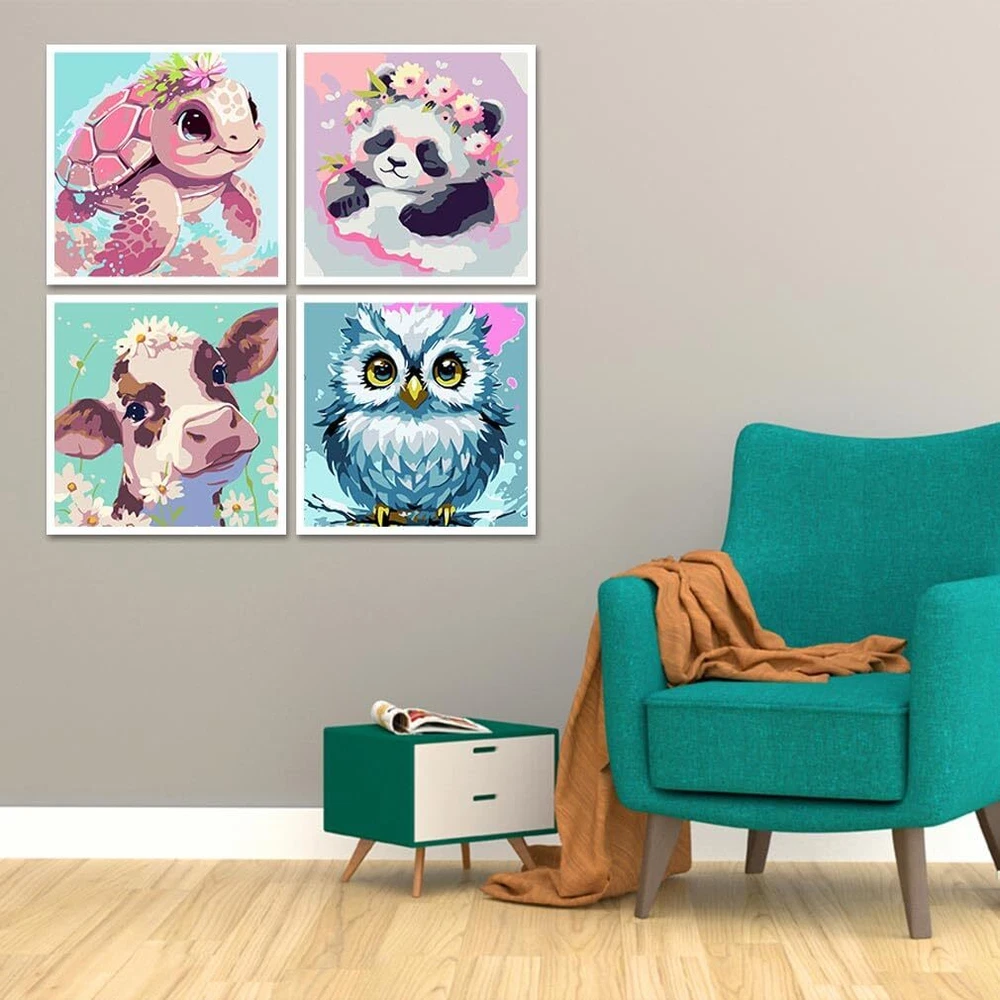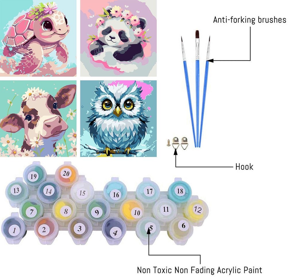 You will get: The cartoon turtles paint by numbers kit for adults includes 4pcs 8*8 inch(20x20cm) canvas, brushes and 4 sets of high-quality paint.Also included are small accessories such as hooks, screws and a guided atlas. Accessory:Our animals paint by number for beginners are made of high quality canvas, durable, moisture-proof, and waterproof. Use environmentally friendly acrylic paints, which are safe and non-toxic. Function: Panda painting kits for kids and beginners can not only bring you a special art experience, the finished artwork can also be used to decorate evey rooms in home, it's a nice decorations. How To Use: Cow paint by number kits for kids is a digital painting crafts for beginners, one number corresponds to one color, you can find the instruction guide of the product in the kit. Number painting is very simple and suitable for beginners. Satisfaction Guarantee:We are glad that you choose our products, we attach great importance to user experience. If you have any questions about the animal painting by numbers, please contact us via email as soon as possible. We will solve all problems for you within 24 hours.