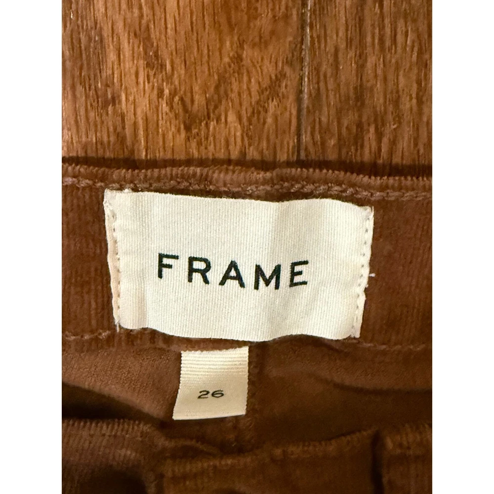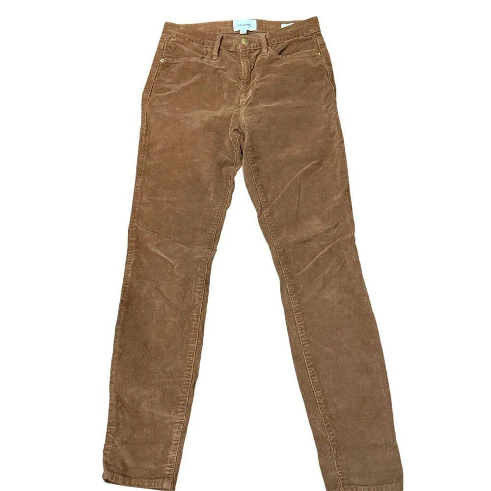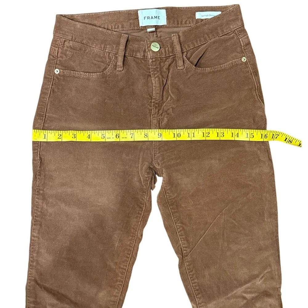 FRAME Revolve Le High Skinny Velvet Pants - Brown (Size 26) Elevate your wardrobe with these luxurious FRAME Le High Skinny Velvet Pants in a warm brown hue. These classic high-rise skinny pants feature a flattering silhouette and a plush velvet texture, perfect for adding sophistication to any outfit. • Size: 26 • Condition: Great condition with light wash wear. Measurements: • Inseam: 26” • Rise: 9.5” • Waist (laying flat): 13” A versatile and chic piece that pairs effortlessly with heels, boots, or your favorite flats! I do my absolute best to capture every little detail, but I’m only human (and a pretty busy mom!). So please look at the pictures and ask any questions you may have.