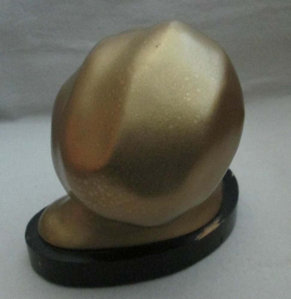 Art Deco era metal, with a gold exterior, bust, woman looking upward, 5 1/2" high and about 6 1/4" wide. The base is wood, painted black. Green felt on the base. Another eBay listing said that this is a piece made by Frankart but there are no markings on the bust. I didn't removed the base to check for a signature there. The exterior finish is in good condition for the age, probably the 1920's. One tiny spot, shows the metal below the exterior. See the last digital. The wood base has some paint loss. Those can be seen in the photos. One area of the base, on the back, shows that the wood has splintered. See photo ten. Since it is wood, and painted, it could be easily restored. Please view all of the digitals and use magnification, as needed, so that you are comfortable with the condition of the item before bidding. The photos are an important part of the item's description. Expedited Shipping. Shipping costs are based on the distance from Arizona to your home address. No international shipping. Shipping only to your confirmed eBay shipping address. USPS prices the cost of shipping. I provide the weight and size of the box. No local pick up. Thanks.
