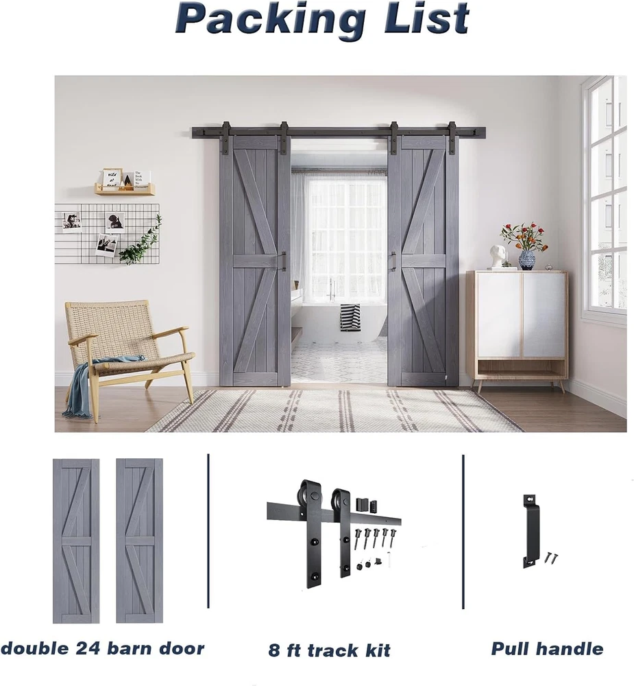 Store New Arrivals Add to Favorite View Feedback Contact FREDBECK Gray Double 24X84 Inch Doors 48 Wood Barn Door with 8FT Barn Door Hardware Kit and Handle Included K Shape Spruce Double Surfaces,Simple Assembly Is Required,K-Frame,Grey Description Part Number MB-04H-YS-24K-X2-A Style Rustic Assembly Required Yes Item Package Quantity 1 Color Gray Brand FREDBECK Material Wood Country of Origin China Batteries Required? No Item Weight 56 Pounds Manufacturer FREDBECK Batteries Included? No Size 24*2 in with 8FT barn door hardware[Gray] Is Discontinued By Manufacturer No Product Dimensions 1.4 x 48 x 84 inches Included Components double Barn Door Slab,8FT Barn Door Hardware,Screw,Cork,Manual ๐๐ฉ๐ซ๐ฎ๐๐ ๐๐จ๐จ๐ : Spruce wood is good material with a delicate texture and fragrance, not easy to be rotten, but also has good toughness, flexibility, durability.Spruce wood surface texture is beautiful, the surface of the wood has a glossy feeling. ๐๐ง๐ข๐ช๐ฎ๐ ๐๐๐ฌ๐ข๐ ๐ง : All Wood Panels are mitered for a snug fit. A simple assembly is required. Allowing each customer the ability to create a truly one of a kind door by placing each plank in the desired location.In all cultures, spruce represents longevity. Barn doors will stand the test of time. Keeping your home or office looking unique for years to come. ๐๐ข๐ฆ๐๐ง๐ฌ๐ข๐จ๐ง : Width: double 24"doors, Height: 84", Thickness: 1 3/8", Solid core thick: 1/2". Door can be flipped in either direction. The bottom of the door had been a pre-made groove for the floor guide. ๐๐จ๐จ๐ ๐๐ฎ๐๐ฅ๐ข๐ญ๐ฒ : Manufactured using quality wood harvested from professionally managed forests. Genuine Spruce provides rustic wood beauty.Perfect for a study, dining room area or an elegant transition between spaces, barn doors enhance and unify your space with light and beauty. durability and beauty for long years of enjoyment. ๐๐๐๐ค๐๐ ๐ ๐๐ง๐๐ฅ๐ฎ๐๐๐ : 2x 24inch doors,2x 4 FT Track,4x Hanger,6x Spacer,2x Floor Guide,2x Pull Handle. Product Description Q๏ผWhat is the suitable opening of the doorway for this door? A๏ผThe double 24" unit is designed for double door each door openings from 18" to 22". Is the door need to assemble or not ? You need to assemble it,but it was easy to assembled What is the total height you need floor to ceiling? You must have at least 90 1/8" for clearance Does it come with the headboard? No When do you need a headboard? a. If the studs don't line up with the pre-drilled holes in the rail b. If there is a doorway trim. And "door depth'' plus ''trim depth'' is greater than 2'' Fredbeck barn door list Add to Cart Add to Cart Add to Cart Add to Cart Add to Cart Customer Reviews 4.8 out of 5 stars 36 4.4 out of 5 stars 127 4.4 out of 5 stars 100 3.9 out of 5 stars 121 4.5 out of 5 stars 185 Price $299.99 $ 299 . 99 $349.99 $ 349 . 99 $319.99 $ 319 . 99 $269.99 $ 269 . 99 $229.99 $ 229 . 99 Meterial MDF+PVC+Wood+Glass LVL+Wood Wood Wood Wood Hardware โ โ โ โ โ Color White Brown Wood color Brown Wood Hardware size 8ft 8ft 8ft 7ft 8ft Door Panel Thickness 1-3/8" 1-3/8" 1-3/8" 1-3/8" 1-3/8" indoor or outdoor? both both indoor indoor indoor ABOUT US We offer the best prices around on high quality products. Our E-store includes media such as books, movies, music and games while offering electronics, toys, sporting apparel, clothing, tools, general home, garden items and more. SHIPPING We are always working hard to ensure your package arrives as soon as possible. Please understand that some factors like weather, high postal traffic, and the performance of shipping companies are outside of our control. We offer free shipping to the lower 48 states and ship within 5 business days of payment, usually sooner. We do not accept P.O. Boxes. Please provide a physical address. For shipping outside of the continental USA, we only use eBay's Global Shipping Program.The item is shipped to KY and then sent to the rest of the world. International customers are responsible for all duties and taxes. Continue to check out in order to calculate costs for shipping the item to your country. Messages regarding eBay's Global Shipping Program MUST be directed at eBay EXCLUSIVELY. RETURNS We offer a 30-Day Return Policy on items which you are not completely satisfied with. You have the option for a full-refund or an exchange of the item. No returns are available on items shipped outside of the USA. PAYMENT We accept PayPal. CONTACT US This page content is yet to come Please ad us to your favorite seller and visit again later Thank You CUSTOMER SATISFACTION We try our very best to make sure every customer is completely satisfied. If there's a problem, message us! We're happy to help. WE ACCEPT Copyright ยฉ 2021 AutoDS. | All Rights Reserved