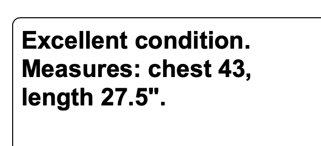 Excellent condition. Measures: chest 43, length 27.5". THANK YOU EBAY!!! We are so thankful for our customers! We have thousands of listings, and therefore receive hundreds of messages, every single day. So, if you are asking about a price drop, or a shipping price drop, or asking for extra measurements, or to add additional photos, please allow me to answer you here, No thanks. If your question is not one of those questions, we will be happy to answer you individually. YES...WE DO COMBINE DOMESTIC SHIPPING. Extra jewelry items ship for $2 each (except for large jewelry lots). We will refund the difference as we are mailing out.....we hope you enjoy shopping with us! We encourage you to read the description and check all photos.