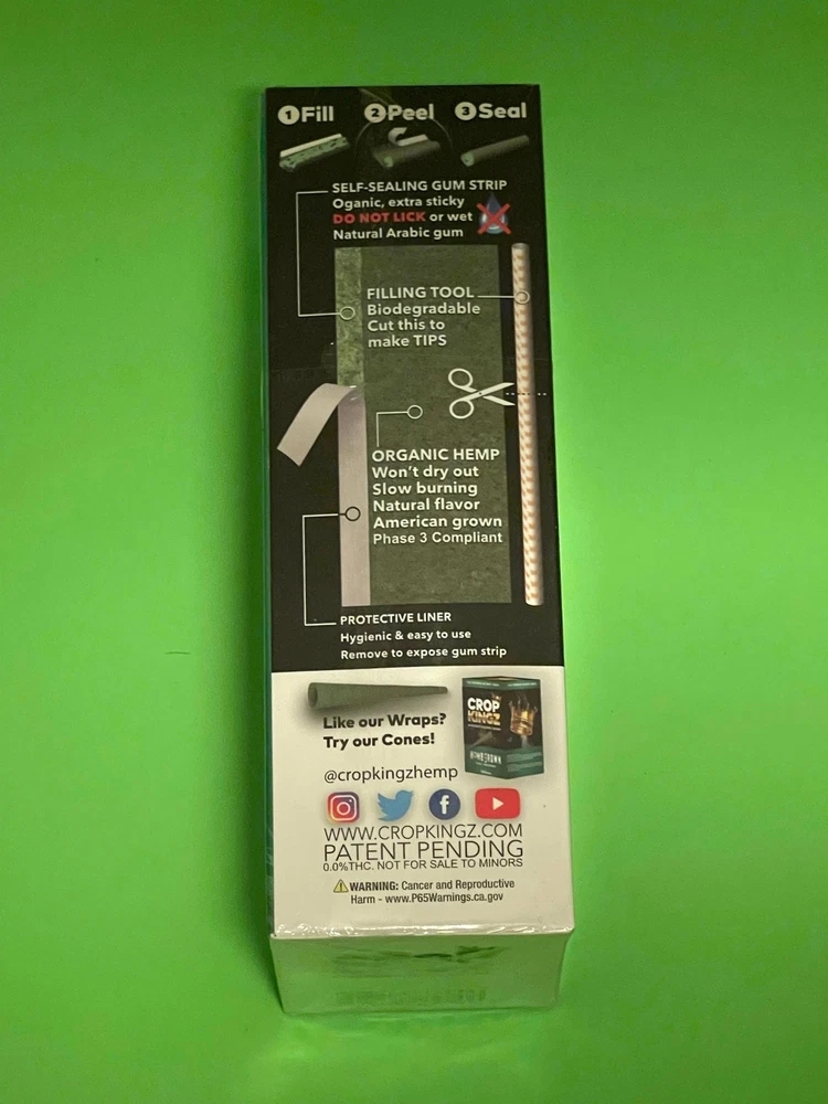 Free Gifts 🎁 with Purchase Fast shipping WE USUALLY PACK & SHIP THE SAME OR NEXT BUSINESS DAY Tobacco free Contains = 15 Sealed Packs 2 Organic Premium Wraps per pack Total = 30 Organic Premium Wraps Crop Kingz 👑 Home 🏡 Grown Plain / Unflavored Made in USA 🇺🇸 New!!! Self-Sealing Wraps 1. Fill 2. Peel 3. Seal Organic Hemp Won’t dry out Slow Burning 🔥 Natural Flavor American 🇺🇸 grown Phase 3 Compliant Self-Sealing Gum Strip Organic, extra sticky DO NOT LICK 👅 or wet 💧 Natural Arabic gum Filling Tool Biodegradable Cut ✂️ to make tips Protective Liner Hygienic & easy to use Remove to expose gum strip