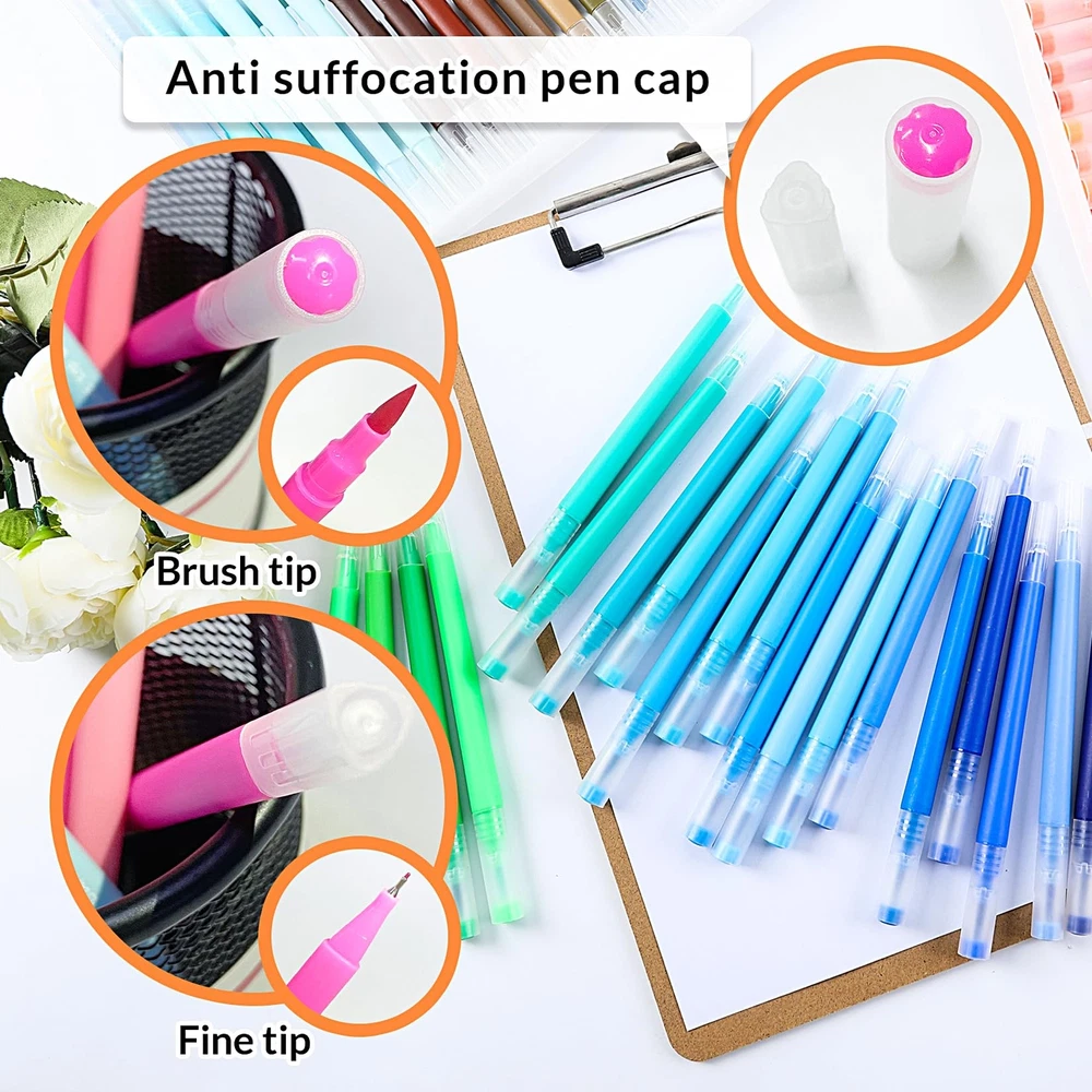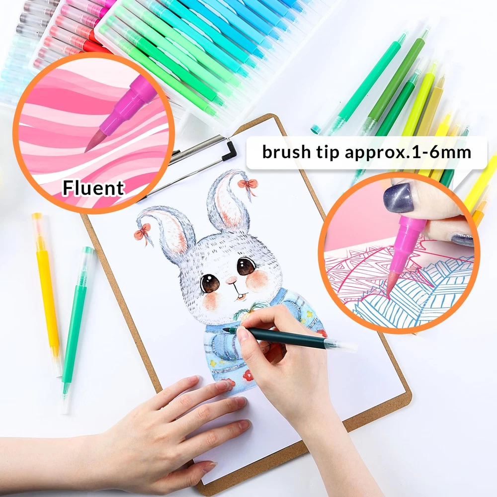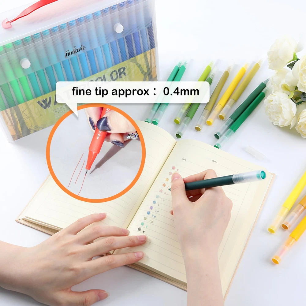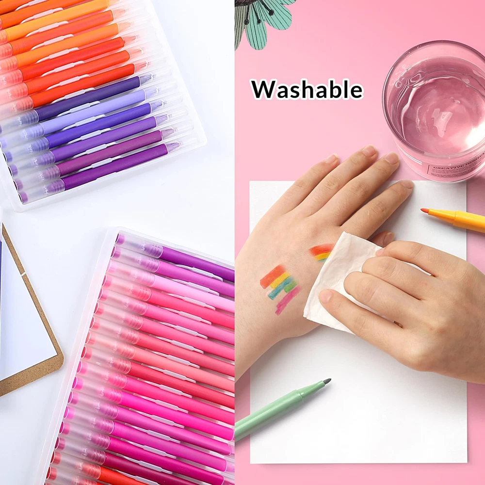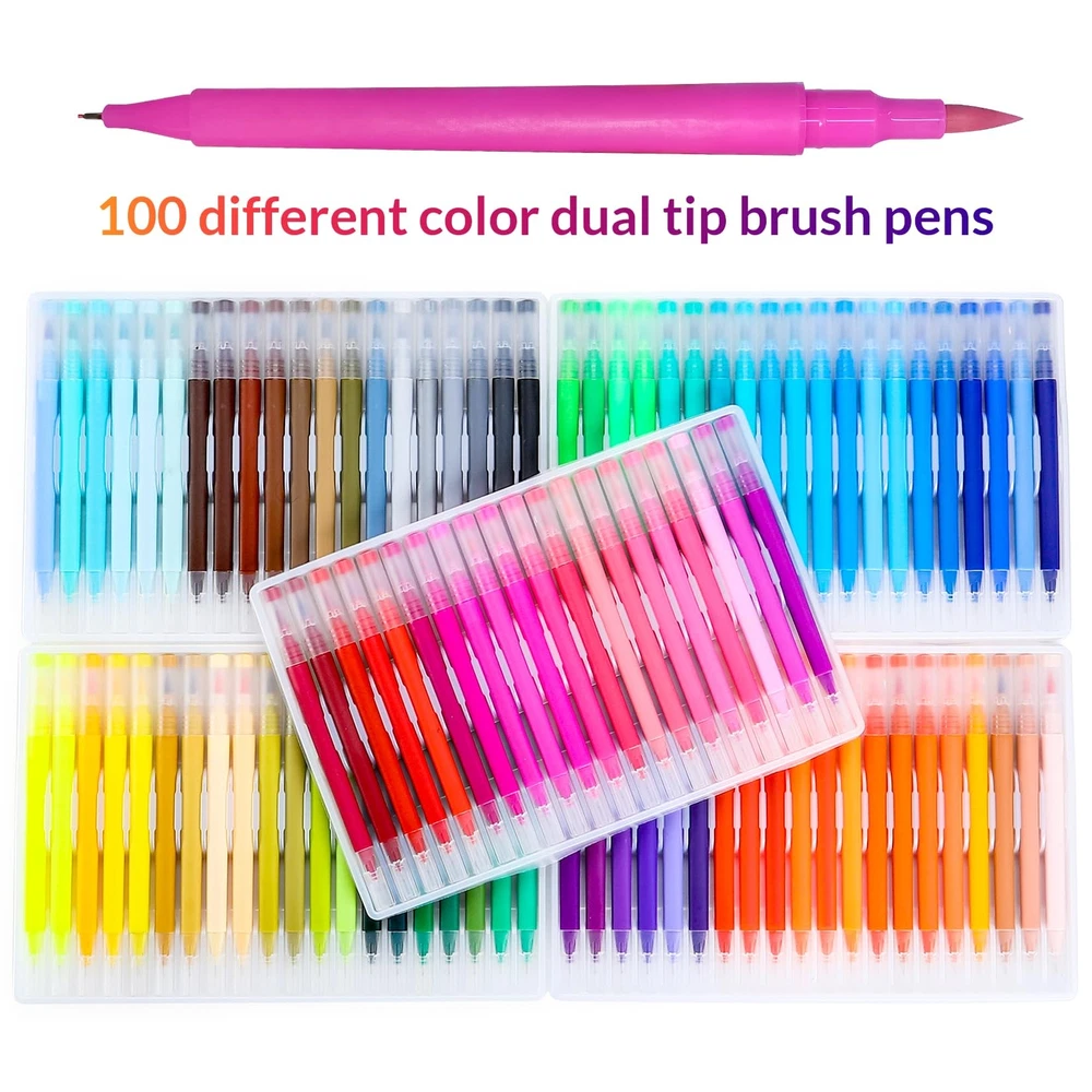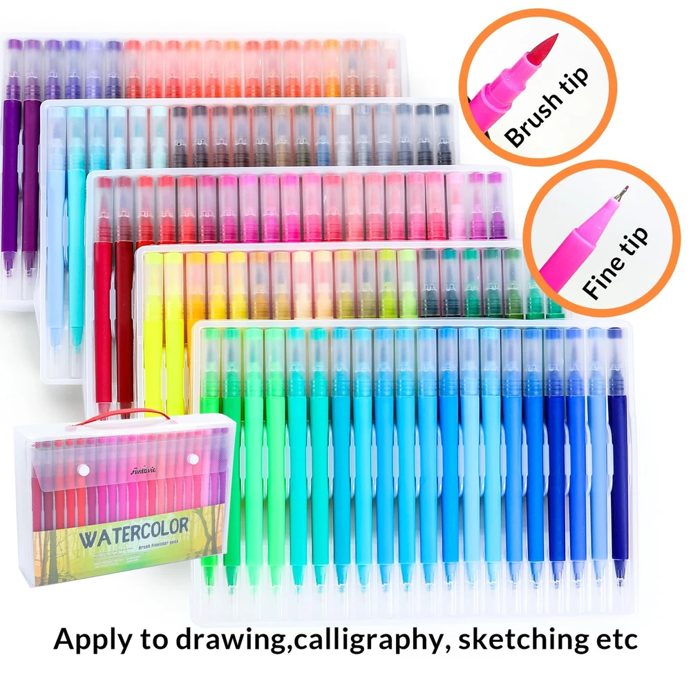 Our watercolor pen set uses high-quality ink, writing smoothly, durable and is the ideal choice for your artistic creation. The set contains 100 colors to meet your needs for different colors. Dual tip design, you can draw thick and thin lines, with strong flexibility, you can create a variety of works. The special pen barrel design allows you to create more comfortably. Perfect for Coloring, painting, doodling and more. Our watercolor pen set gives you an excellent creative experience. This is a set of watercolor pens perfect for artistic creation and can be given as gifts to relatives and friends, such as Christmas, Thanksgiving, birthdays, etc. The FUN LAVIE watercolor pen set contains 100 different colors to meet your needs for different colors.Odorless and non-toxic, please rest assured to use. Dual tip: The fine tip is about 0.4mm for outline, and the brush tip is about 1-6mm for coloring.You can easily create different styles of art works. Special barrel design: the thick barrel is round, and the thin barrel is triangular, making you more comfortable when painting. Our watercolor markers are very suitable for book coloring, graffiti, and painting. A perfect art set for family and friends, such as Christmas, birthday, Thanksgiving, etc.Easy to carry and convenient for your outdoor creation. Welcome to contact us with any questions. If you have any issues, we'll make it right.