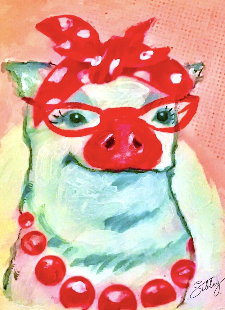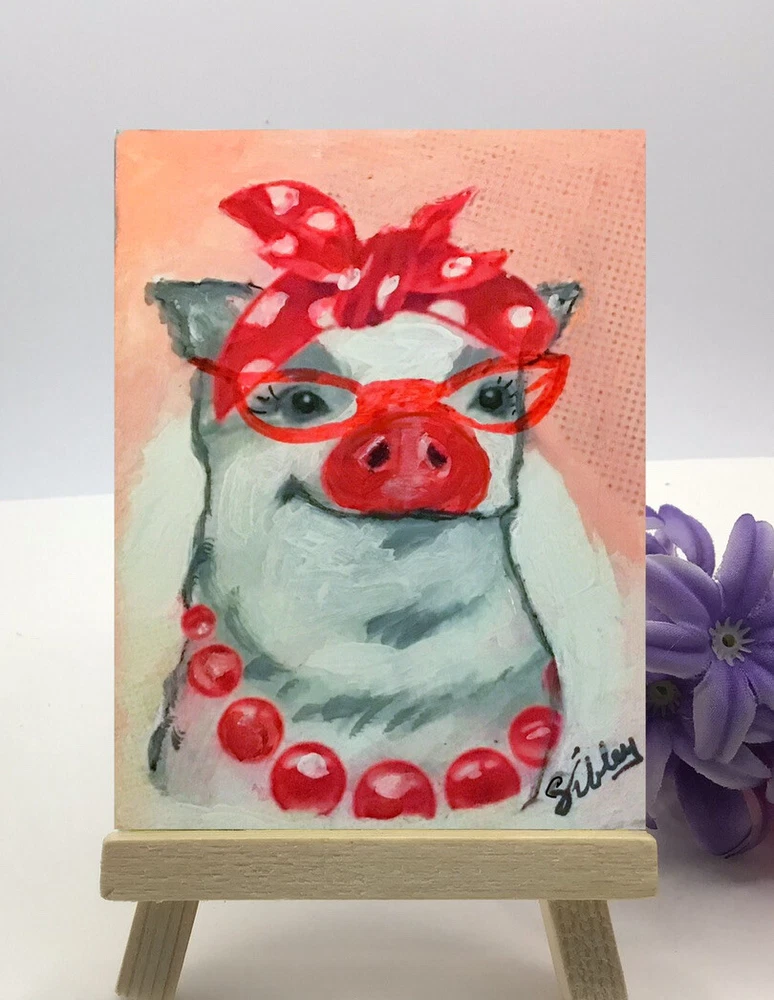 FUNNY PIG IN GLASSES Miniature ACEO PRINT 2.5”"x3.5” Signed, WITH MINI EASEL