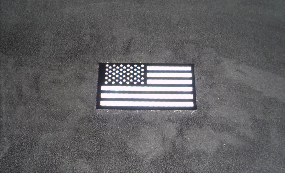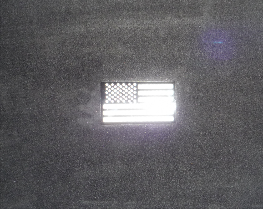 1 HI-VIS Reflective PATCH 3.5” X 2” FORWARD USA FLAG REFLECTIVE HI-VIS ON BLACK WITH VELCRO® BRAND FASTENER $13.13 EACH First Class Shipping is $4, additional patches ship free. HI-VIS Patches are patches made by Anytime Sign, Inc., introduced in 2016 using the MOST REFLECTIVE MATERIAL KNOWN TO MAN. Patches are made with 3M solvent screen printing ink and 3M reflective material for the highest quality, most highly visible patch possible. Hi-Vis patches are made in the USA with all USA materials including VELCRO® BRAND FASTENER. WHEN SAFETY IS A MATTER OF LIFE AND DEATH... Question: What are the advantages of Hi-Vis Patches ? Answer: Hi-Vis Patches replace other patches that are not reflective or have very little reflectivity for safety and efficiency. 1) Night Visibility - HV Patches are the Most reflective, most Highly Visible Patches in the world. 2) Changeability- HV Patches attach with VELCRO® BRAND FASTENER 3) Flame Resistance - HV Patches can withstand some open flame without distortion or singing of the patch. 4) Fine Detail - HV Patches can have the finest detail image. We make our transparent positives with a laser Imagesetter. 5) Exotic colors and metallic capabilities - HV Patches have colors that are brighter and colors can be metallics like silver and gold and "hot" inks like hot pink and neon green. 6) Longevity - HV Patches are made with 3M materials and VELCRO® BRAND FASTENER to last longer than other patches. 7) Conformity - HV Patches are NOT as flexible as cloth patches - we recommend purchasing a sample patch before placing large orders. 8) Cleanability - HV Patches can easily be cleaned with water or glass cleaner after removal from clothing. 9) Launderability - HV Patches attach with VELCRO® BRAND FASTENER, must be removed before washing clothes. 10) Custom Images - because HV Patches are solvent screen printed, custom images require a minimum 25 patches order. VELCRO® is a registered trademark of Velcro BVBA, used with permission.