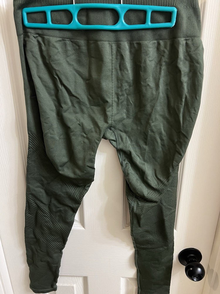 These Fabletics leggings in olive green are perfect for women looking for comfortable and stylish activewear. Made from a blend of polyester, nylon, and spandex, these leggings are suitable for various activities such as yoga, running, and cross training. They feature a logo accent, pockets for convenience, and are machine washable for easy care. The medium size and regular fit make them a versatile option for both casual wear and workouts.