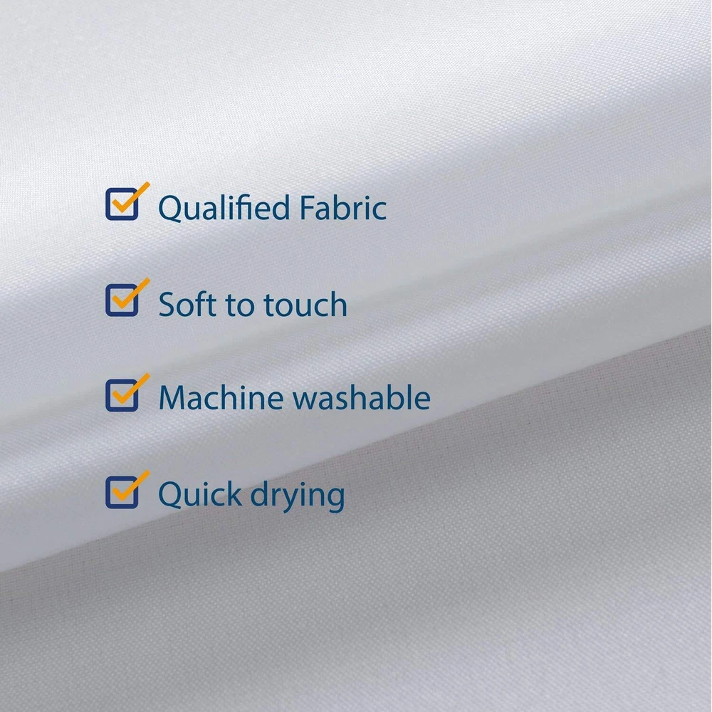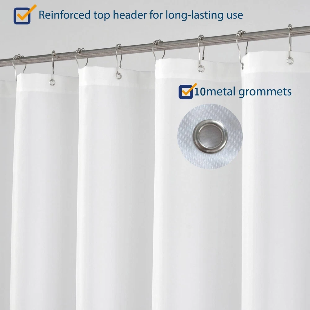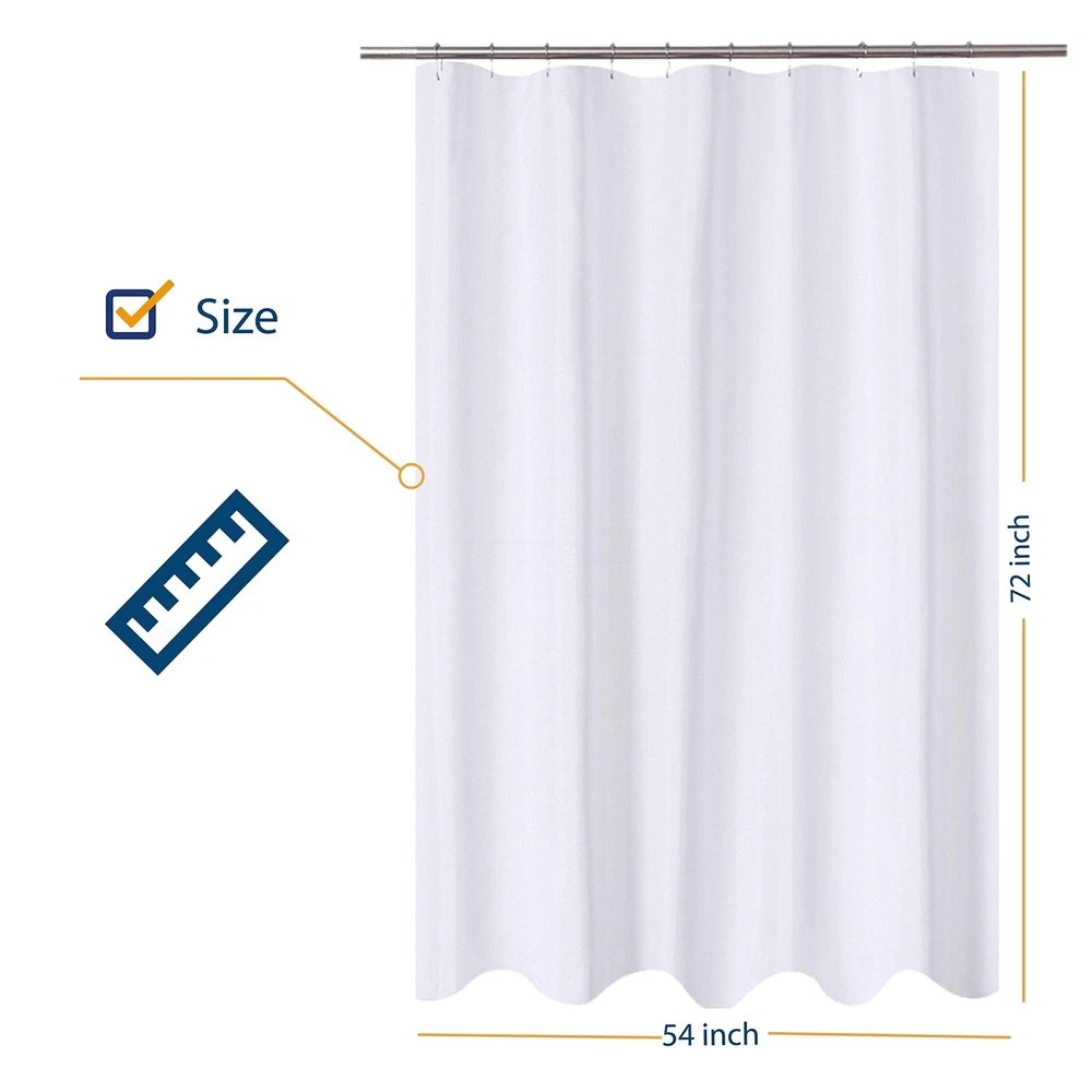 : 3 month with our 90 days "No Question Asked" money back Product information: Material: 100% Polyester Size Measurements: 54" width x 72" length inches (4.5ft x 6ft), 10 holes(grommets) Remark : ★ No hooks and rod included ★ All dimensions are measured manually with deviation (ranged) at 1-3cm HIGH-PRODUCTS Hotel Luxury quality shower curtain liner brightens up your bathroom with soft, textured, luxury and spa- like feel. *Made from polyester fabric with 100 GSM (g/m²), this shower curtain liner is of hotel quality, unlike PVC-laden vinyl and plastic alternatives. *Closely knit thicker than ordinary fabric, this liner highlights its extraordinary quality and looks more clean, elegant and generous. *Water-repellent fabric is treated to allow water glide off easily and dry quickly, good to resist soaking. *Reinforced top header increase strength at a degree that keep the curtain liner in place and ensure long-term use. *10 metal grommets could match with any decorative hooks, easy to hang. *Can be used as a shower curtain without any other clear liner, best of PVC or PEVA for bathroom decoration. EASY TO CLEAN AND MAINTAIN *Machine washable *Wash cold by gentle cycle *Mild detergent needs to be used *Do not bleach *Tumble dry *Iron on permanent press setting Add to Cart with our 90 day ! HOTEL LUXURY QUALITY: Superior quality polyester 54x72 shower curtain/liner, applicable to hotel and home décor. Use by iteself or protect your decorative curtain with this 2-in-1 shower curtain liner THE FABRIC lets water bead up on the surface and glide down, quick to dry. 2 weighted magnets on bottom corners help keep this stall shower curtain in place NON-PLASTIC: Soft polyester fabric with no vinyl and pvc smell, drape naturally and no stiff, unlike PEVA and plastic alternatives EASY MAINTAIN: Machine washable and keep your shower curtain fresh and clean to reuse, rinse and dry quickly. This 54 wide by 72 length shower curtain liner is easy to install for your shower stall DURABLE & LONG LASTING: Reinforced top header with rustproof grommets prevents from tearing and promotes this 54" width stall size shower curtain liner long lasting