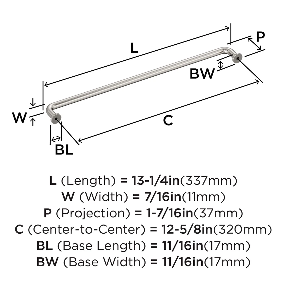 The BP36966PN Factor 12-5/8 inch (320mm) Center-to-Center Pull is finished in Polished Nickel. Elevating the basic wire pull, the Factor collection features gentle curves and pedestal feet that create a casual, approachable silhouette. A warmer counterpart to chrome finishes, polished nickel features soft golden undertones that enhance any space with a rich luster reminiscent of sterling silver. Founded in 1928, ’s award-winning home solutions including decorative and functional cabinet hardware, bath accessories, decorative hooks and wall plates have built the company’s reputation for chic design accessories that inspire homeowners to express their personal style. offers a variety of styles and finishes at affordable prices that add the perfect finishing touch to any room. VERSATILE - Contemporary style adds an easy designer upgrade to any cabinet drawer, cabinet door or furniture piece DURABLE - High quality construction for lifelong durability CONVENIENT - Mounting hardware included for quick and easy installation - Coordinates seamlessly with finishes from popular plumbing and lighting brands DISCLAIMER - We do our best to show colors accurately, but they might look different on your screen due to individual monitor settings