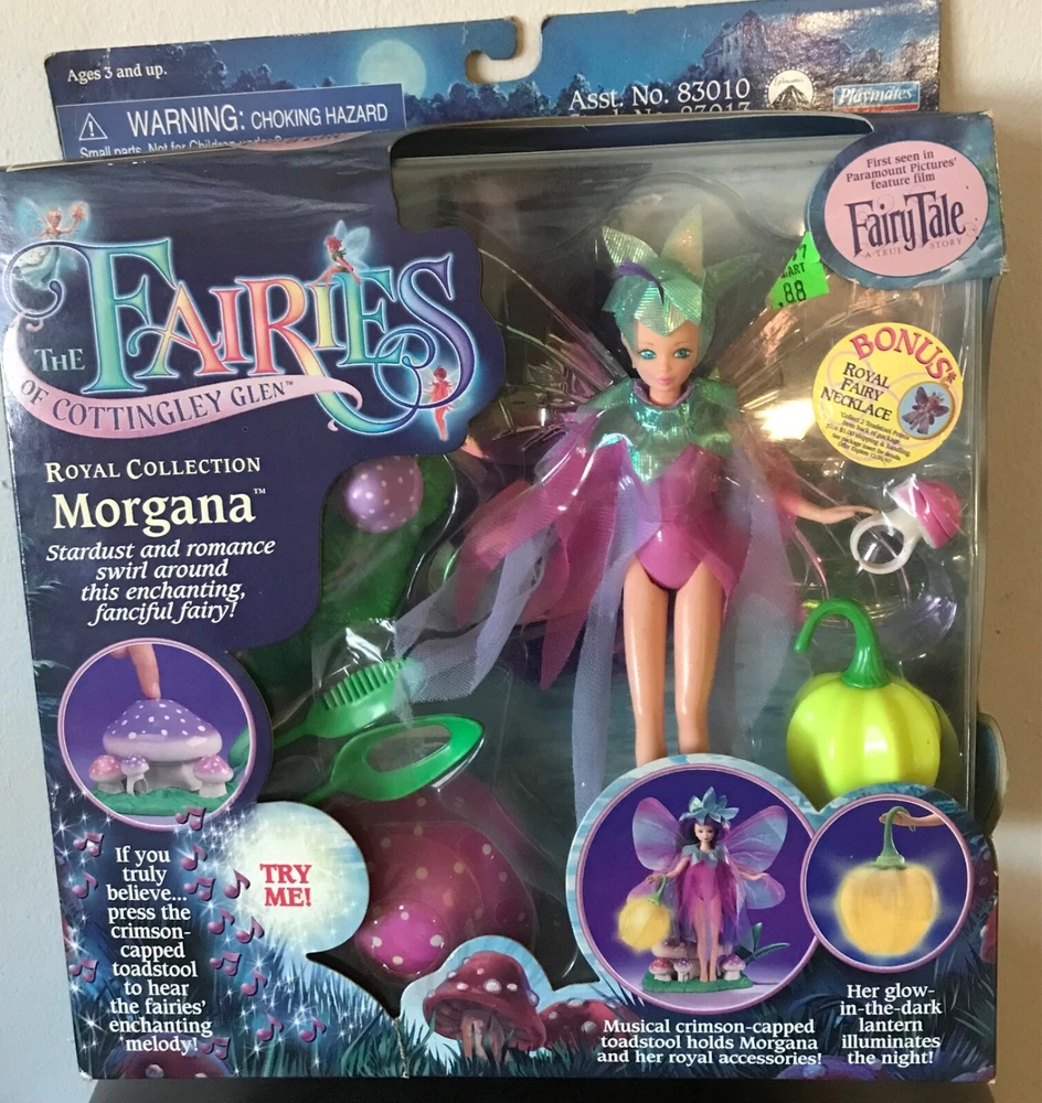 This Princess Florella doll from the Royal Collection of the Fairies of Cottingley Glen is a perfect addition to any vintage doll collection. With her purple hair and blue eyes, she is a stunning 6-inch figure made of vinyl and plastic. The doll comes with a set of 5 pieces and is an original, licensed reproduction from Playmates Toys. This figure is part of the playmate toys product line and is perfect for collectors or for children who love fairies. The doll's complexion is light, and she is dressed in a beautiful gown fit for a princess. This is a must-have item for anyone who loves vintage dolls or the Fairies of Cottingley Glen franchise. The toadstool still plays it’s enchanting melody!