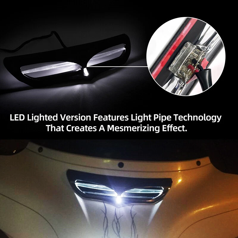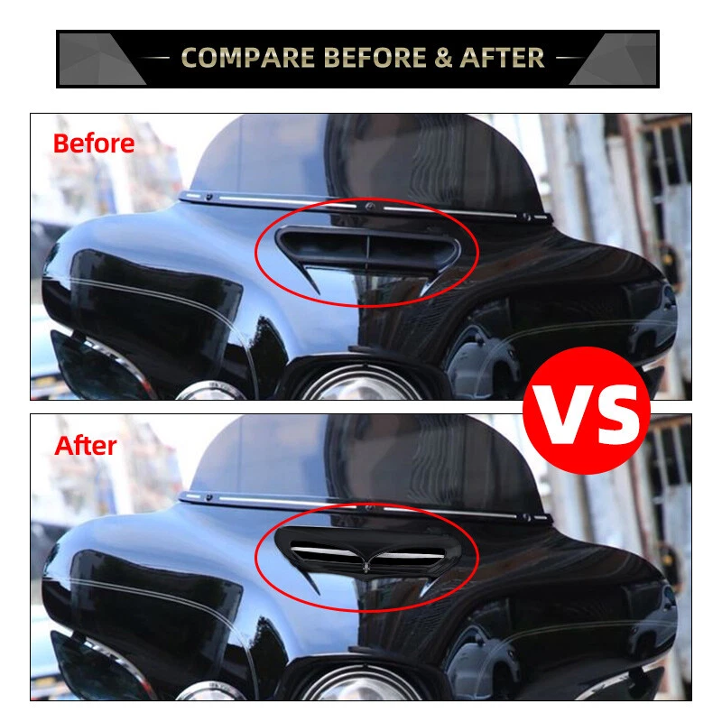 Feature: -The most appealing and innovative fairing vent trim on the market today. -The vent trim will not affect the flow of the fairing vent. -LED lighted version features light pipe technology that creates a mesmerizing effect. -LED light module plugs directly into the stock wiring harness with no cutting, drilling,or splicing. Specifications: Color: Black Material: ABS Plastic Package Included: 1 X Fairing Vent Trim Fitment: Fits for 2014-up Harley FL models with an OEM batwing fairing. Fit for Touring Electra Glide Police FLHTP: 2014–2022 Fit for Touring Electra Glide Standard FLHT: 2019-2022 Fit for Touring Electra Glide Ultra Classic FLHTCU: 2014–2022 Fit for Touring Electra Glide Ultra Classic Low FLHTCUL: 2015–2016 Fit for Touring Street Glide Anniversary FLHX: 2018 Fit for Touring Street Glide FLHX: 2014–2022 Fit for Touring Street Glide Special Anniversary FLHXS: 2018 Fit for Touring Street Glide Special FLHXS: 2014–2022 Fit for Touring Ultra Limited Anniversary FLHTK: 2018 Fit for Touring Ultra Limited FLHTK: 2014–2022 Fit for Touring Ultra Limited Low FLHTKL: 2015–2022 Fit for Trike Tri Glide Ultra Classic Anniversary FLHTCUTG : 2018 Fit for Trike Tri Glide Ultra Classic FLHTCUTG: 2014–2022 Notes: -Due to the lighting and screen settings, the real color may slightly different from the picture. -Please allow slight manual measurement deviation for the data. -Please double confirm your vehicle model is exactly same as us before purchase. -Easy to install and no install instructions You may also like Chrome Heat Shield Air Deflector For Harley Electra Glide Road King 1997-2007 20.99 USD Free shipping Left Right Battery Side Cover For Honda Shadow ACE 750 VT750C Black 1997-2003 26.99 USD 11.99 USD Chrome Battery Side Fairing Cover For Honda VTX1800 VTX 1800 R/S/N/F/T 2002-2008 34.99 USD 4.99 USD Black Battery Side Fairing Cover Fit For Honda Shadow VLX 600 VT600C 1999-2007 28.99 USD 10.99 USD Side Battery Cover For Suzuki Boulevard Voluisa C50 C50TVL400 VL800 2005-2017 56.99 USD 11.99 USD For Honda Rebel 500 CMX500 Engine Guard Under Fairing Cover Belly Pan Panel 76.99 USD 51.99 USD