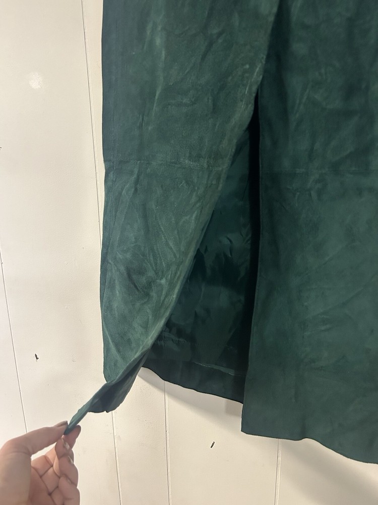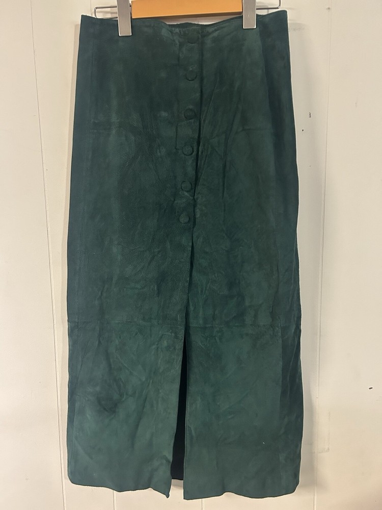 Fairweather Size 8 Green 100% Genuine Leather Skirt features a luxurious suede feel with a button back detail, adding a touch of sophistication to your wardrobe. This straight & pencil style midi skirt is lined for added comfort and is perfect for any occasion. Made with high-quality materials, this skirt is a timeless staple that will elevate any outfit with its solid green color and stylish accents. Excellent condition No damage or stains Vintage skirt Made in Korea Smoke and Pet free home