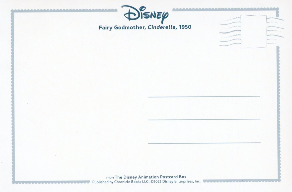 Brand/Publisher: Chronicle Books Theme: Animation, Movies, Film Frame, Disney, Cinderella Unit of Sale: Single Unit Subject: Fairy Godmother Time Period Manufactured: 2020-Now Era: Photochrome (1939-Now) Year Manufactured: 2023 Character: Fairy Godmother Type: Printed (Lithograph) Size: Non-Standard Franchise: Disney Country of Origin: China Features: Chrome Postage Condition: Unposted
