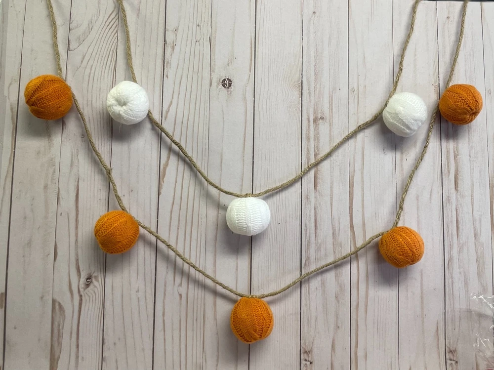Includes : Brand new cable knit pumpkins garland. Each garland is sold separately. Pattern : Round cable knit "pumpkin" shaped balls on natural jute string. Colors : Ivory or Orange pumpkins. Details : Cable knit pumpkins garland with loops at both ends for hanging. Pumpkins are approx. 2" wide. Jute string. Lightweight, cable knit pumpkins have styrofoam interior. Recommended for indoor use only. Size : 6 foot long (72"). Condition : Brand new with tags.