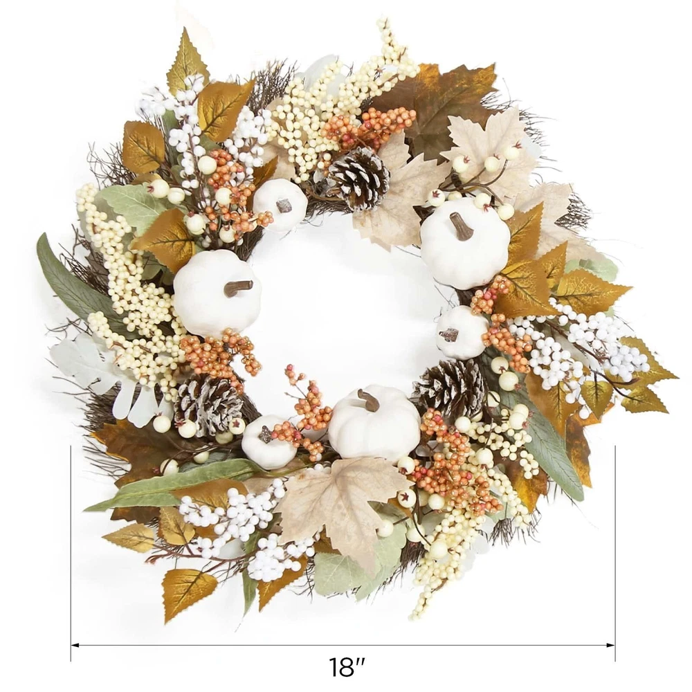 Fall Decor - Fall Wreaths for Front Door - 18 Inch Autumn Maples Leaf Pumpkin Pine Cone Berry Wreath - Fall Decorations for Thanksgiving Halloween Farmhouse Harvest Home Outdoor Indoor Window Wall Product Details Color: White Brand: ORIENTAL CHERRY Material: Pine, Maple Mounting Type: Door Mount,Wall Mount Shape: Round Product Dimensions: 13.5"D x 13.5"W x 4"H Seasons: fall Occasion: halloween, thanksgiving Manufacturer: ShenZhen MaoDun MaoYi YouXianGongSi Color: White Brand: ORIENTAL CHERRY Material: Pine, Maple Mounting Type: Door Mount,Wall Mount Shape: Round Product Dimensions: 13.5"D x 13.5"W x 4"H Seasons: fall Occasion: halloween, thanksgiving Manufacturer: ShenZhen MaoDun MaoYi YouXianGongSi Item Weight: 1.39 pounds Country of Origin: China Item model number: MD227 Date First Available: April 7, 2022 Wreath diameter measures about 18 " (10" base). The ideal size for your home decor during Fall Harvest Thanksgiving Day . Every fall wreath is uniquely designed and completely handcrafted. This fall wreath decorated with white pumpkin, maple leaves, berries, and pine cones, brighten up your home. Decorate your door with white pumpkin on fall wreath for a mix of modern and country. Suitable to use for front door, window, fireplace, wall, indoor outdoor activities and all kinds of festive.