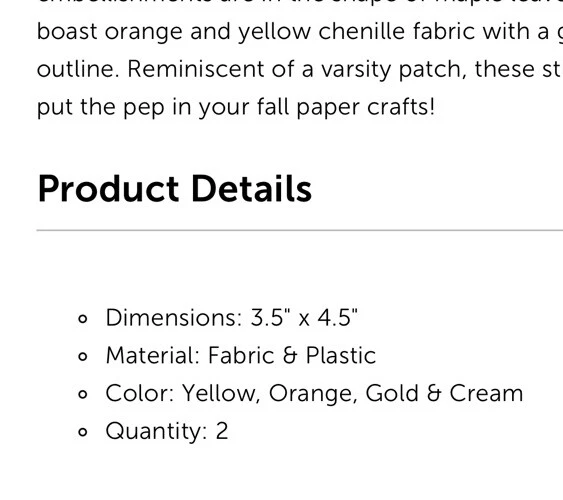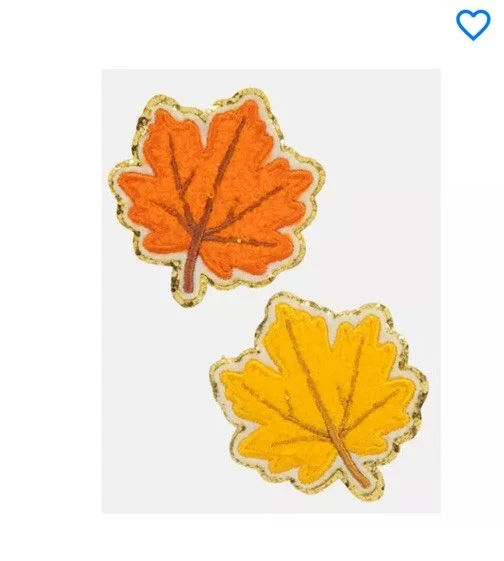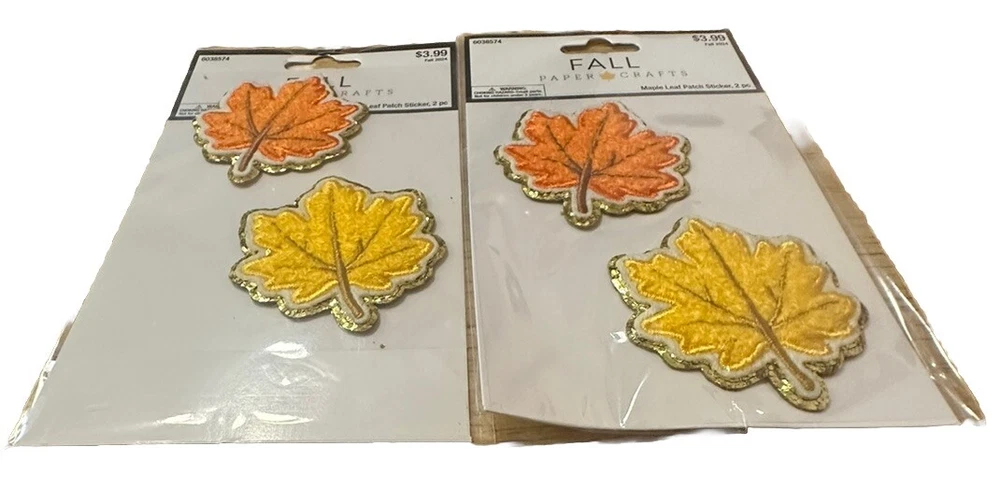 Fall Paper Craft 2 Sets Maple Leaf 🍁 Patch Stickers 3.5"x4.5" Yellow Orange Gold Three cheers for these Maple Leaf Patch Stickers! These embellishments are in the shape of maple leaves that boast orange and yellow chenille fabric with a gold glitter outline. Reminiscent of a varsity patch, these stickers will put the pep in your fall paper crafts!