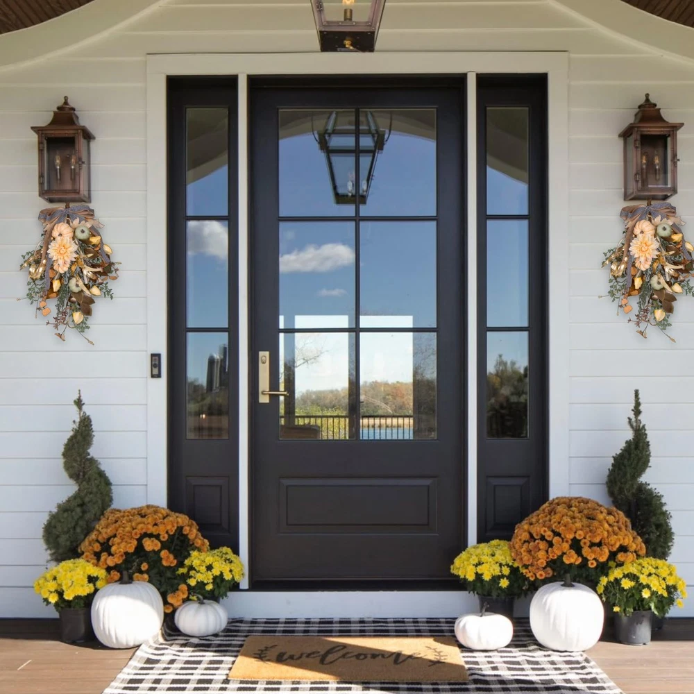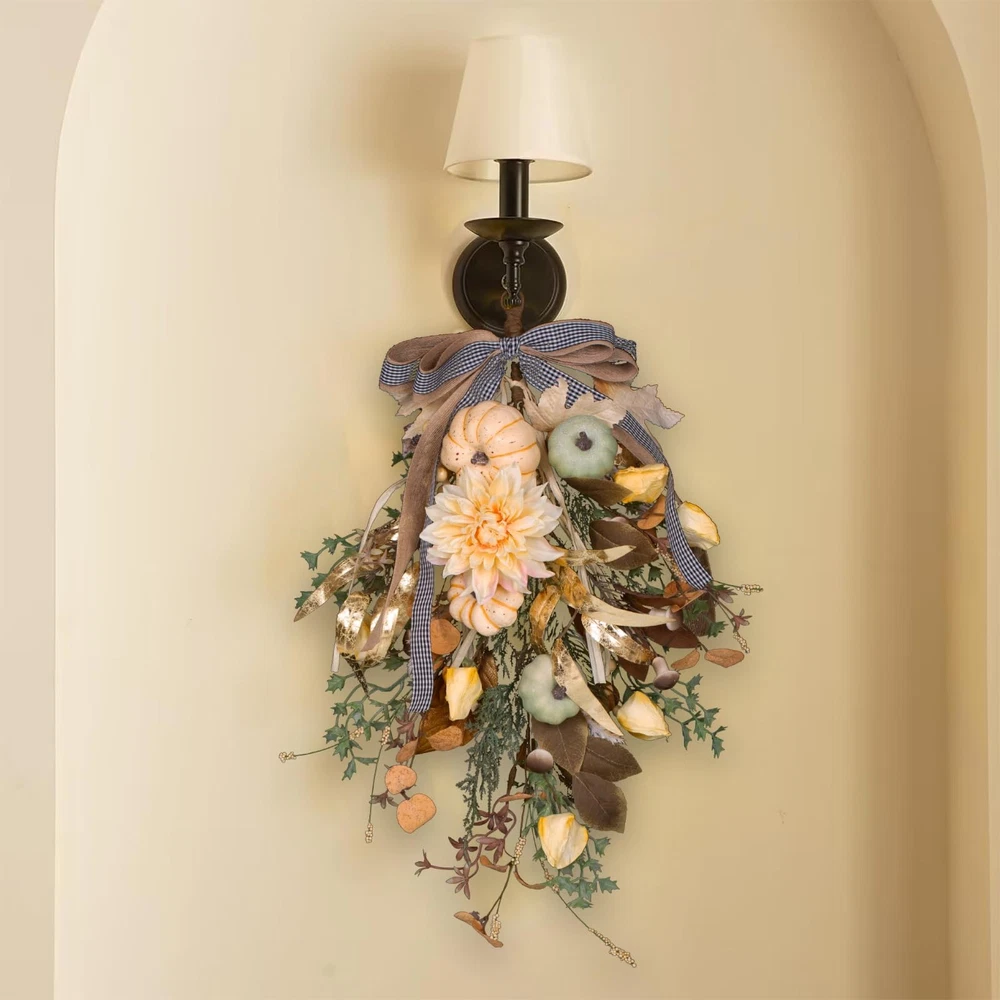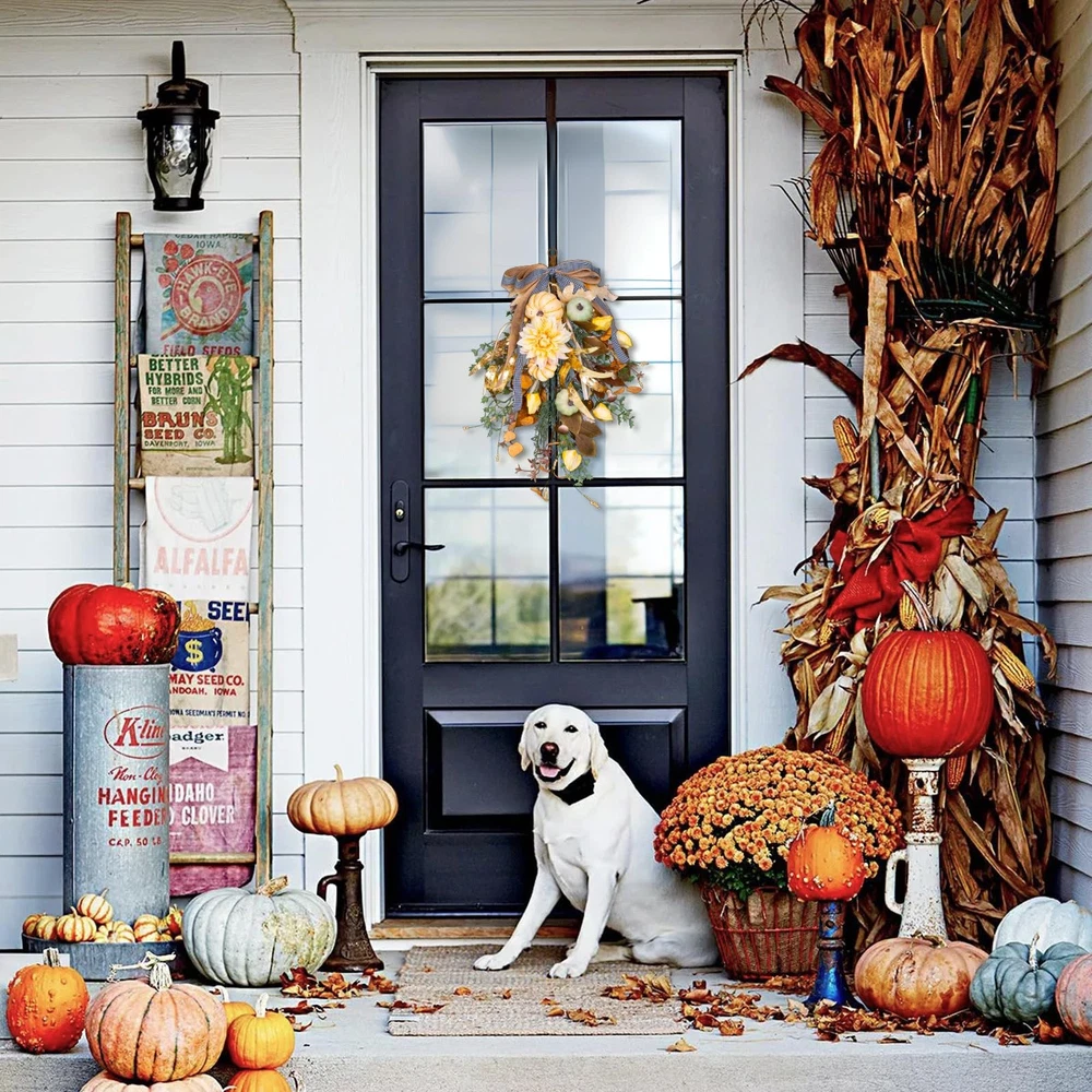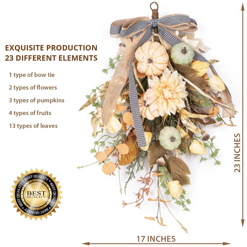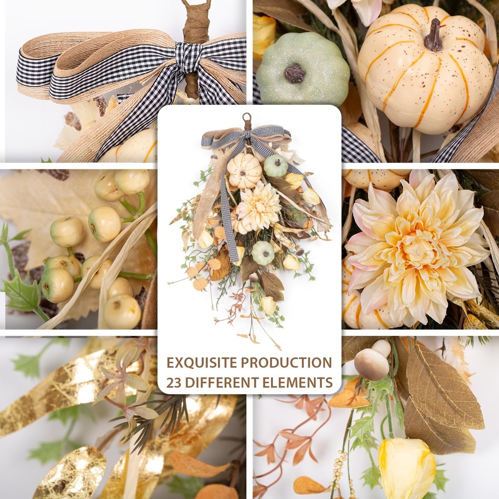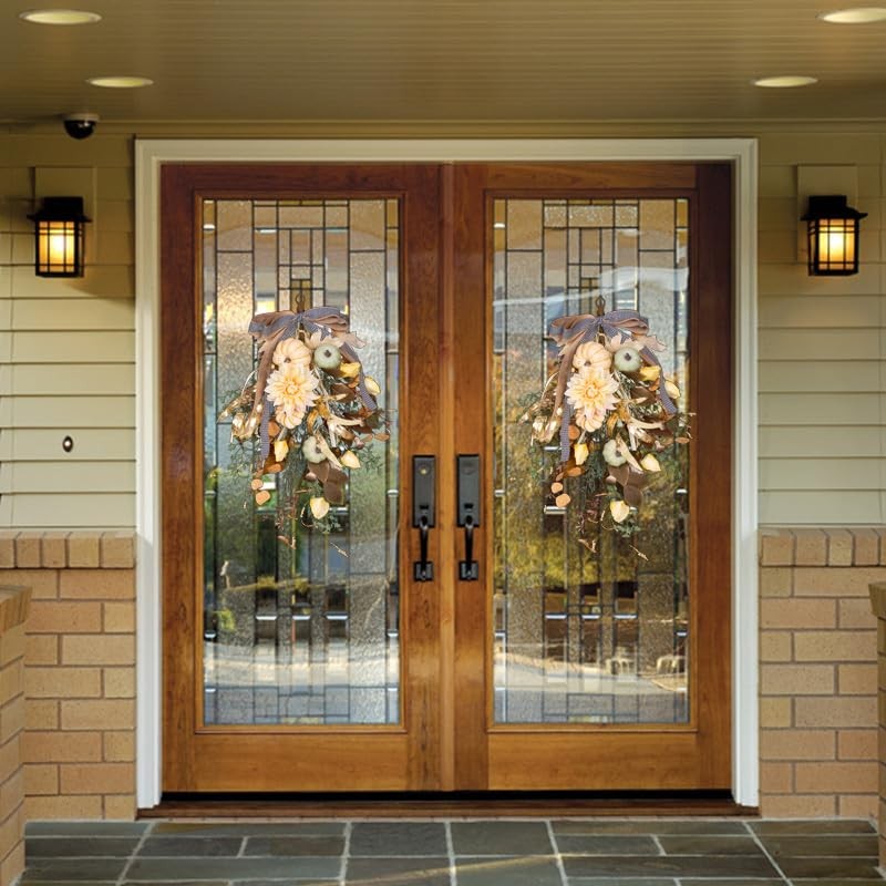 Fall Wreath Pumpkin Flower Wreath With Bow for Home Front Door Autumn Wall Hanging Teardrop Wreath for Window Home Porch Farmhouse Patio and Garden Thanksgiving Day Decoration 🍁Rich Autumn Elements: This autumn wall hanging features a rich array of fall elements, including vibrant maple leaves, yellow and green pumpkins, yellow dahlias, yellow lantern fruits, golden willow leaves, mushrooms, frosted mistletoe, clematis, eucalyptus leaves, large and small berries, and four different types of wild grasses. The added bow completes the harmonious and layered design, making it perfect for anyone looking for a comprehensive fall décor piece. 🎃Vibrant and Layered Colors: The wall hanging boasts a vibrant color palette with layers of autumnal shades, creating a warm and inviting atmosphere. This makes it an ideal autumn decoration for those seeking a colorful and festive fall wall décor or Thanksgiving wall hanging. 🍂High-Quality Craftsmanship: Made from premium materials, this autumn wall hanging is designed for durability and longevity. The high-quality construction ensures it can be enjoyed year after year, whether used indoors or outdoors as an autumn door decoration or fall porch hanging. 🌟Versatile Seasonal Décor: Perfect for hanging on walls, doors, mantels, or porches, this autumn wall hanging adds a touch of seasonal charm to any space. Its versatile design makes it suitable for a variety of settings, such as a farmhouse wall décor, autumn home decoration, or harvest-themed decoration. 🖐️Easy to Hang and Maintain: Equipped with a sturdy hanging loop, this wall hanging is easy to install and requires minimal maintenance. It’s an excellent choice for those looking for a hassle-free autumn decoration or Thanksgiving wall hanging that retains its beauty throughout the season.