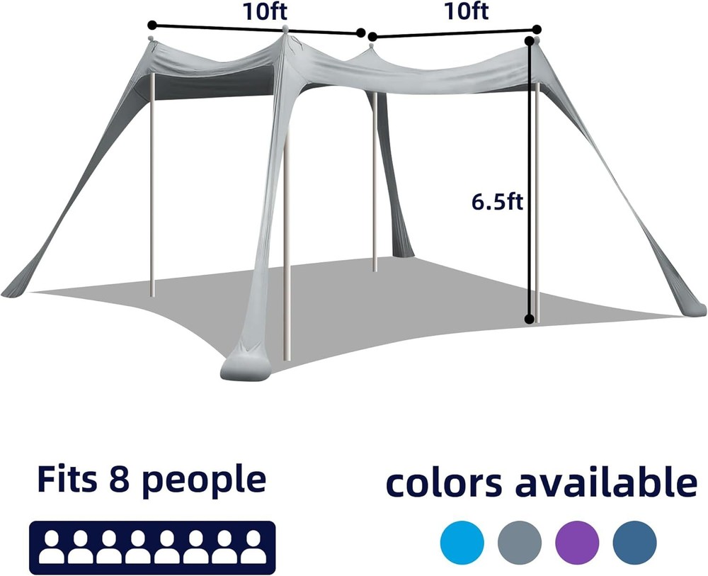 About this item 【Gigante Beach Tent】 The beach canopy tent sun shade have different size Large (10*10)ft, Medium (7*7.5)ft. Tall stability poles keep entire beach shade canopy area stays at full height that increasing the shaded area, can hold up to 6-8 people for couples, family and friends party or outdoor picnics 【Advanced Sun Protection】 Designed with the highest quality Lycra fabric and offering UPF 50+ sun coverage and water-resistant function, lightweight beach canopy tent sun shade can shade your outdoor beach holiday. Family beach tent durable materials are not afraid of stretching and tearing 【Stable Windproof Performance】 Fill the sandbag with sand or stones as much as possible which makes this portable beach sun shade canopy has better wind resistance. You use beach shade tent over sandy beaches, thick grassy areas, or even in rocky camping spots 【Wonderful Choices Beach Tent Up Shade】 You can also build compact beach sun shelter on gardens, backyards, lawns, sand, picnic, garden, group activities, field training, dummer camp,vehicle shading even rock campsites. Simply adjust sand anchors or the poles to change the angle of the shade to get the best sunshade 【Easy to install & Portable】 Follow the instructions even 1 person can install quickly. Reinforced poles attached with a elastic cord preventing moving, ground stakes and fillable sandbag anchors make beach unbrella more stable. The sun shade for the beach comes with a travel carry bag to keep the sun shelter kit all organized