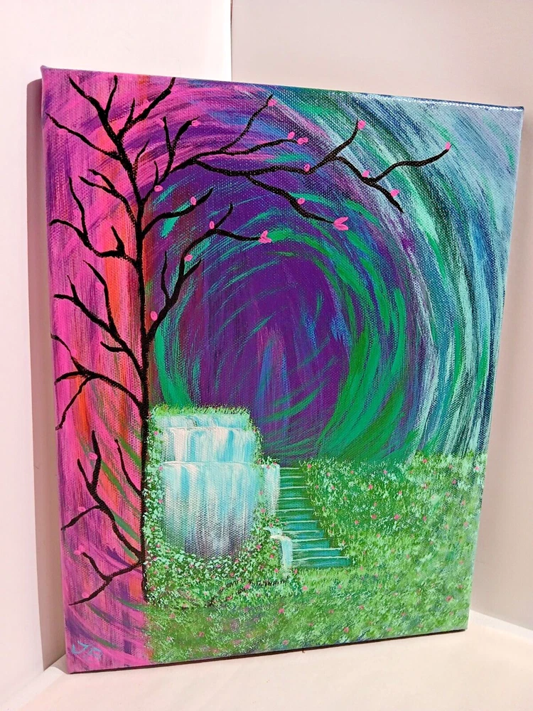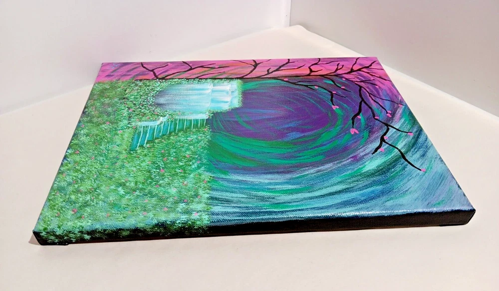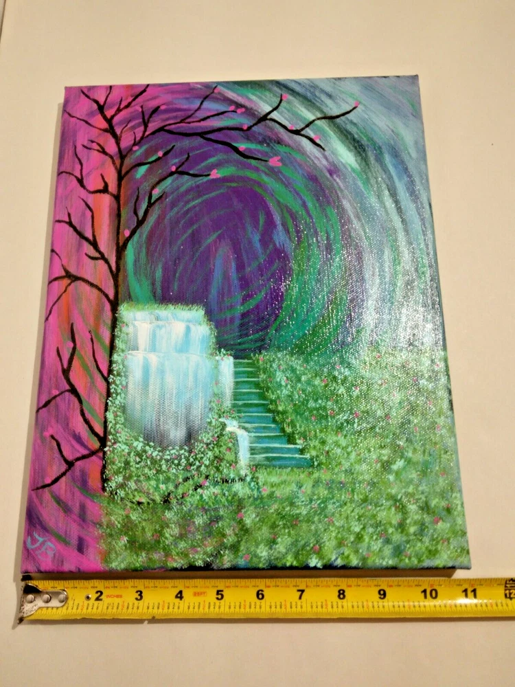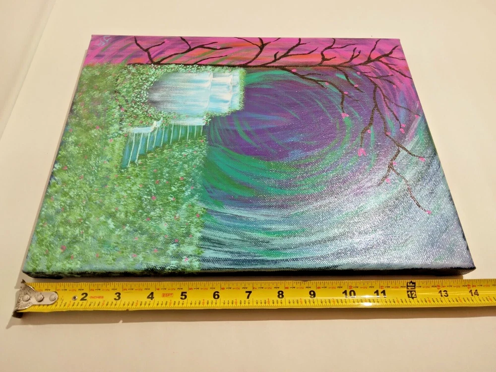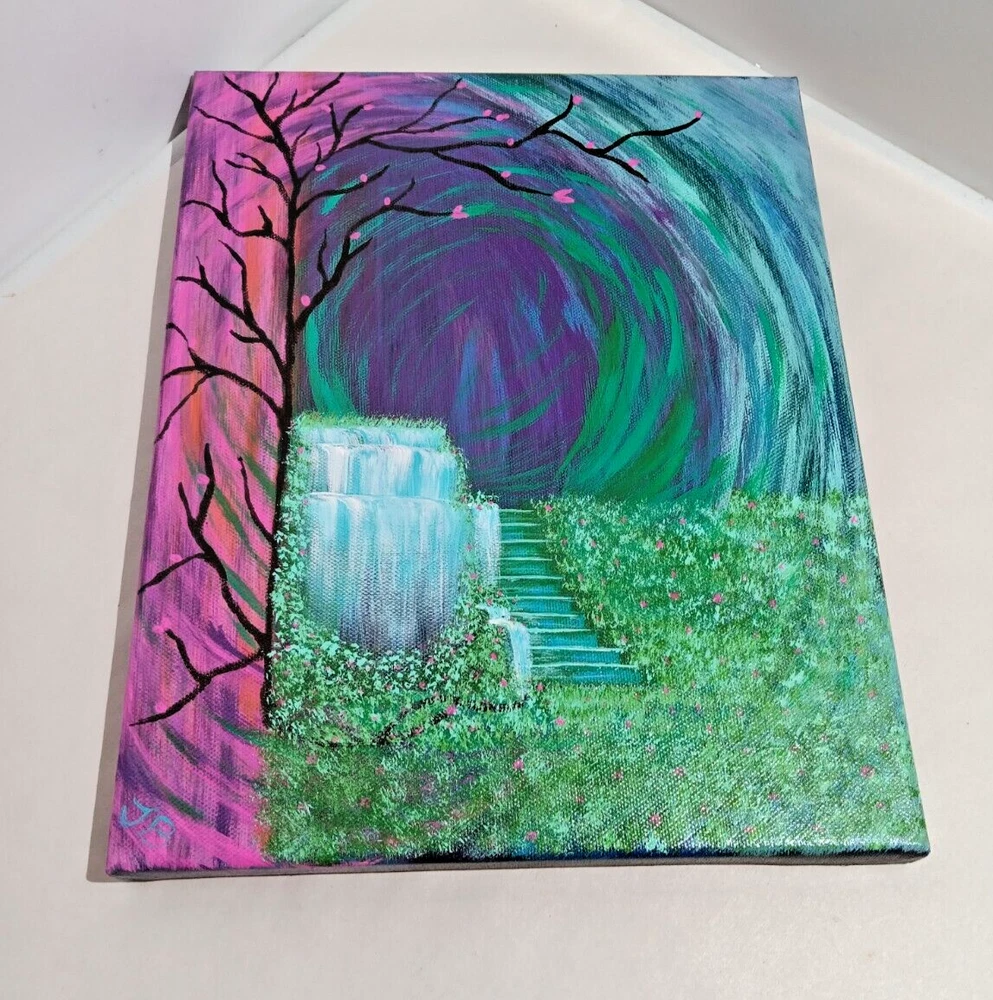 "Fantasy World” 11"x 14" Original Acrylic Painting on Framed Stretched Canvas with beautiful vibrant colors. I am the artist of this painting, it was painted last year and I signed it JB, it was finished with a glossy varnish. See photos for details and measurements. Fast shipping and carefully packed!