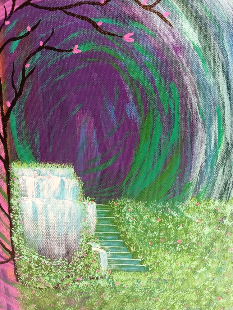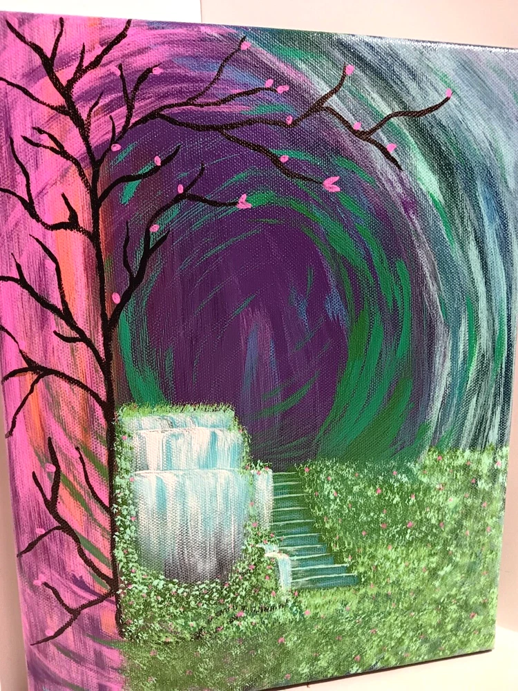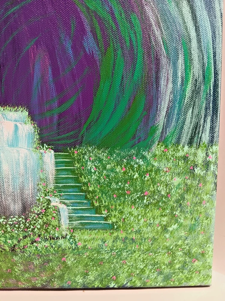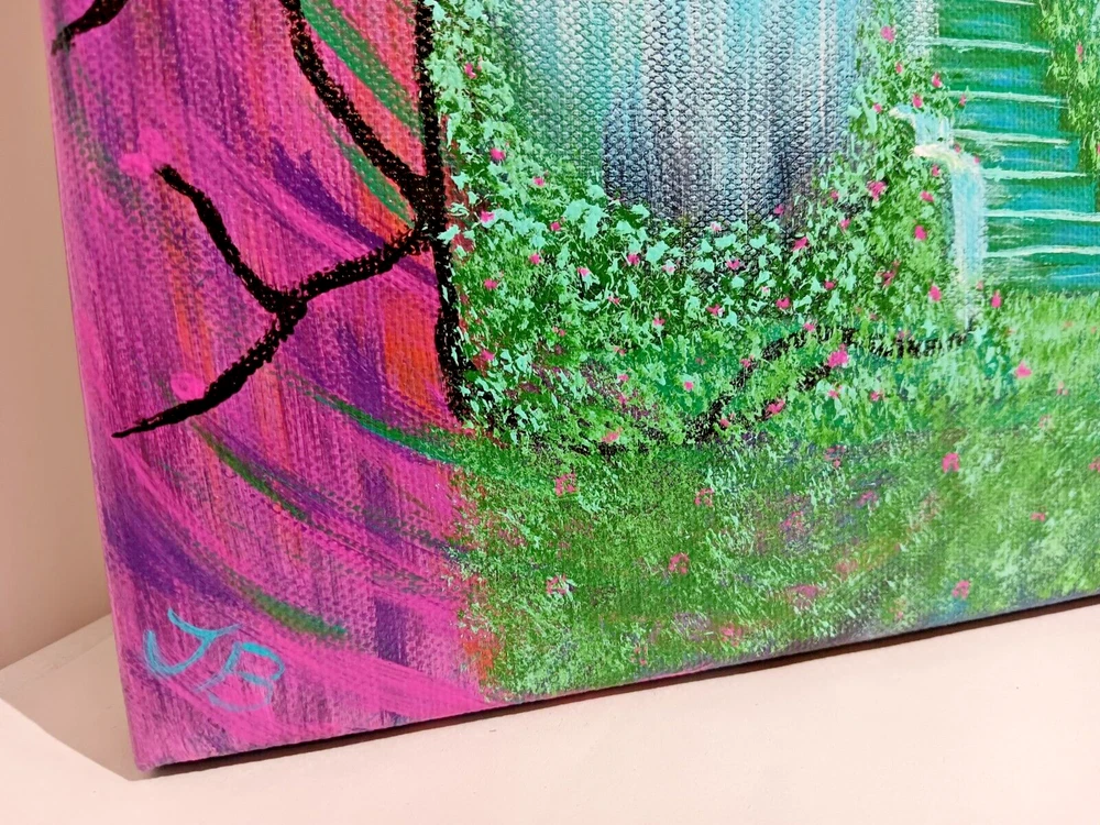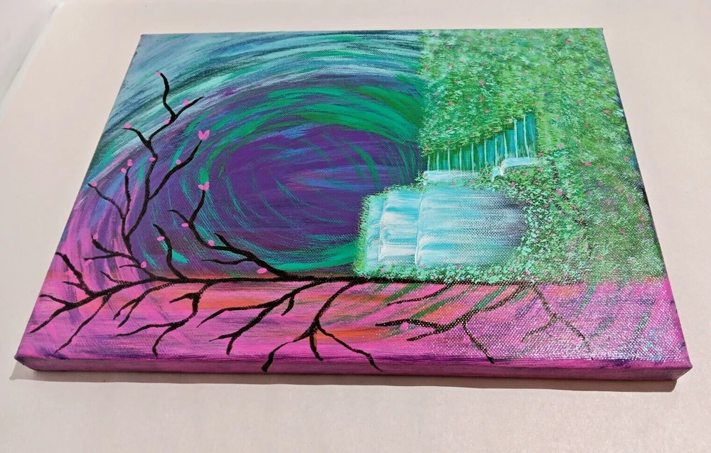 "Fantasy World” 11"x 14" Original Acrylic Painting on Framed Stretched Canvas with beautiful vibrant colors. I am the artist of this painting, it was painted last year and I signed it JB, it was finished with a glossy varnish. See photos for details and measurements. Fast shipping and carefully packed!