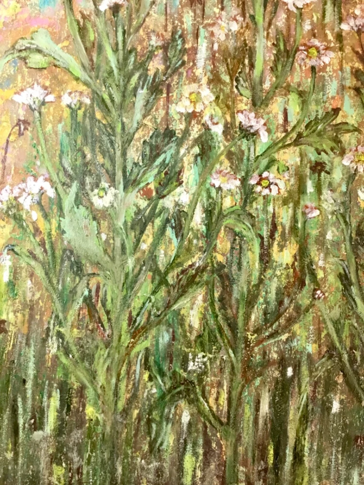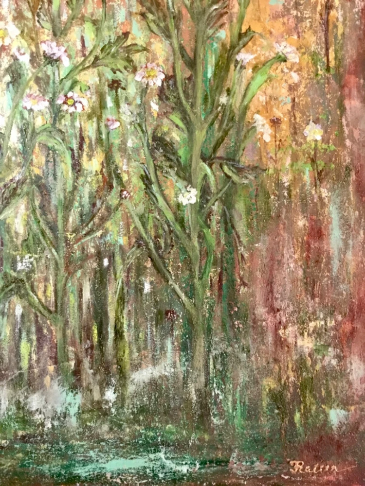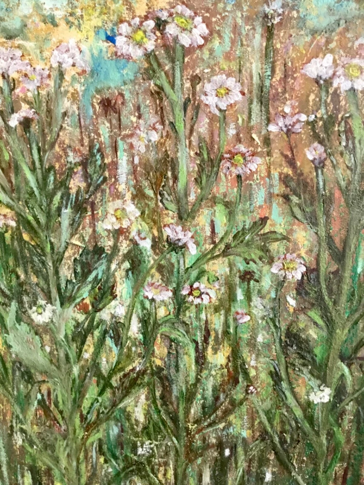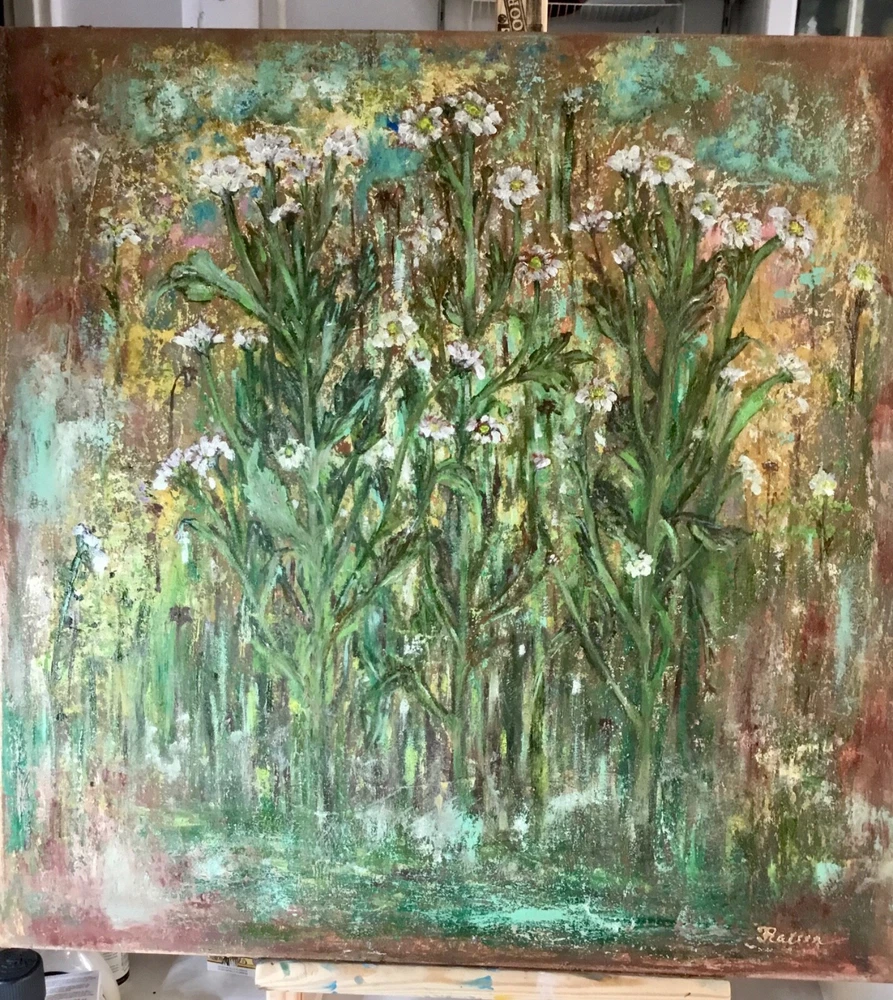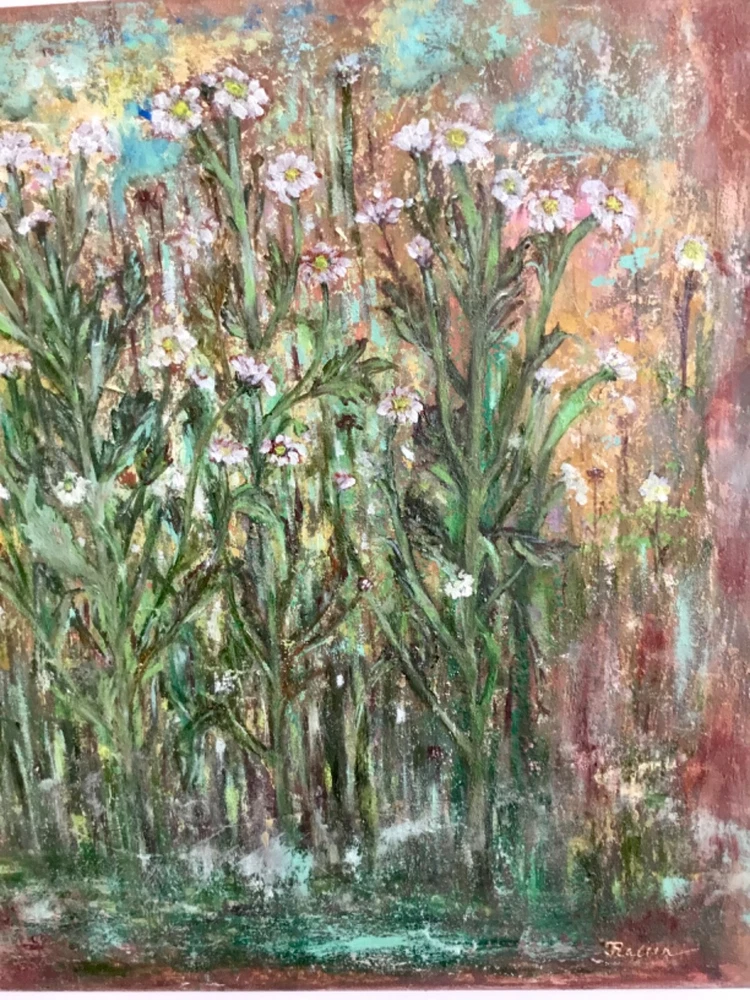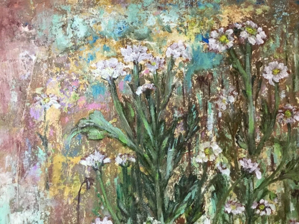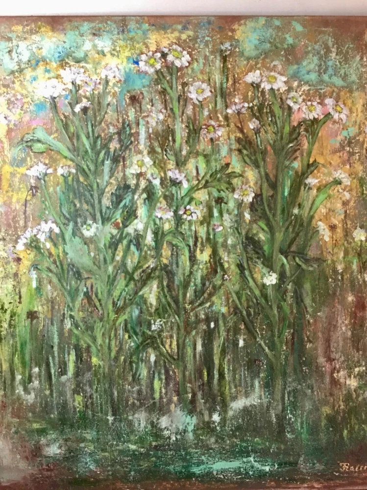 Fantasy of chrysanthemums forest on the abstract mixed media background , oil painting on stretched canvas. Original art work. Size 40/50 sm/19.6/15.7 inches. Vanished for protection.