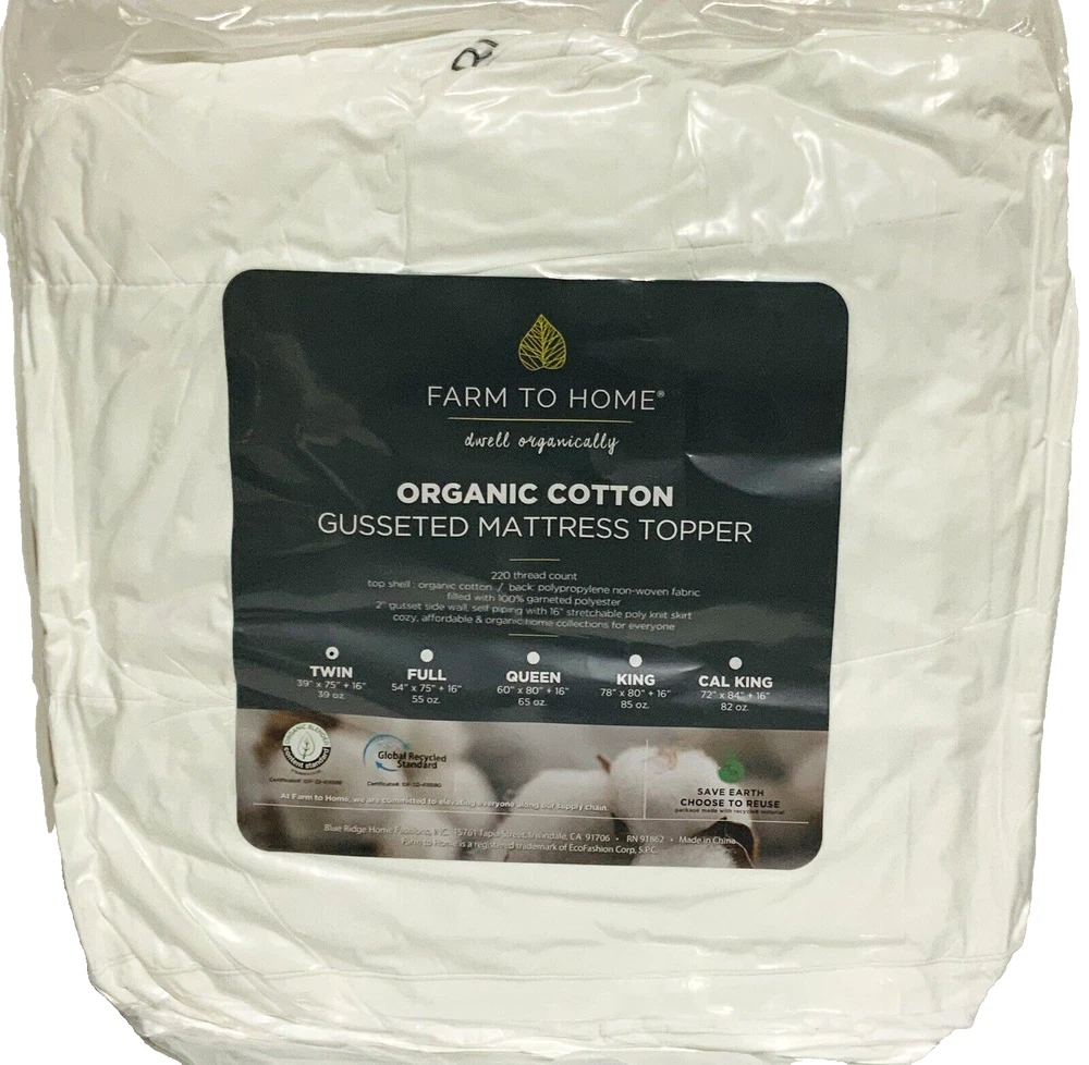 Farm to Home White Organic Cotton 2” Mattress Topper Twin White. Condition is New with tags. - FREE SHIPPING Indulge in the comfort of the Farm to Home Organic Cotton Mattress Topper, tailored to enhance your sleep experience with a perfect blend of softness and support. Constructed from premium organic cotton and filled with 100% garneted polyester, this twin-sized topper is a testament to luxury. Its solid white color and traditional style seamlessly integrate into any bedroom decor. The topper features a breathable design, suitable for all seasons, and is equipped with a stretchable skirt for a snug fit. Measuring 39 inches in length and 75 inches in width, it provides ample coverage for a restful night's sleep. Certified by the Global Recycled Standard and Organic Blended Content Standard, it promises quality and environmental responsibility. Plus, machine washability ensures easy care and maintenance.