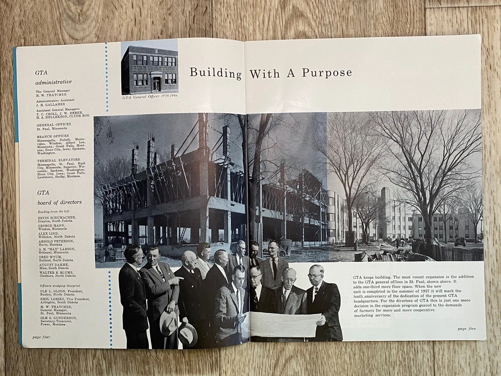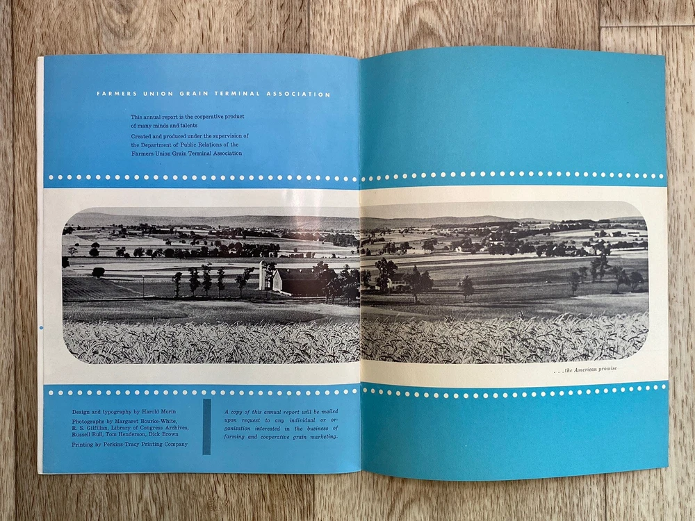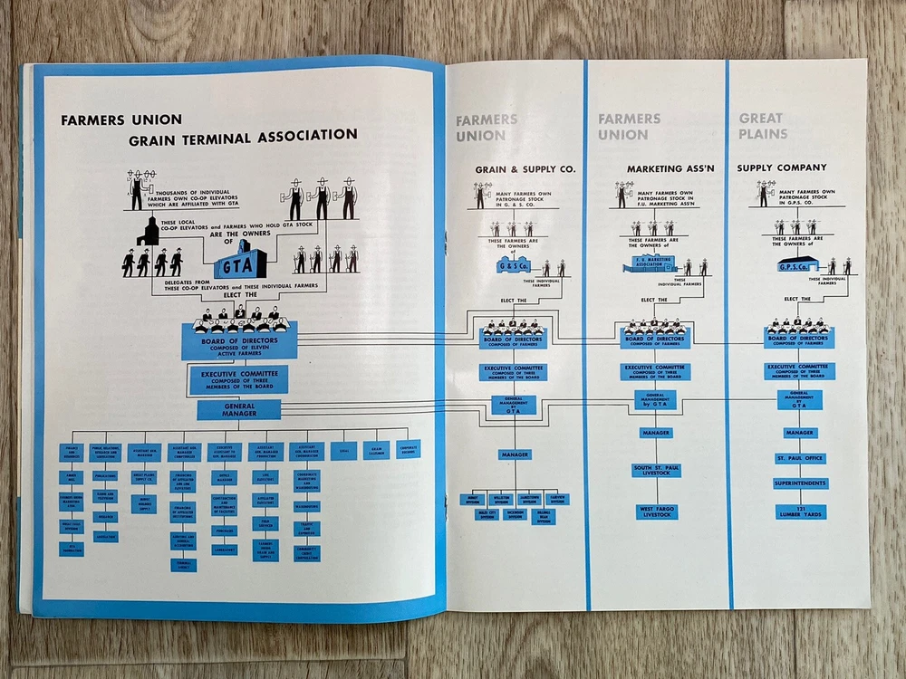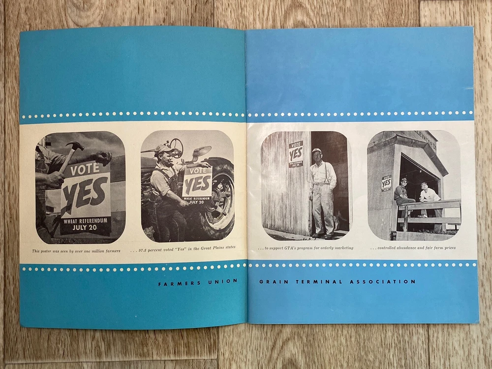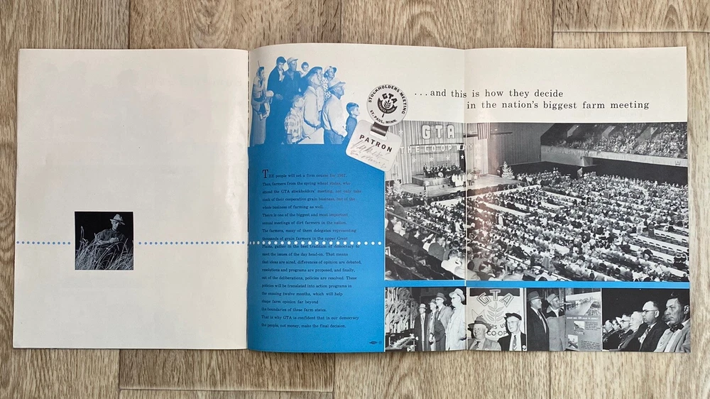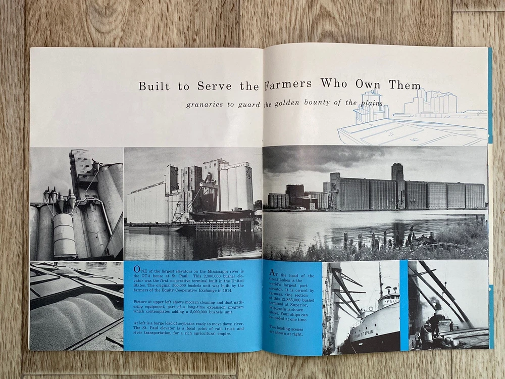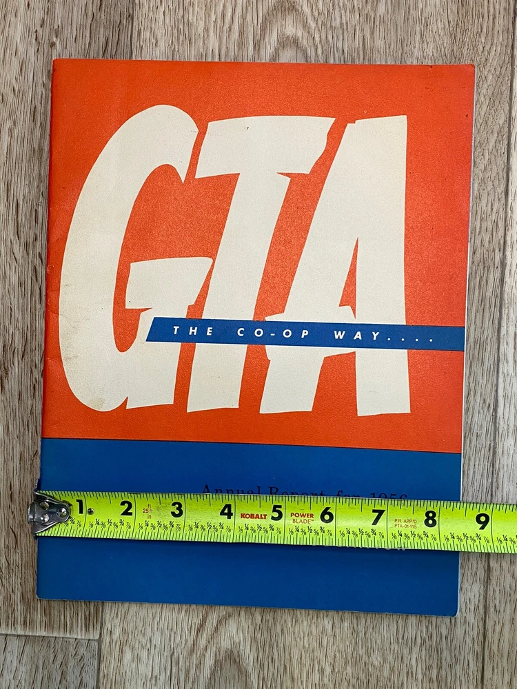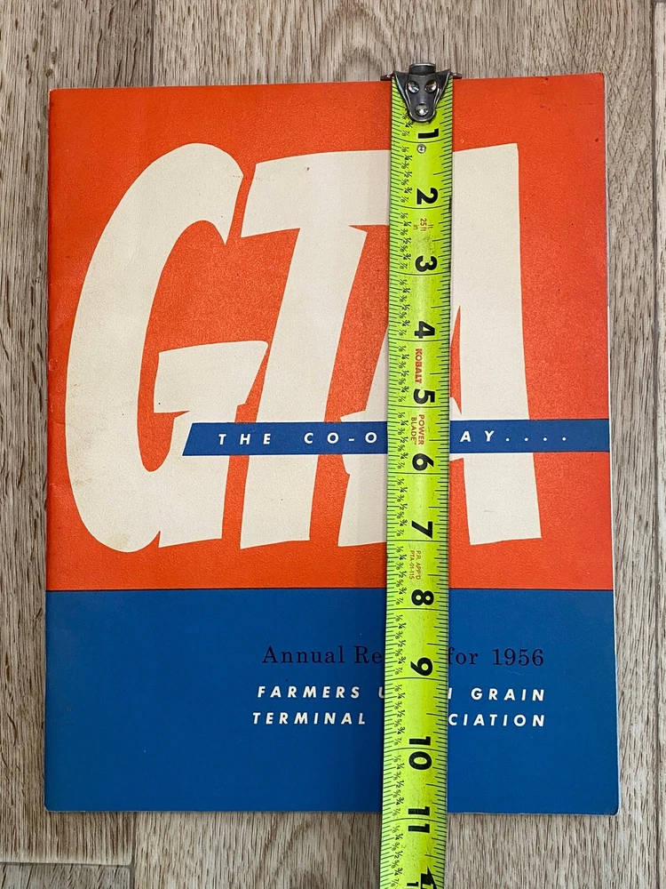GTA the co-op way…. Annual report for 1956. Farmers Union Grain Terminal Association. Lots of great photos. Condition is used. Black, white, & blue colors within the pages. Fold out page towards the end. Please see the photos for the complete description.
