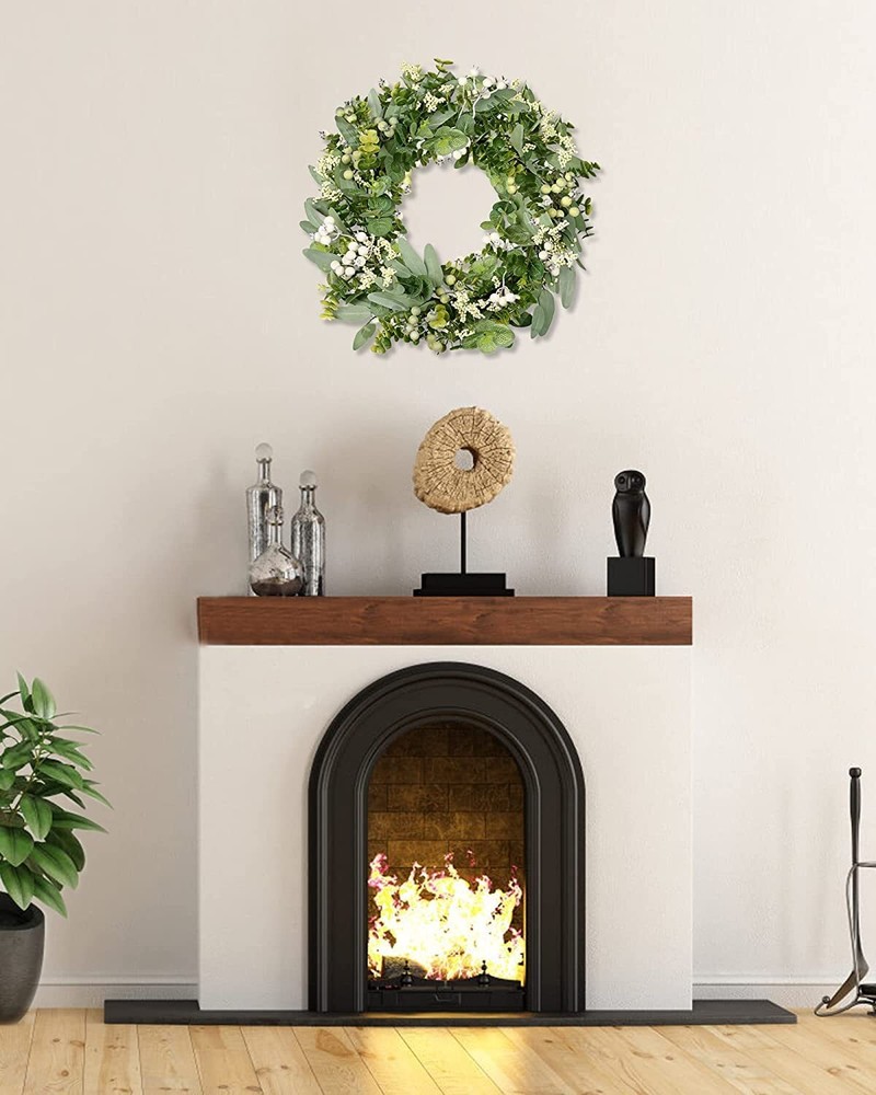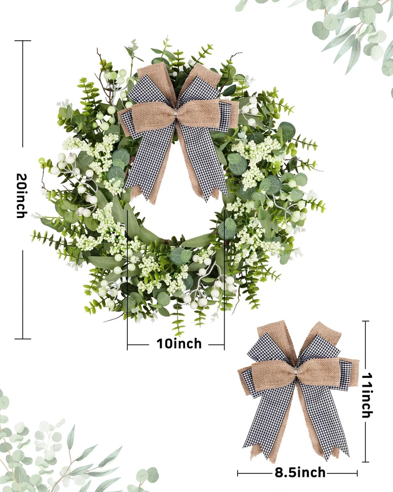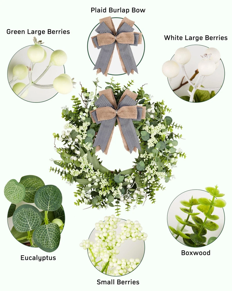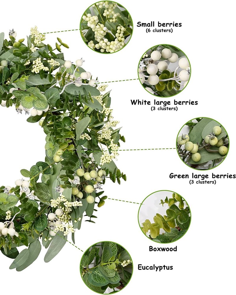 Features: 【All year round wreath】Available all year round:spring, summer, fall, and winter. Add themed decorations according to the festival, this is a flexible and versatile wreath. 【Full and realistic】Handmade green eucalyptus wreath features eucalyptus leaves, boxwood, white/green berries, andmany small berries embellishedon it, making the wreath full, natural and realistic. Its elegance add a vibrant and pleasant vibe to your home. 【Perfect Size】 This spring wreath is 19/20 inches in diameter. Each rustic farmhouse eucalyptus wreath is packed in a sturdy and exquisite box, suitable as a gift for friends. Note that because the wreath is compressed by the box to avoid being damaged during delivery, please fully stretch it to reach its maximum size. 【Versatile】This gorgeous wreath is a versatile decoration. It is suitable for all seasons of the year, spring, summer, fall and winter. You can add elements from each season, such as bells and pinecones, to turn it into a Christmas wreath. When you design it yourself, you will find that your wreath is the most unique scenery. It can be hung on the wall, front door, porch, bedroom, living room, etc. It is perfect for indoor and outdoor, weddings and parties. It's elegance is sure to impress your family and friends. 【Durable】Made of high-quality materials. Colors will never fade; leaves will never fall; berries will never rot. No watering and special cleaning required. Can be used for years to come. 【Christmas Wreaths】This eucalyptus wreath with berries can be turned into a Christmas wreath by tying a red bow, pairing it with pinecones, bells, and some red berries. It will stay with you all winter long. Specifications: Color - Green Material - Artificial Greenery Mounting Type - Door Mount Shape - Round Product Dimensions - 19"D x 19"W x 4"H//20"D x 20"W x 4"H Special Feature - Handmade, High-quality Materials, Long-lasting, Indoor/Outdoor Use Package List: 1PC
