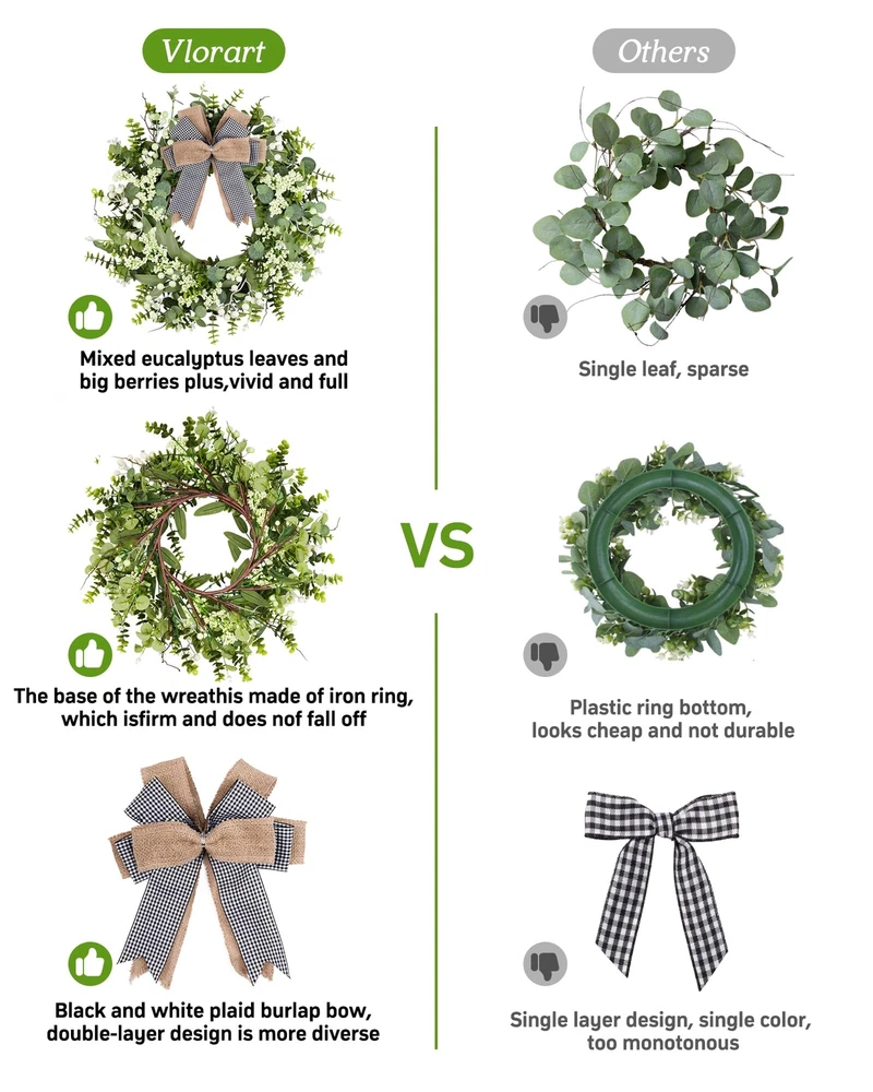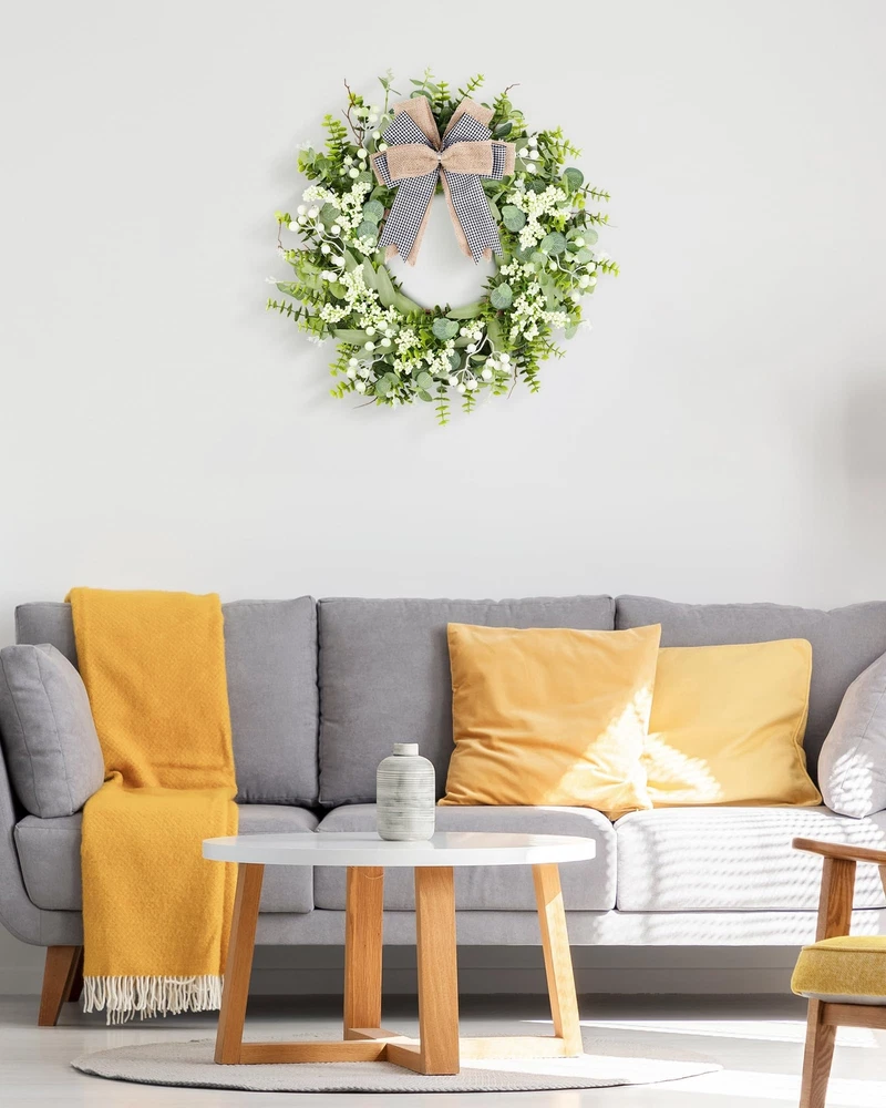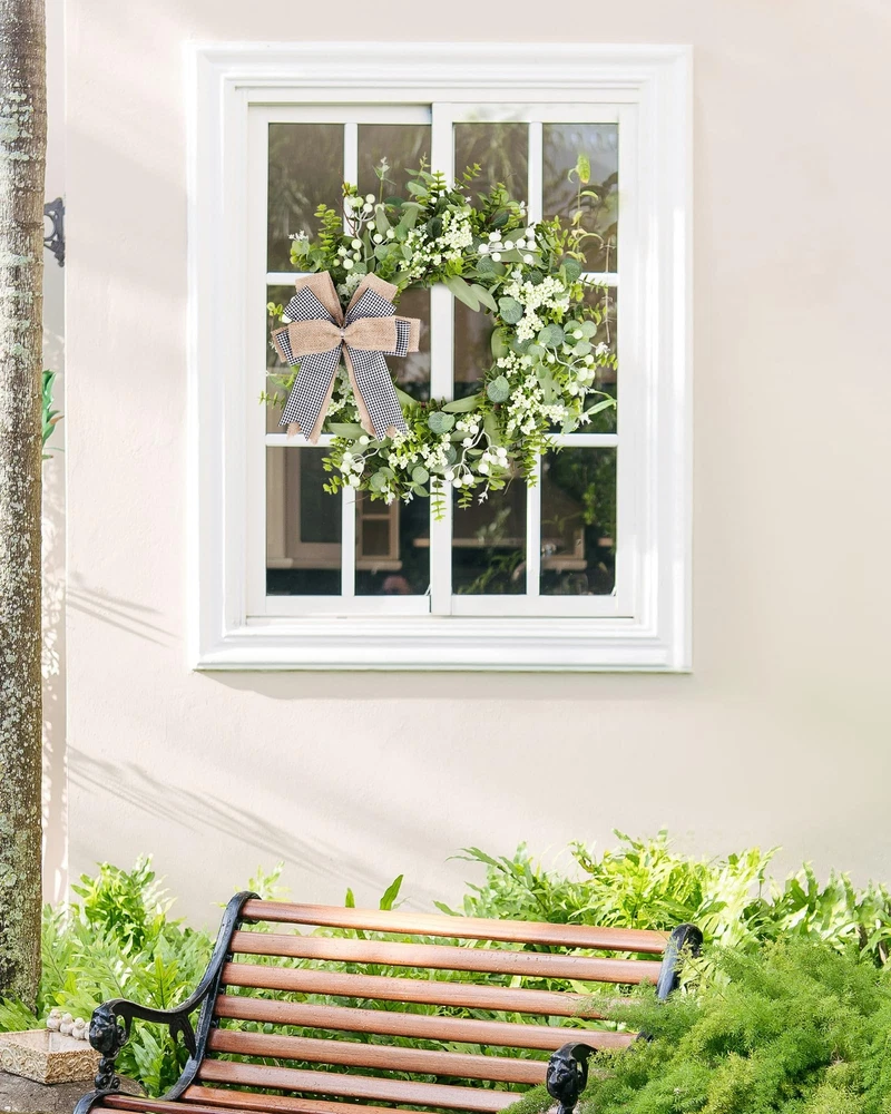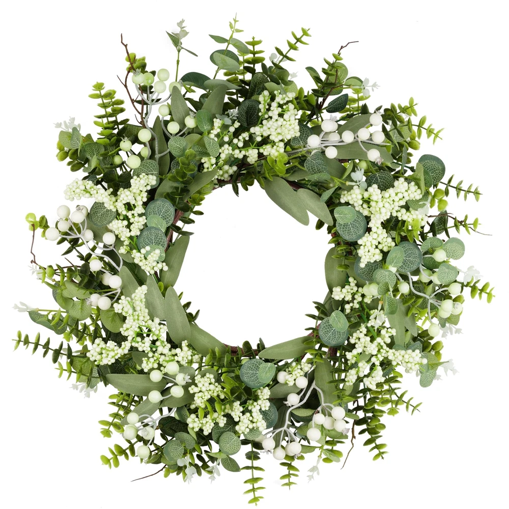 Features: 【All year round wreath】Available all year round:spring, summer, fall, and winter. Add themed decorations according to the festival, this is a flexible and versatile wreath. 【Full and realistic】Handmade green eucalyptus wreath features eucalyptus leaves, boxwood, white/green berries, andmany small berries embellishedon it, making the wreath full, natural and realistic. Its elegance add a vibrant and pleasant vibe to your home. 【Perfect Size】 This spring wreath is 19/20 inches in diameter. Each rustic farmhouse eucalyptus wreath is packed in a sturdy and exquisite box, suitable as a gift for friends. Note that because the wreath is compressed by the box to avoid being damaged during delivery, please fully stretch it to reach its maximum size. 【Versatile】This gorgeous wreath is a versatile decoration. It is suitable for all seasons of the year, spring, summer, fall and winter. You can add elements from each season, such as bells and pinecones, to turn it into a Christmas wreath. When you design it yourself, you will find that your wreath is the most unique scenery. It can be hung on the wall, front door, porch, bedroom, living room, etc. It is perfect for indoor and outdoor, weddings and parties. It's elegance is sure to impress your family and friends. 【Durable】Made of high-quality materials. Colors will never fade; leaves will never fall; berries will never rot. No watering and special cleaning required. Can be used for years to come. 【Christmas Wreaths】This eucalyptus wreath with berries can be turned into a Christmas wreath by tying a red bow, pairing it with pinecones, bells, and some red berries. It will stay with you all winter long. Specifications: Color - Green Material - Artificial Greenery Mounting Type - Door Mount Shape - Round Product Dimensions - 19"D x 19"W x 4"H//20"D x 20"W x 4"H Special Feature - Handmade, High-quality Materials, Long-lasting, Indoor/Outdoor Use Package List: 1PC