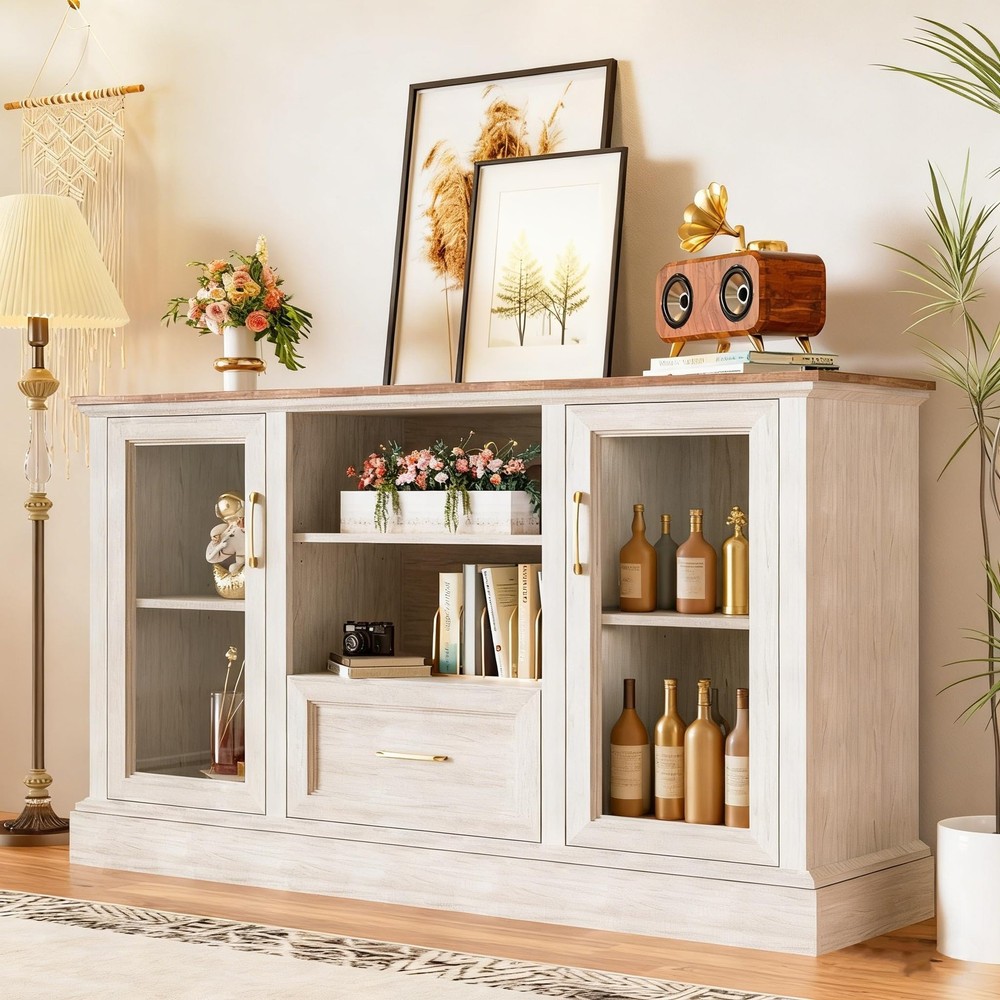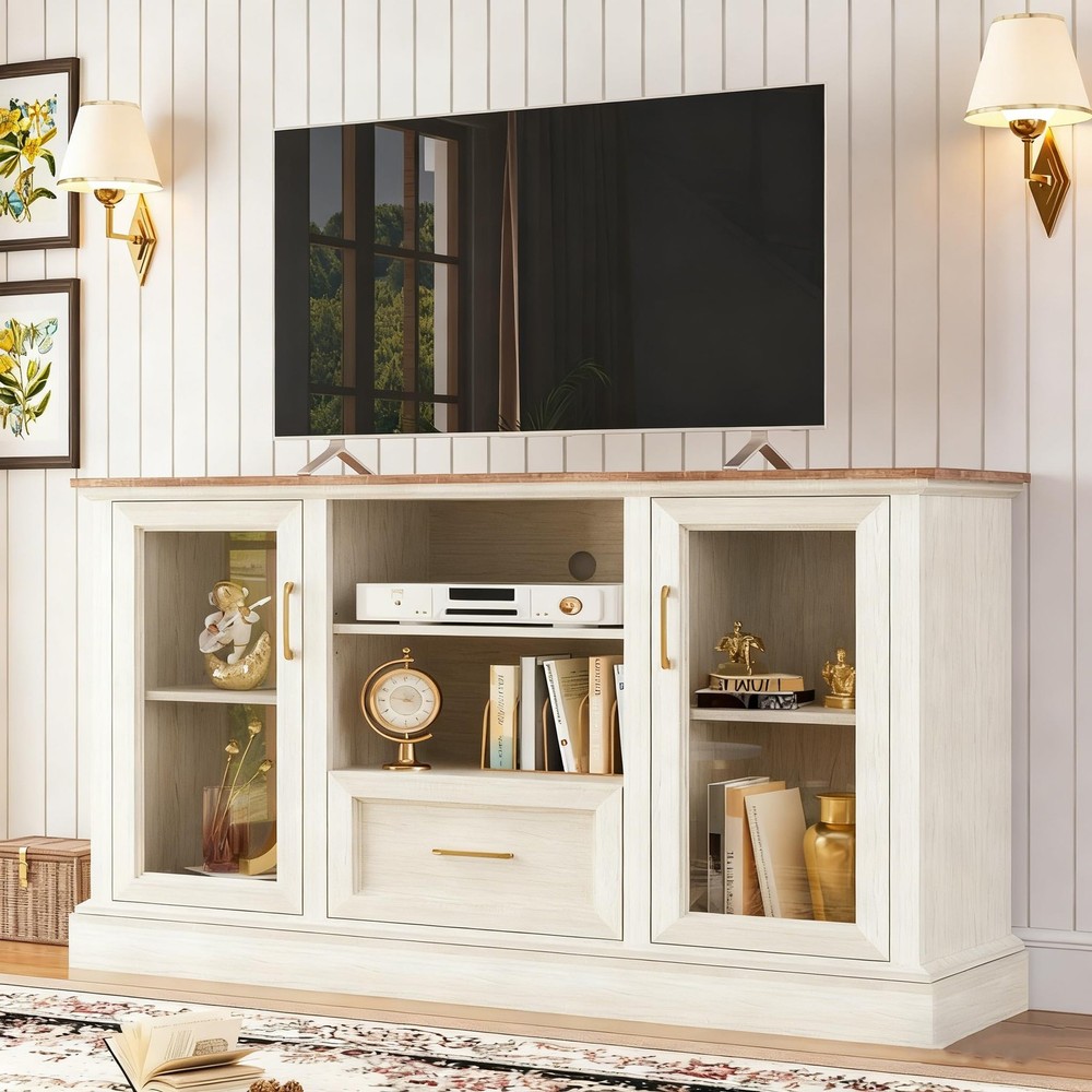 Farmhouse TV Stand for 55/60/65 Inch TV, Tall Media Console with 2 Glass Doors & 3 Adjustable Shelves, Wood Entertainment Center with Cubbies & Drawers for Living Room, Rustic White About this item 1、Timeless Farmhouse Charm: The TV stand showcases a classic farmhouse suitable with a beautifully textured wood grain finish, adding a warm and rustic charm to any living space. Perfectly complements other furniture in your home. Suitable for TVs up to 65 inches. 2、Ample Storage with Adjustable Shelves: Featuring a spacious cabinet with tempered glass doors and adjustable shelves, this TV console offers versatile storage for media devices, decor, and more. Customize the shelf heights to fit your needs. 3、Easy Cable Management: Keep your entertainment space neat and organized with the built-in cable management holes on the back panels. The 2" diameter openings allow for easy routing of cables, maintaining a clutter-free environment. 4、Durable Construction for Long-Lasting Use: Crafted from high-quality MDF with a reinforced structure, this TV cabinet ensures stability and durability. The 1.57" thick top panel and sturdy base support up to 150 lbs, making this media console perfect for holding your TV and other items securely. 5、Easy Assembly and Secure Packaging: Comes with clear, step-by-step instructions and all necessary hardware labeled for easy assembly. Secure packaging with protective foam and boards ensures your TV stand arrives in perfect condition. Free Shipping to Most US area! Please note that Certain automotive parts may be subject to regulatory restrictions in the state of California (CA), which can prevent us from shipping these items to addresses within CA. Destinations including Puerto Rico (PR), U.S. Virgin Islands (VI), Guam (GU), Northern Mariana Islands (MP), (AS) , (AK) ... are considered U.S. territories but may be subject to extended delivery timelines and additional shipping fees due to their remote locations. We encourage customers placing orders to these areas to contact us prior to completing your purchase, so we can confirm shipping availability and any potential surcharges. Thank you for your understanding. On Feb 5, 2026 at 08:24:20 PST, seller added the following information: