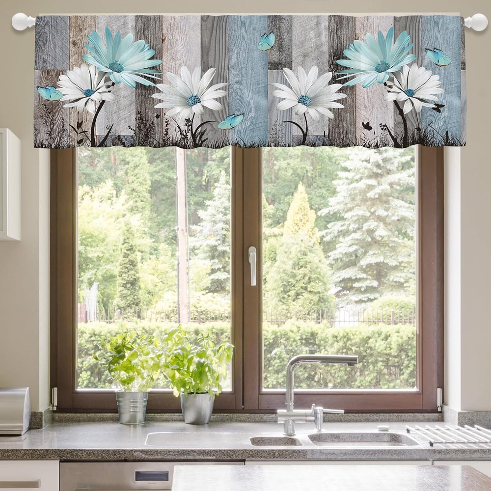 100% Polyester ��Material��Soft polyester fabric and light filtering farmhouse floral teal daisy curtain valance which will decorate your bathroom, living room, bedroom or kitchen and also provide privacy. Machine washable and hand washing recommended. You can iron at low temperature if needed. ��Size��55"Wx18"L for one panel (All dimensions are measured manually with deviation ranged at 1-3cm). Each panel has 2.4 inch high pole pocket, which works well with tension rods or normal rods, easy to install and slide. It is recommended to use a rod with a diameter of 1.2 inch or less. ��ITEM INCLUDES��1 panels farmhouse teal blue daisy flower kitchen window valance curtain for bathroom,living room, bedroom. ��USAGE��Farmhouse floral teal daisy window valance curtain, small short cafe valance curtains, kitchen valance curtains, bathroom and Bedroom valance curtains for kids/boys/girls/child ,living room curtains,baby room decor,nursery curtains,curtains in preschool classroom,playroom,TV room,kitchen,also can be used as window blinds,window shades,doorway curtain for home. ��Support And Service��Your suggestion is very important for us to improve our service and product quality. Just feel free to contact us if you have any questions.