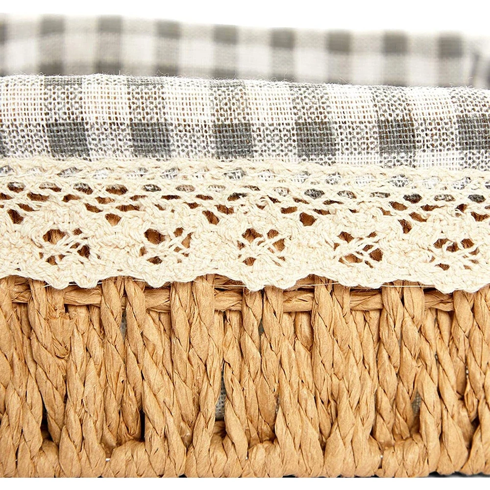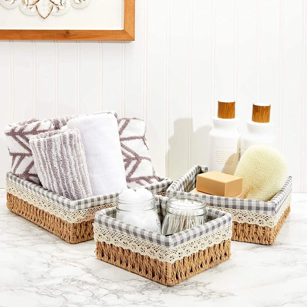 Our 3 baskets for organizing are perfect for those who want functionality and style in their home storage solutions. Each basket has a removable liner, providing versatile storage for various household items, from towels and clothing to beauty products and spices. These assorted baskets for organizing can be used across multiple house rooms, including the bathroom, laundry room, kitchen, living room, and bedroom, for decorative and practical purposes. Our wicker baskets with lining are made of high-quality woven paper material, ensuring they are durable and stylish. The neutral color of the baskets makes them versatile enough to match any rustic-style or modern home decorations. They are also easy to clean and maintain, allowing you to use them for years. These baskets make great gifts for Christmas, birthdays, or housewarming parties. With 3 different sizes, you can use them separately or stack them for even more storage space. They are perfect for those who want to declutter their home while adding a touch of elegance to their decor. Basket with Liner for Organizing: Use this set of rustic-style woven wicker storage baskets for organizing home essentials like magazines, clothes, toys, craft and school supplies, and hand towels Nesting: These lined baskets stack inside of each other for convenient storage when not in use; ideal for your drawer, shelf, desk, laundry room, bathroom, nursery, or kitchen Strong and Lightweight: This set of woven wicker storage baskets for shelves is made of woven paper material, has a sturdy iron wire frame, and a removable cotton lining that is easy to clean Assorted Sizes: The wicker baskets for organizing come in 3 sizes: the large basket measures 10x3 inches, the medium basket measures 8x3 inches, and the small basket measures 7x3 inches What You'll Get: You will receive 3 wicker organizing baskets; each banana leaf basket is an excellent gift for a friend or loved one at a housewarming party, birthday party, or baby shower