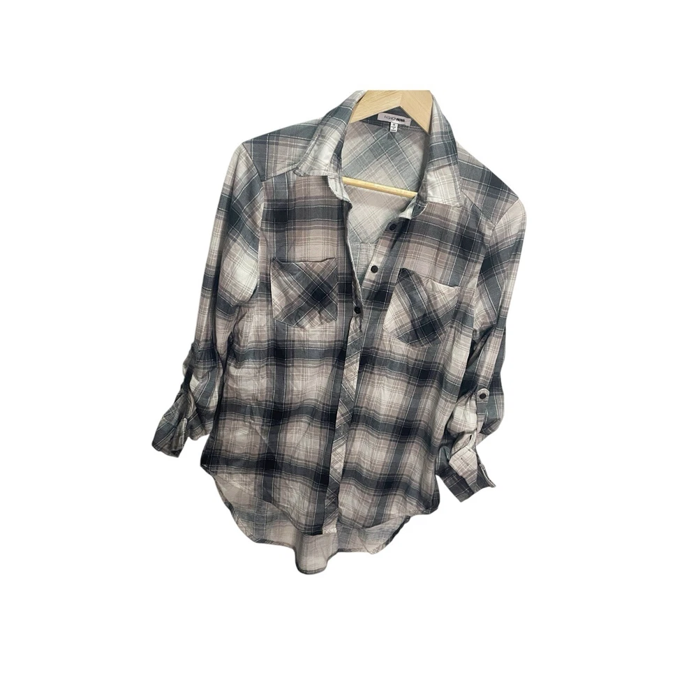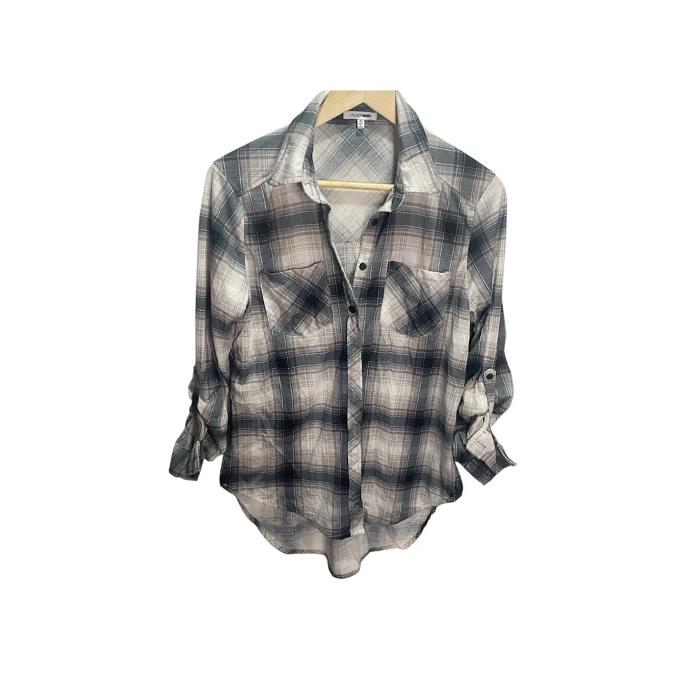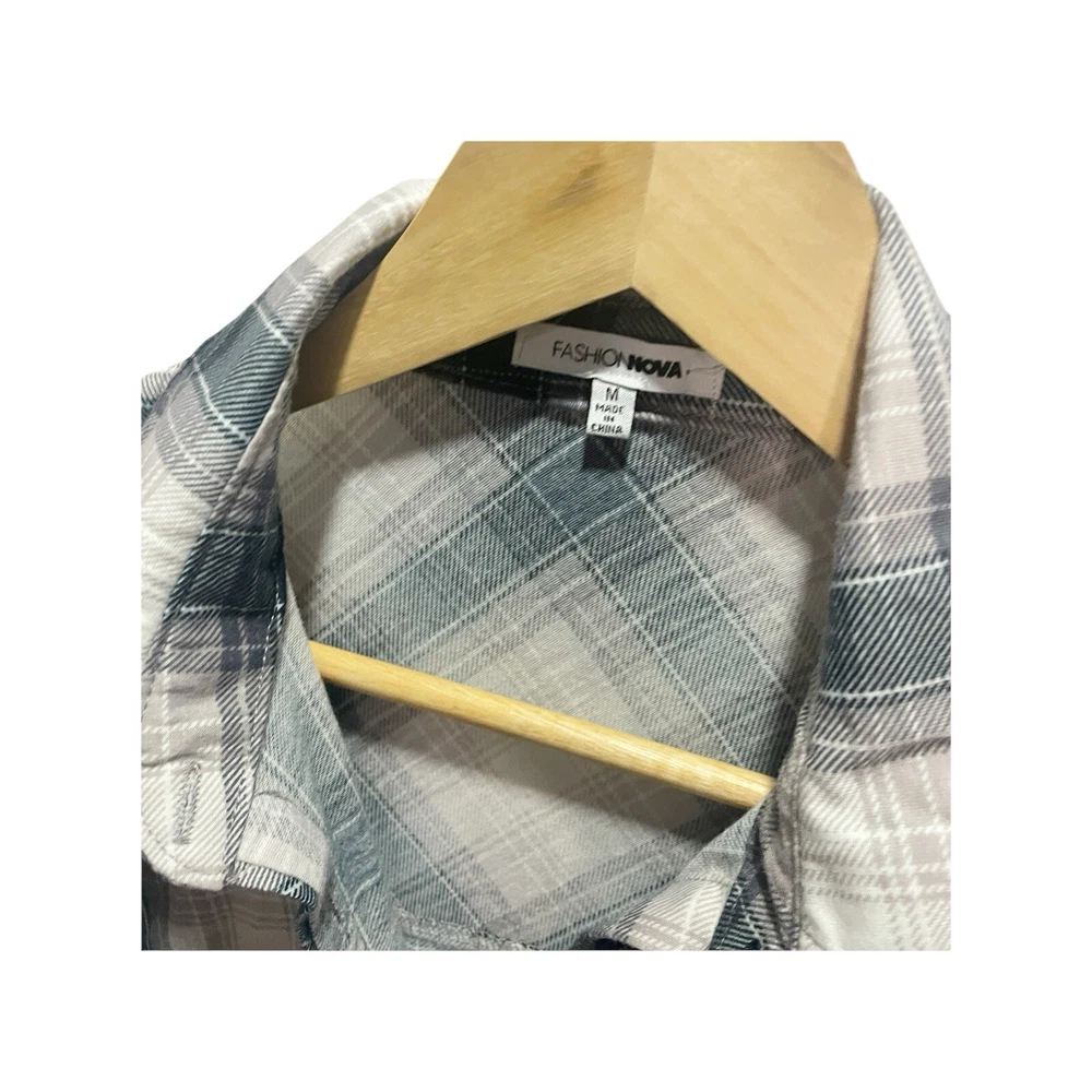 This Fashion Nova shirt is perfect for any occasion! With its blue, white, and gray plaid pattern and long sleeves, it's a stylish addition to any woman's wardrobe. The button-up design and collared neckline add a touch of sophistication, while the casual sleeve type and regular fit make it comfortable for all-day wear. The shirt is available in size M and is made for women. Its brand name is Fashion Nova, and the character it features is Nova. The shirt is perfect for those looking for a versatile and fashionable addition to their wardrobe. in very good condition length 22" chest width 17" All Measurements Are Approximate Please email us with any questions! ** LIKE THE ITEM BUT NOT THE PRICE, REASONABLE OFFERS ACCEPTED