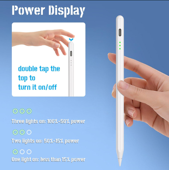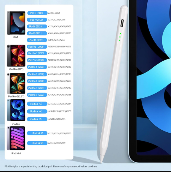 Pencil for iPad 2St Generation, Fast Charge Apple Pencil for Ipad 2018-2023, US Warehouse - FREE & FAST Shipping in US Product Description: 【Highly Responsive & Sensitive】 The stylus pen for iPad is designed to be as intuitive and responsive as a traditional pencil, allowing you to create, edit and navigate with ease. The stylus pen for iPad is equipped with a smart touch switch,press the cap button making it easy to turn on and off without disrupting your work. 【Palm Rejection& Magnetic Adsorption】 The iPad Pen has been engineered to provide palm rejection, so that it can detect when your hand is resting on the screen and will not detect any input from your palm or fingers, no need anti-friction gloves. The apple pencil also features magnetic adsorption, which allows it to attach securely to the side of your iPad for easy access and storage, prevent sliding and lost. 【Quick Charge & Power Display】 The apple Pen charges quickly via the type-C cable on your iPad fully in 15 minutes, and the power display on the pencil itself shows the remaining battery life, so you always know when it's time to recharge. After 10 minutes of standby, it will shuts off the power limited power saving. With up to 10 hours of use on a single charge, you can use the pencil throughout the day without having to worry about running out of battery. 【Compatibility】 The apple pencil 2nd generation is compatible with 2018-2023 iPad (10th, 9th, 8th, 7th, 6th generation); iPad Pro 11 inch (4th, 3rd, 2nd, 1st generation); iPad Pro 12.9 inch (6th, 5th, 4th, 3rd generation);iPad mini (6th, 5th generation); iPad Air (5th, 4th, 3rd generation). Our stylus pencil is designed to work seamlessly with iPadOS, allowing you to take full advantage of the drawing and note-taking features. 【Versatile Use】 The iPad Pencil is not just for artists and designers. The low latency and high precision make it an ideal iPad accessories for anyone. It can be used for a variety of tasks, such as sketching, taking notes, coloring, and marking up documents, even the game. ipad with pen will better enhance the sense of use and improve the efficiency of work and life. Feedback: 1.Any question for your order, please contact us in time, we will reply to you within 24 hours and give you a satisfactory answer. 2.If you are satisfied with our products and services, hope to take up your a little precious time to leave feedback reviews for our products.Thanks! 3.Your satisfaction is our effort. Welcome to order again! Have a great day! Our Policy: 100% Satisfaction Guarantee 20% of restocking fee will be charged for return item
