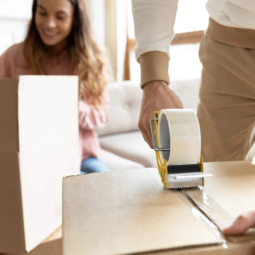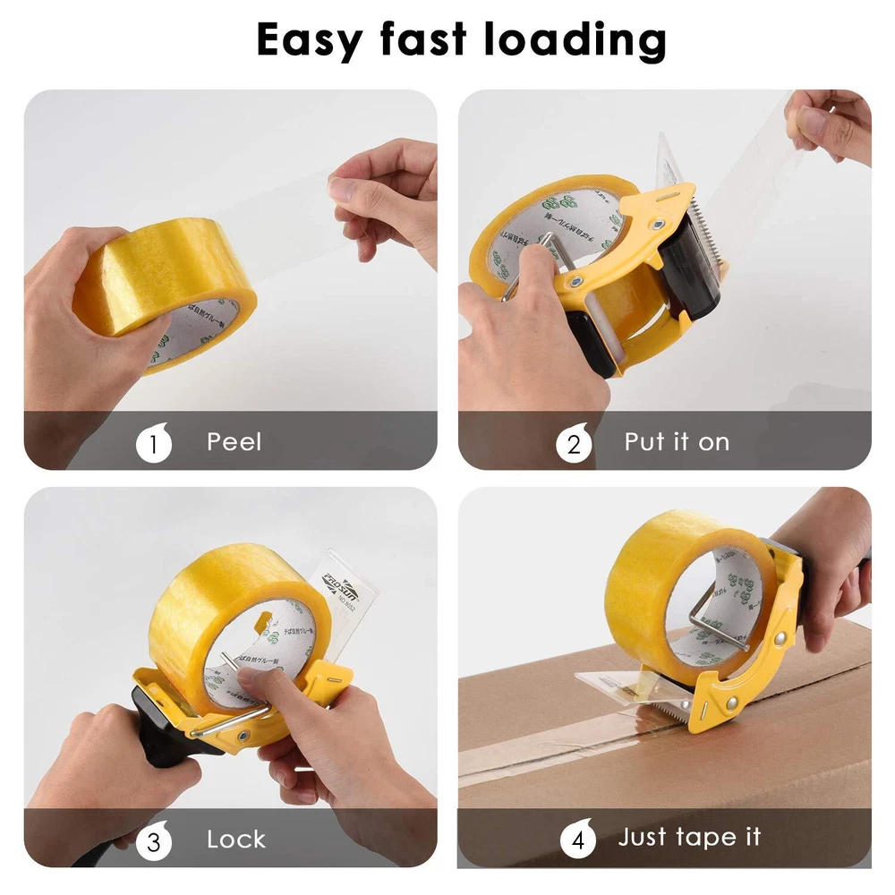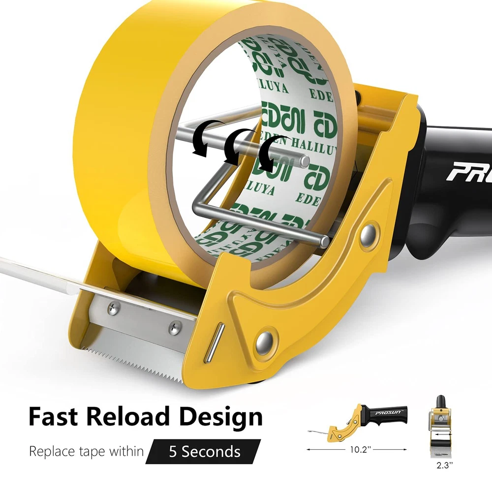 ★Adaptive: Fits 2 inch wide tape, regular or thick tape, tape is NOT included ★Fast: Fast reload design helps you work efficiently ★Smooth: TWO ROLLERS design, keep the supply SMOOTH even when the tape is running low ★Extra Blade: One extra replacing blade is included, sharp and durable stainless steel blade ★Comfortable: Ergonomic design shape make your work comfortable
